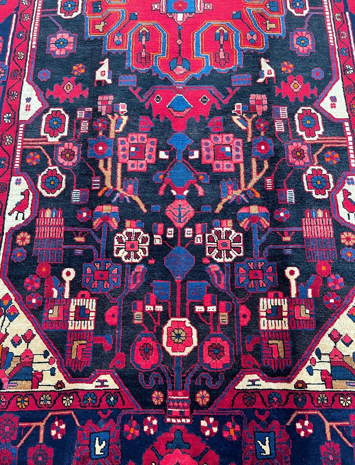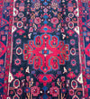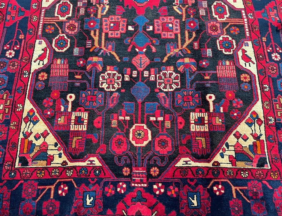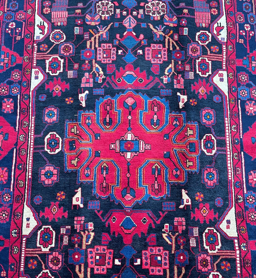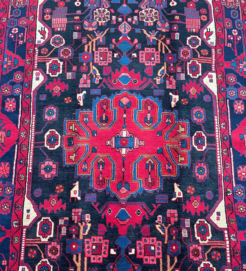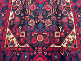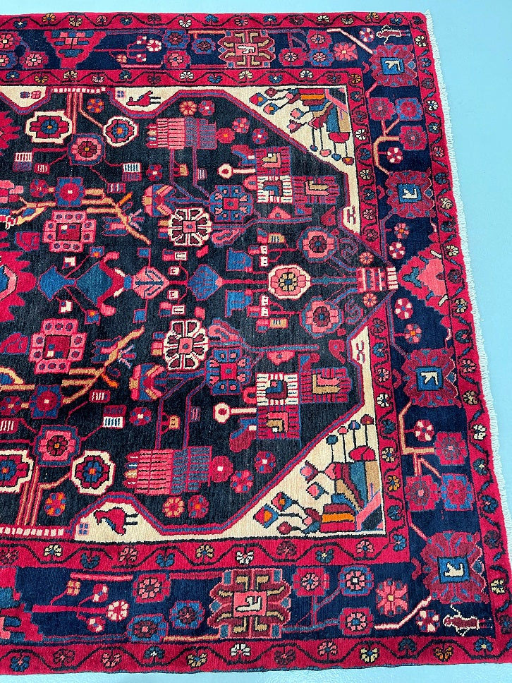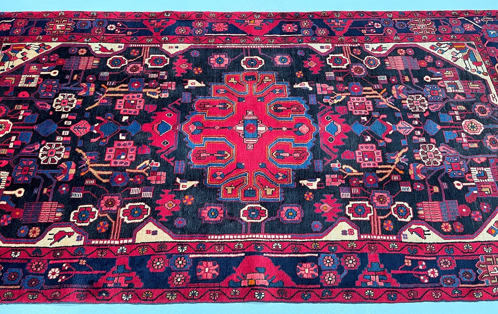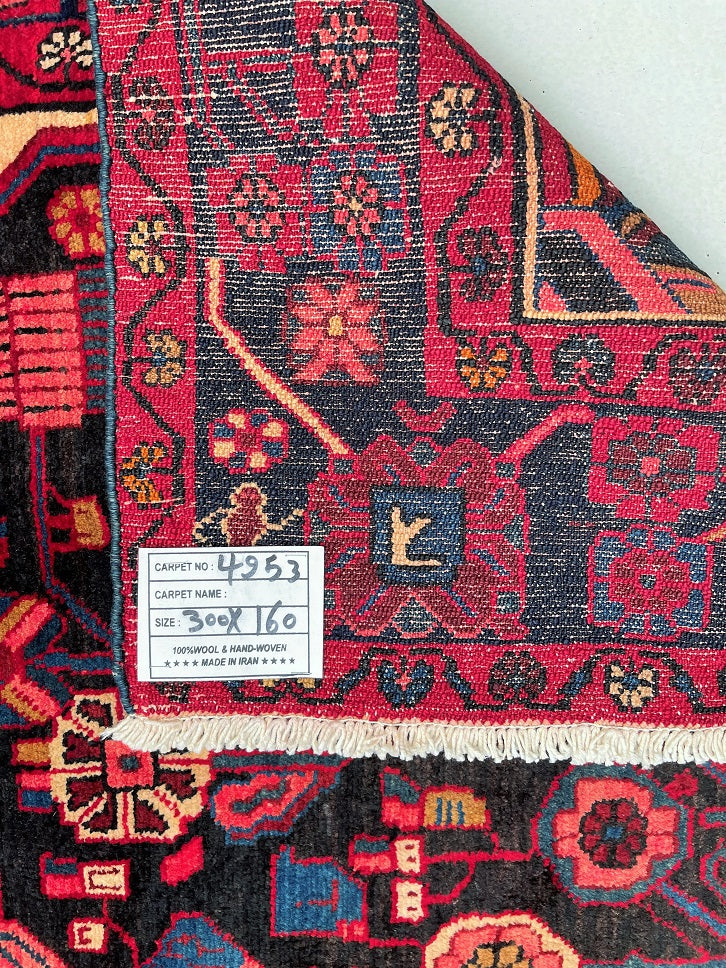 Full Room Size Handmade Vintage Persian Nahavand Rug, a true gem for any space. This rug stands out for its rarity as it is challenging to find tribal design originals in larger sizes. Crafted with a pure hand-spun wool pile on a cotton base, it offers both quality and comfort. The deep indigo blue tone, achieved through traditional dyeing methods, adds a touch of richness to the rug. Its central medallion features a beautiful floral design with a vase, adding an elegant touch to the overall aesthetic. It is worth noting that this piece required approximately 6 months of dedicated weaving by a skilled weaver. Hand-woven in the village of Nahavand, Central West Persia, this rug measures 300 x 160 cm and holds a gallery replacement value of $4900.