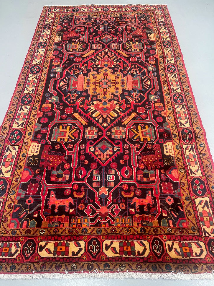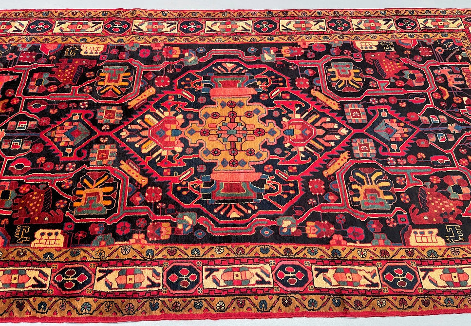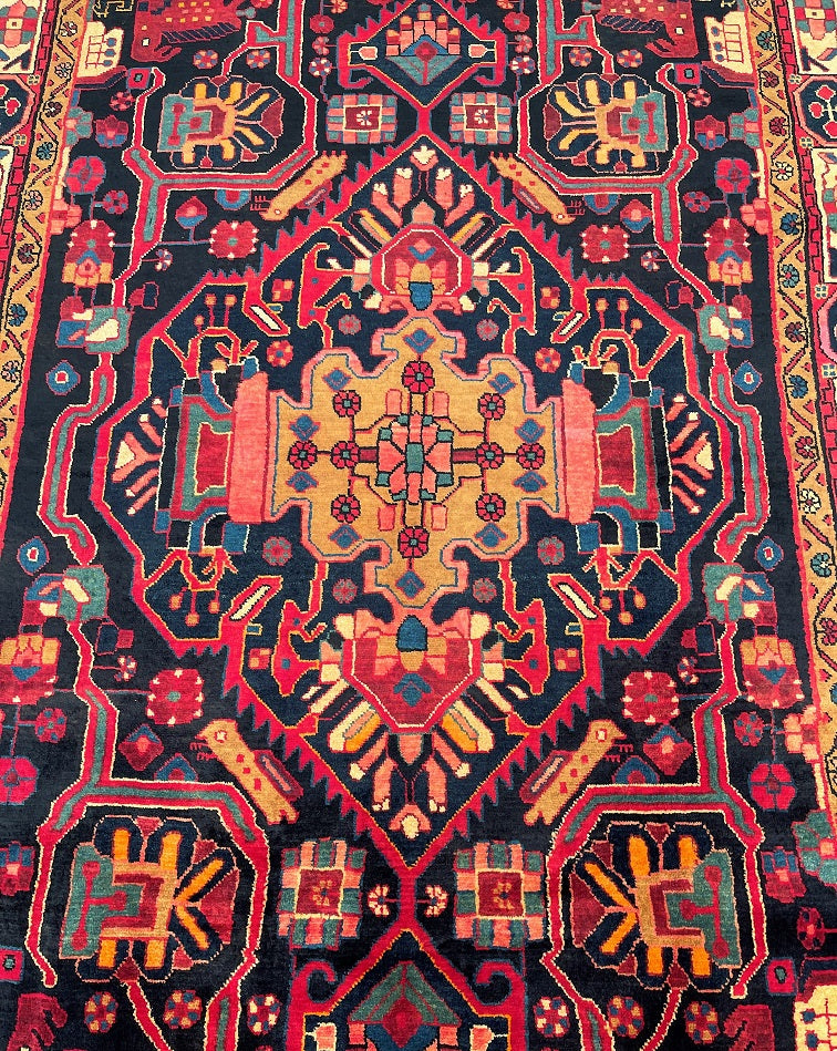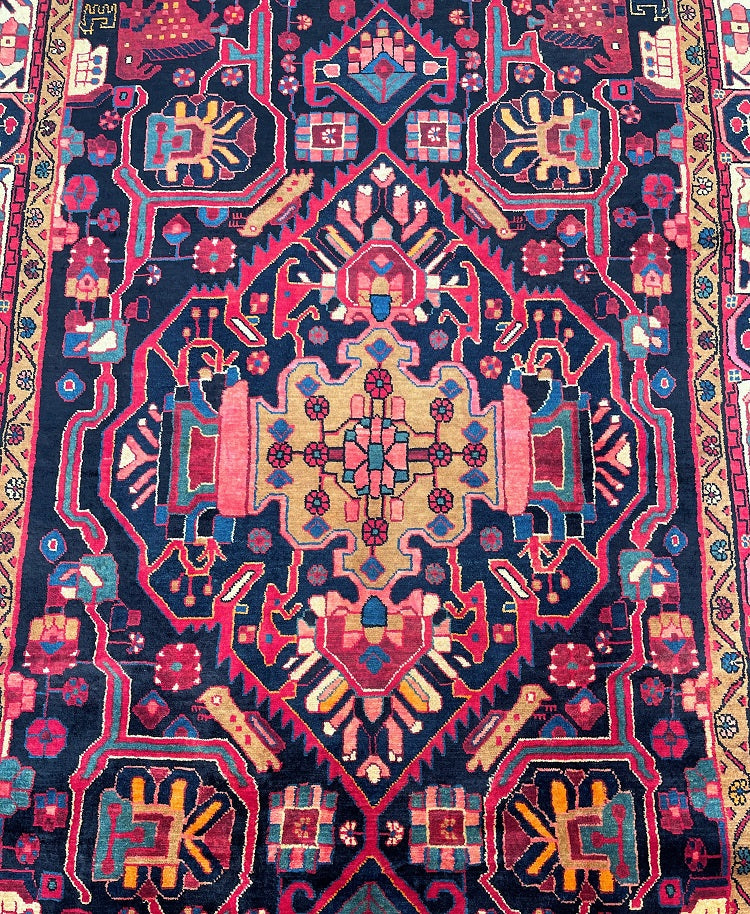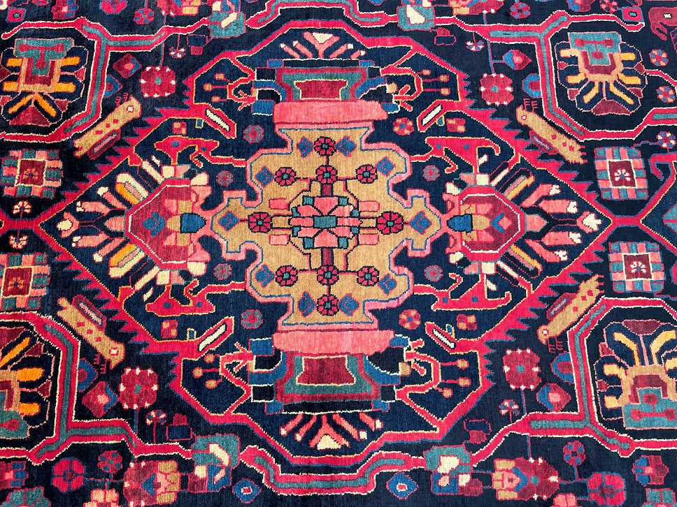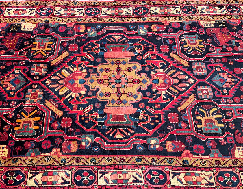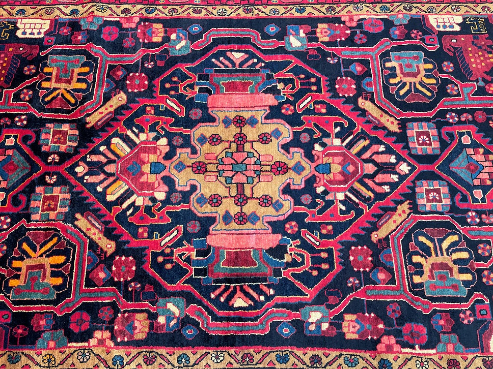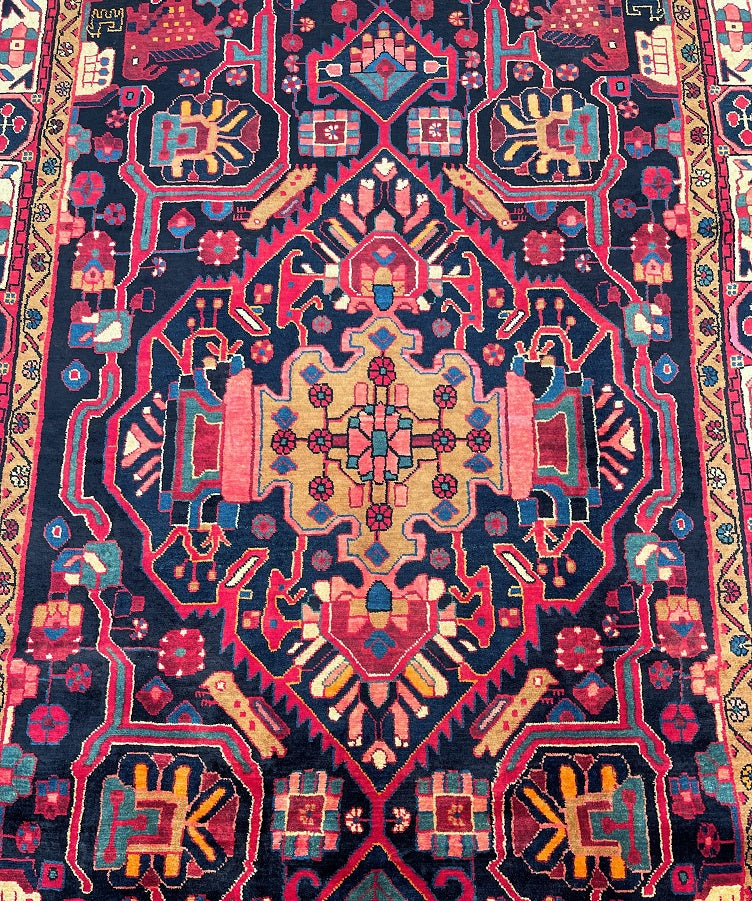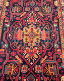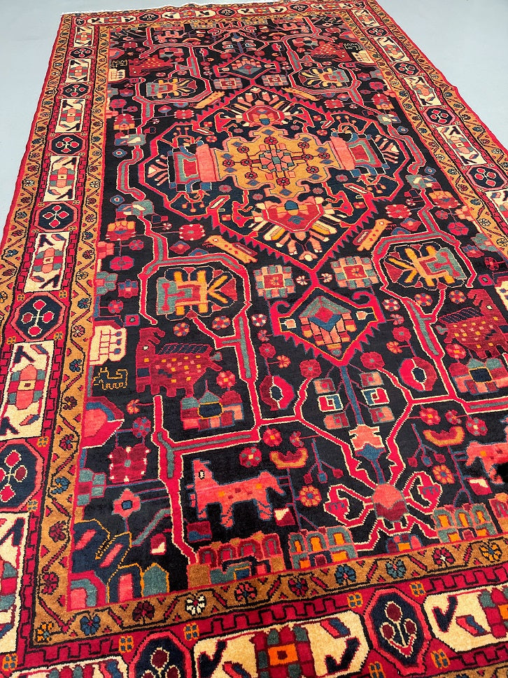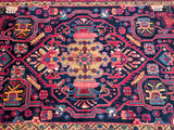 Full Room Size Hand Knotted Vintage Persian Tuserkan Rug. Above All It Can Also Be Used As A Wide Corridor Piece Or A Room Size Rug. It Also Has A Pure Hand Spun Wool Pile On Cotton Base. Deep Indigo Blue/Black, Orange, Mustard, Beige, Pink And Red Tone Dyed Using Traditional Methods.
