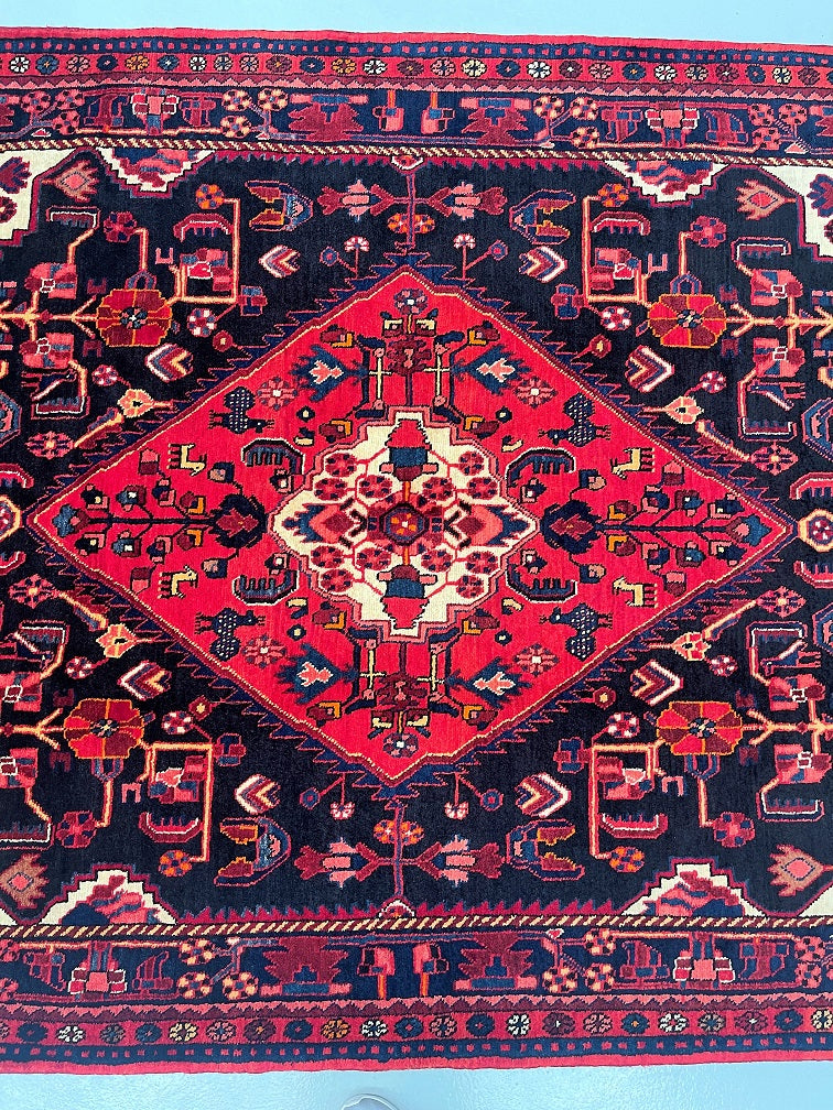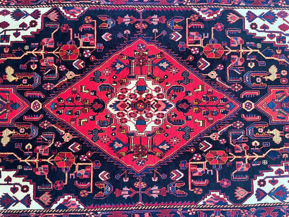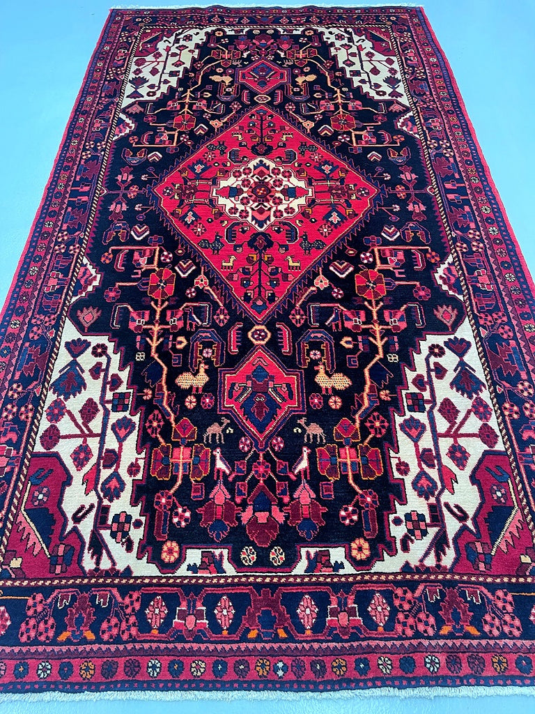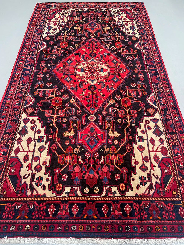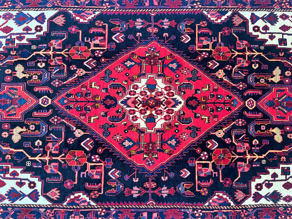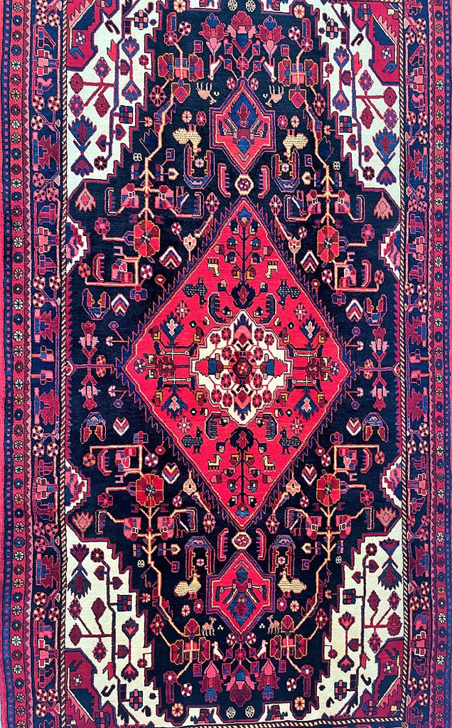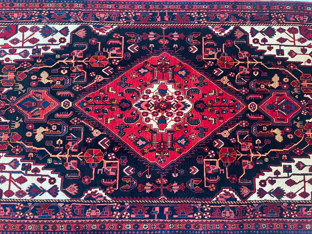 Full Room Size Authentic Hand Knotted Vintage Persian Tuserkan Rug. Above All It Is Hard To Find This Quality Original Handmade Tribal Pieces. Pure Hand Spun Wool Pile On Cotton Base. It Also Has A Deep Indigo Blue/Black, Beige, Brown, Red, Orange, Blue And Pink Tone Dyed Using Traditional Methods.