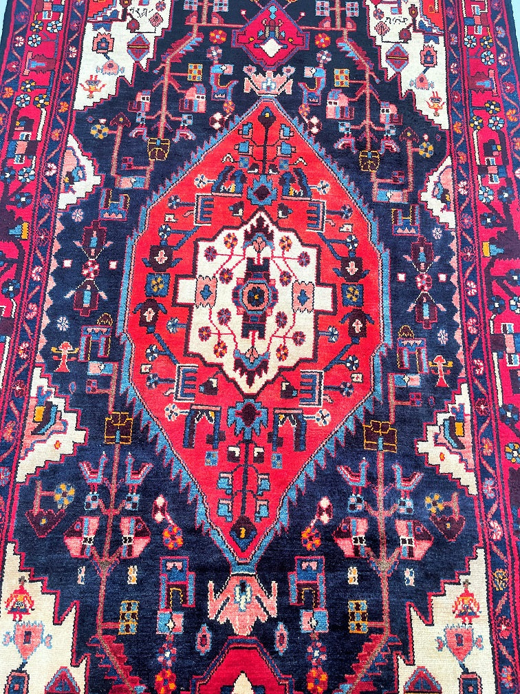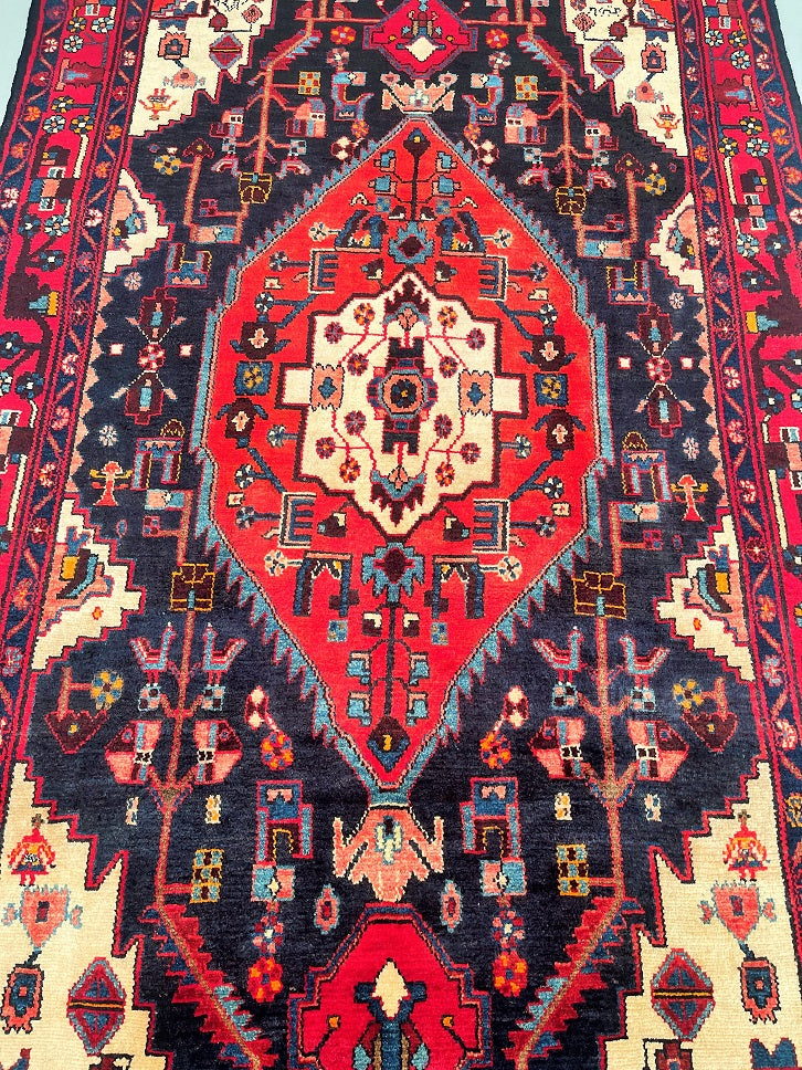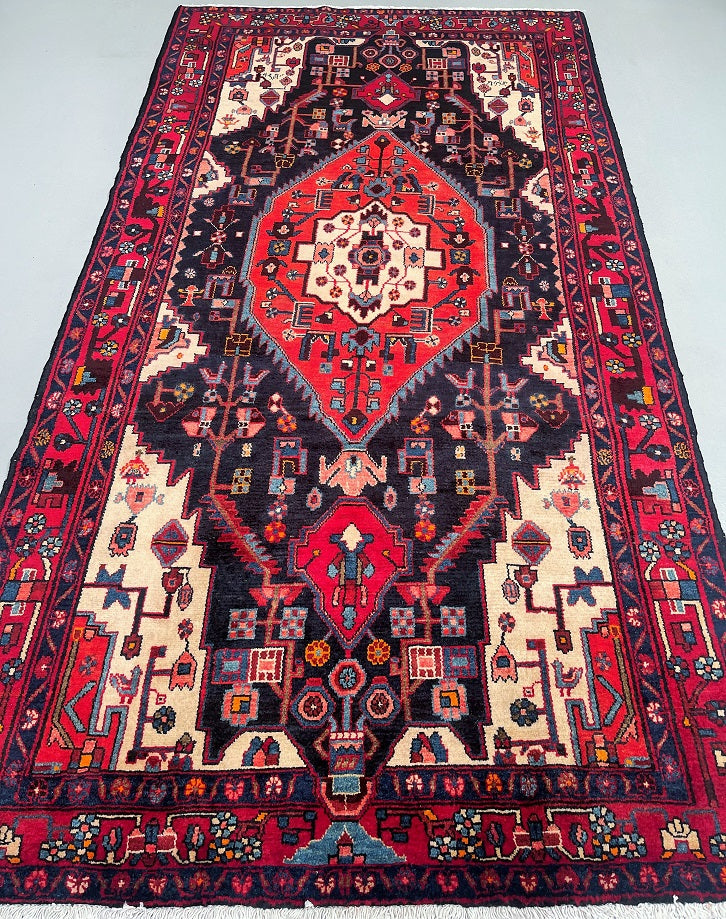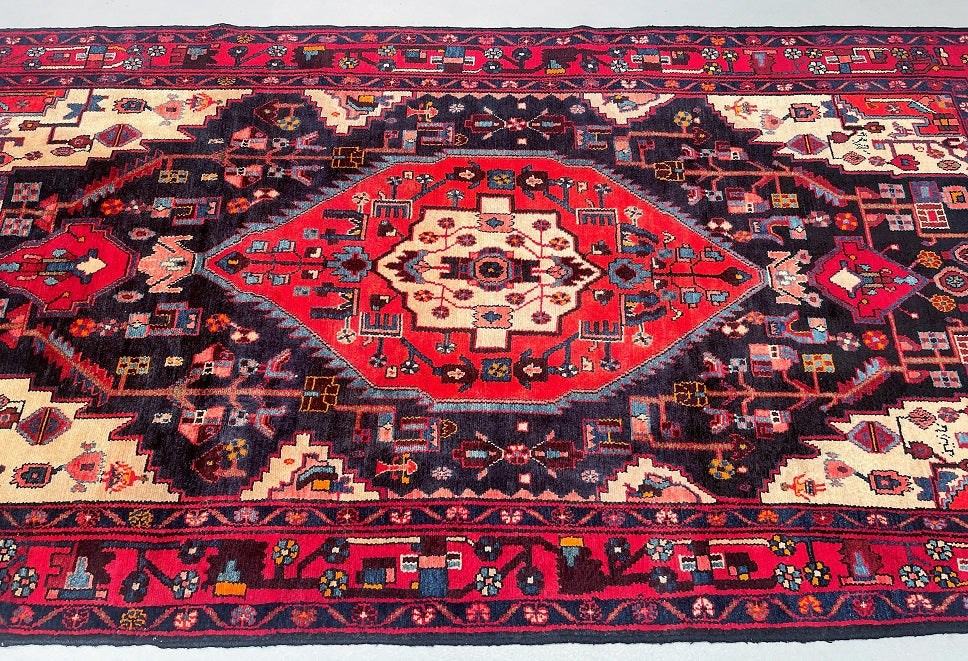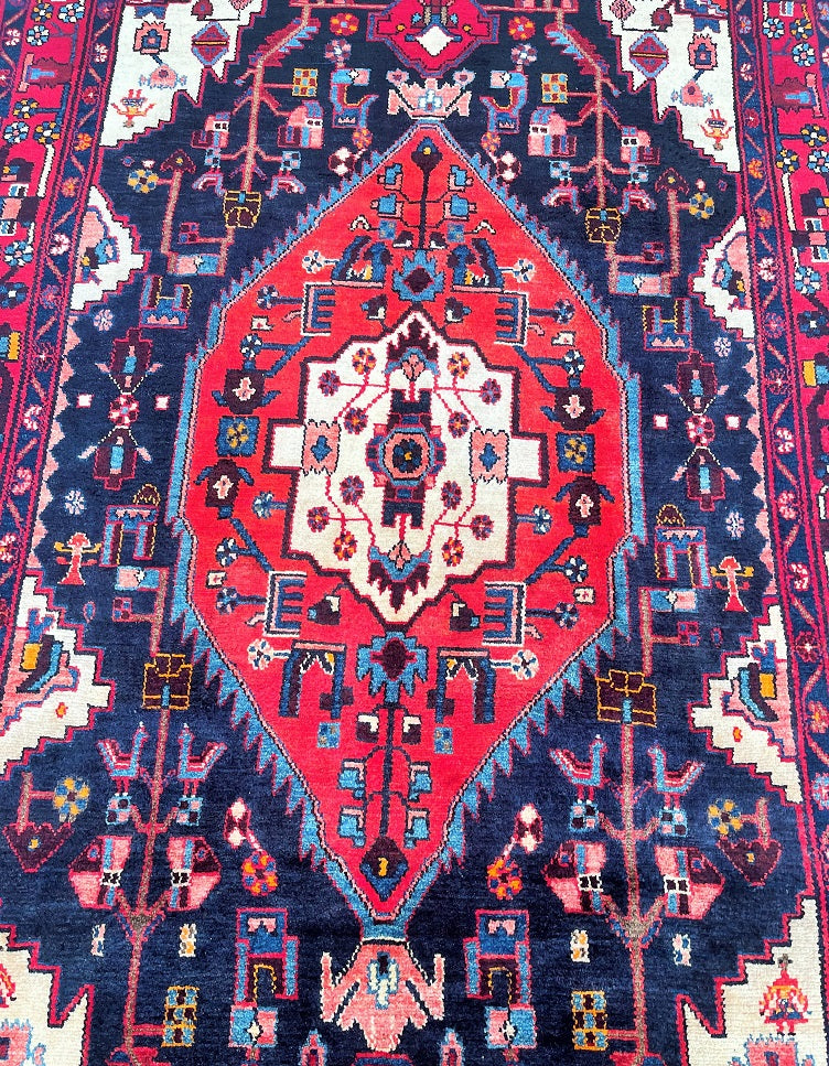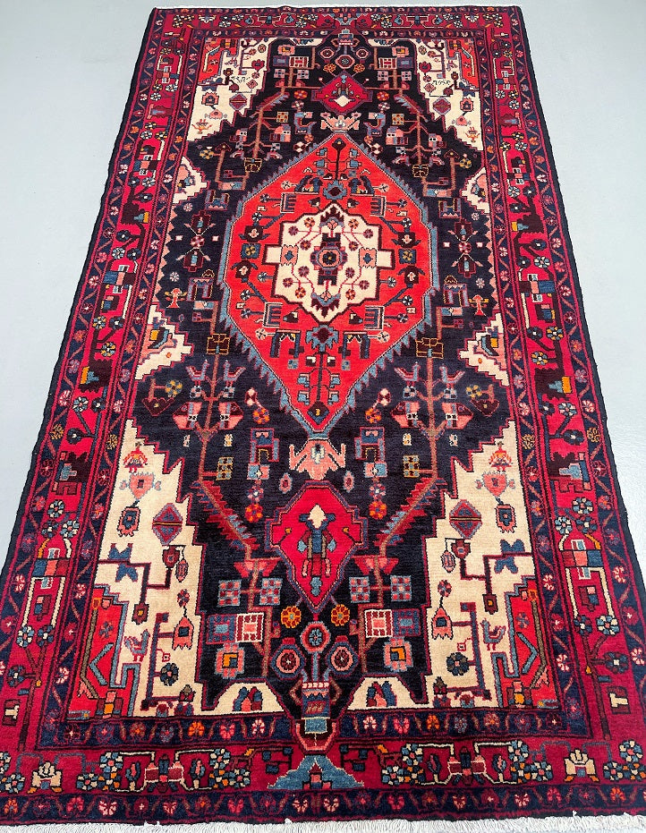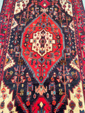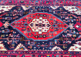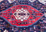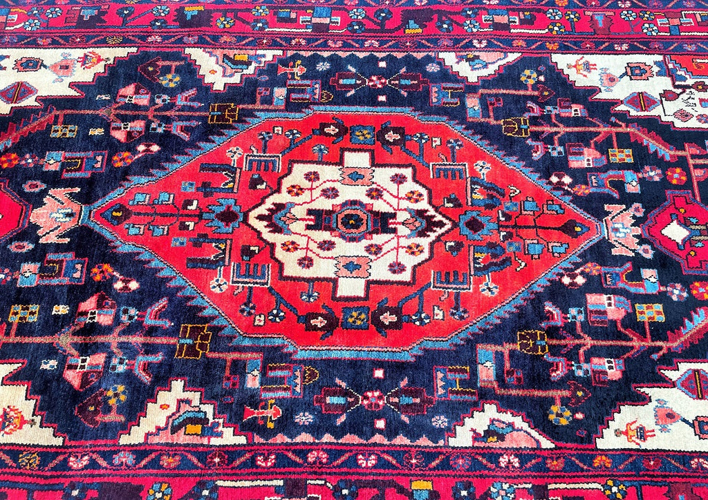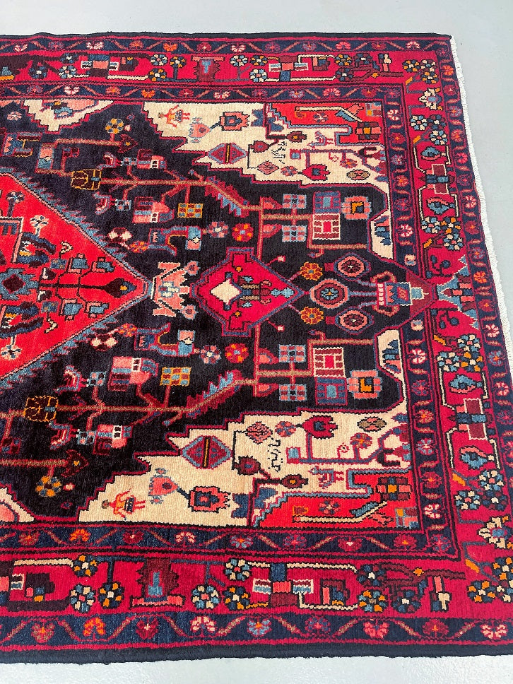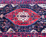 Full Room Size Authentic Hand Knotted Vintage Persian Tuserkan Rug. Above All It Is Hard To Find This Quality Original Handmade Tribal Pieces. Pure Hand Spun Wool Pile On Cotton Base. It Also Has An Indigo Blue/Black, Beige, Brown, Red, Yellow, Blue And Pink Tone Dyed Using Traditional Methods.