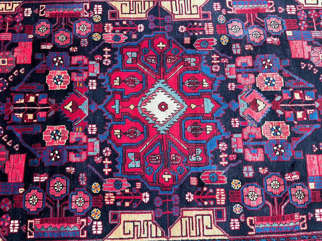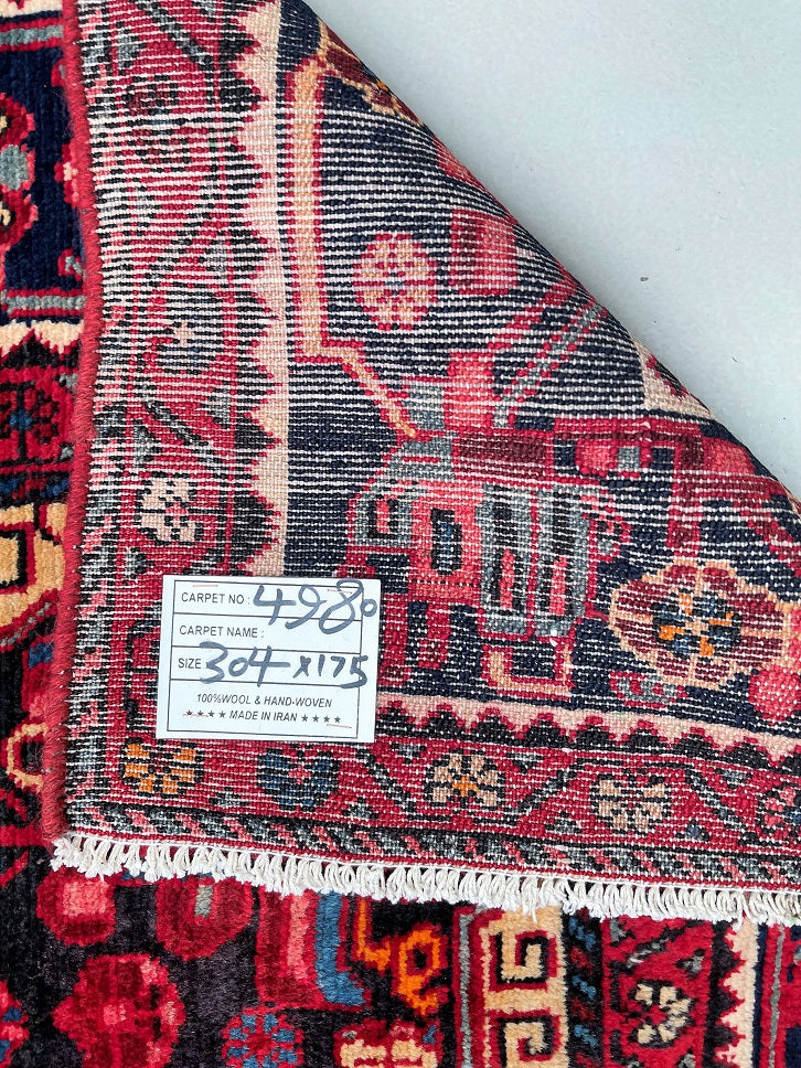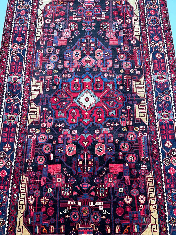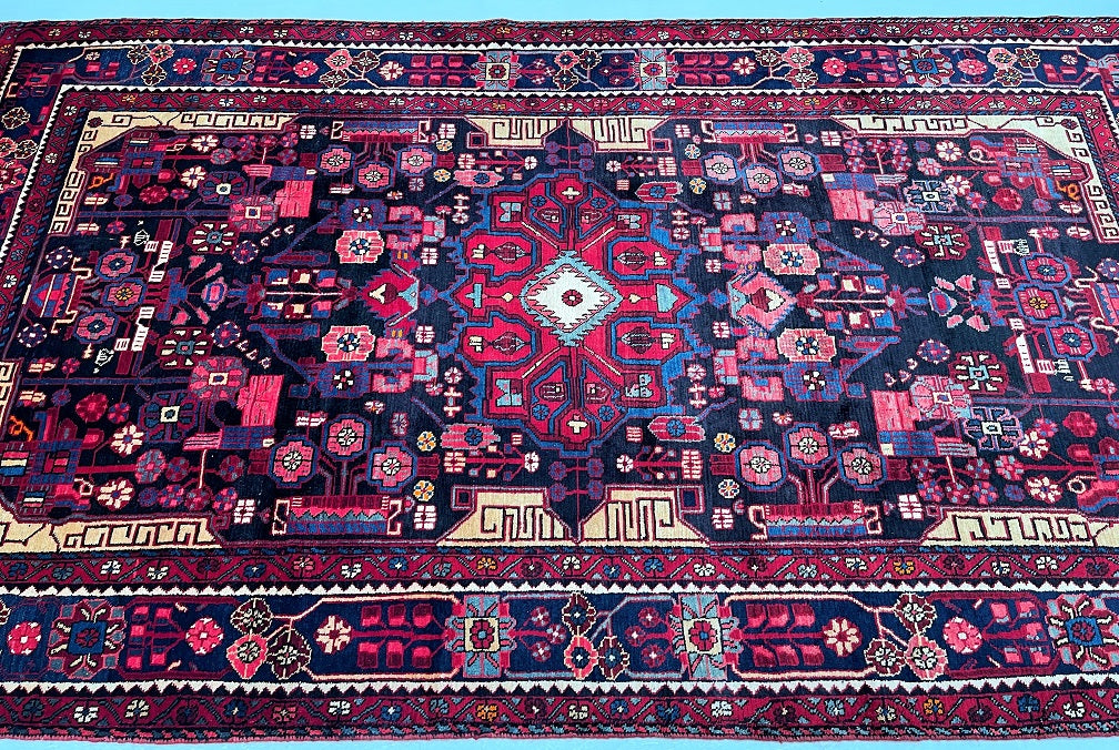 Full Room Size Authentic Handmade Vintage Persian Nahavand Rug, a true treasure that is not easily found in larger sizes, especially with tribal designs. This exceptional rug features a pure hand-spun wool pile on a durable cotton base, ensuring both comfort and longevity. Its captivating color palette includes indigo blue, red, beige with a hint of mustard, brown, and pink tones, all dyed using traditional methods. The rug showcases a unique broken branches floral design with vase motifs, adding a touch of elegance to any space. The creation of this masterpiece required the dedicated efforts of a skilled weaver, who spent approximately 9 months weaving this piece. Hand-woven in the village of Nahavand, located in central west Persia, this rug measures 304 x 175 cm and holds a gallery replacement value of $4900.