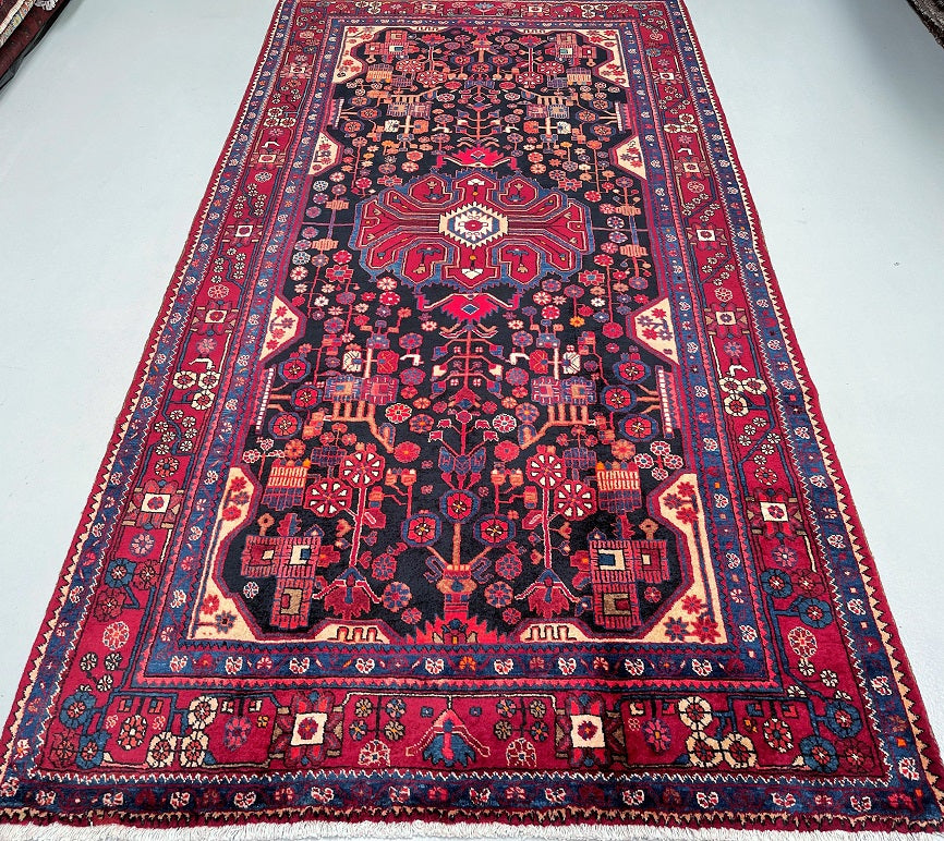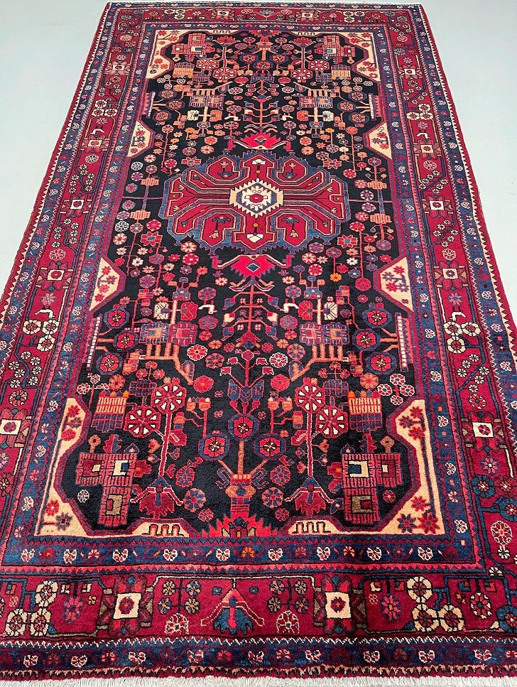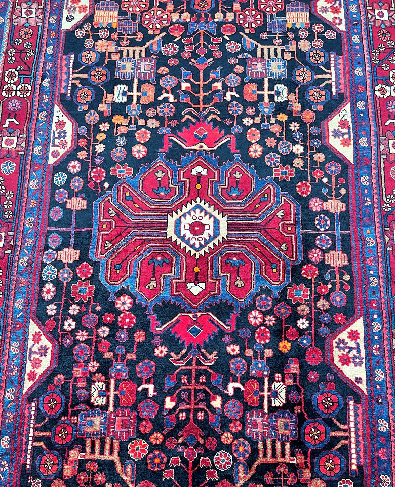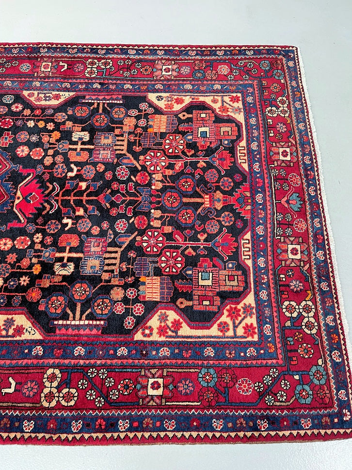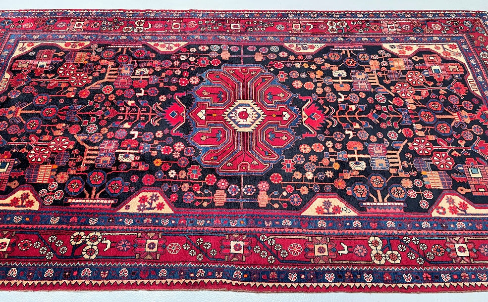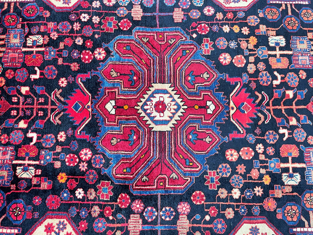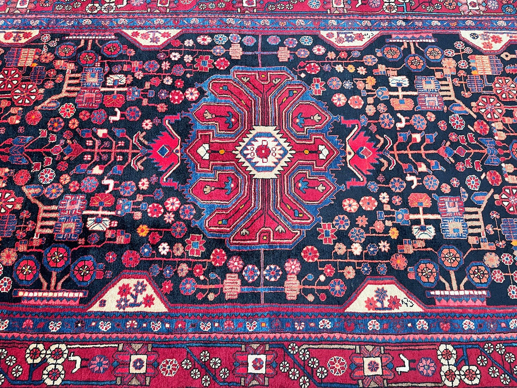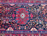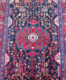 Full Room Size Authentic Handmade Tribal Persian Nahavand Rug. Above All It Is Hard To Find Tribal Design Handmade In Larger Sizes. Pure Hand Spun Wool Pile On Cotton Base. It Also Has a Deep Indigo Blue Tone Dyed Using Traditional Methods.