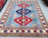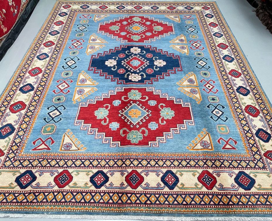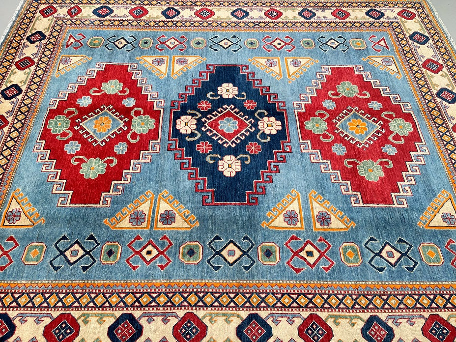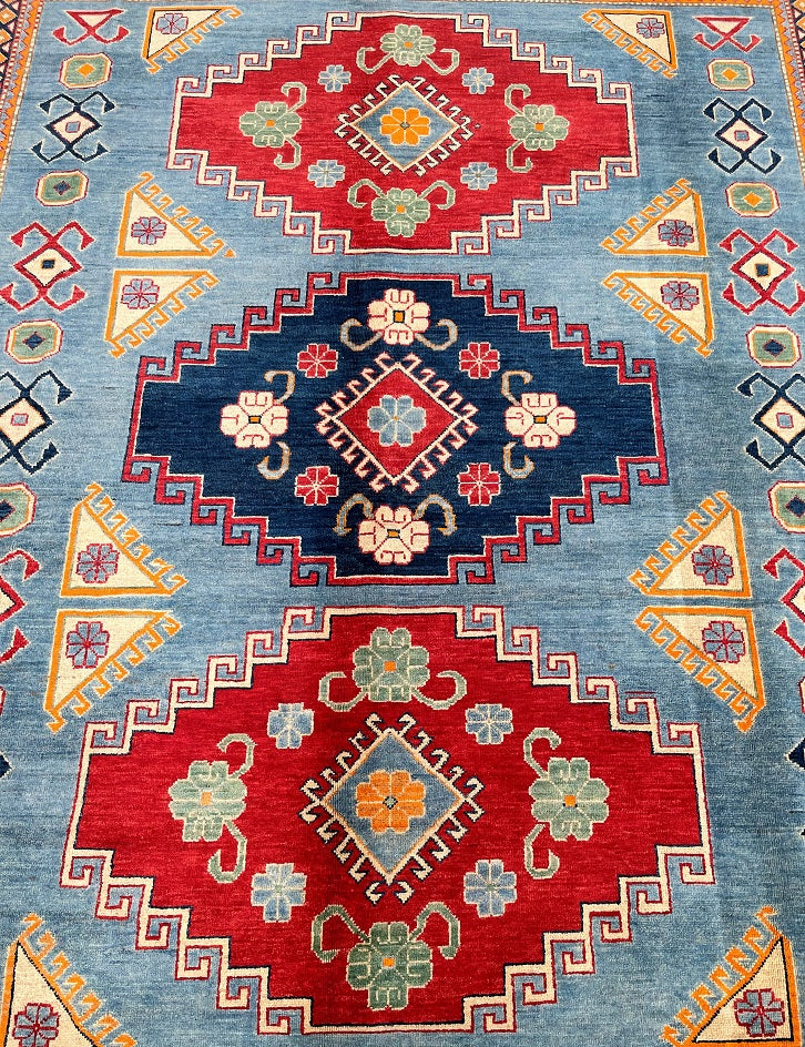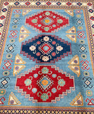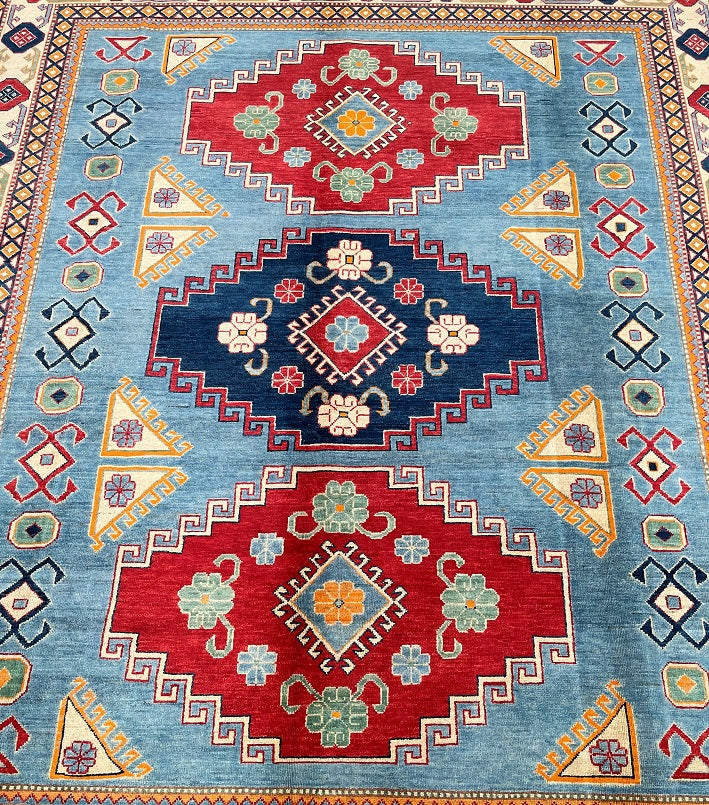 Decorative Large Room Size Handmade Afghan Kazak rug. Above All It Is Pure Hand Spun Wool Pile On Cotton Base. Gorgeous French Blue Background Dyed Using Traditional Methods (Vegetable Dyes). Last Of True Woven Tribal Art.