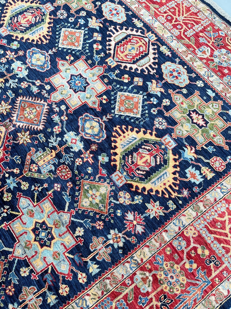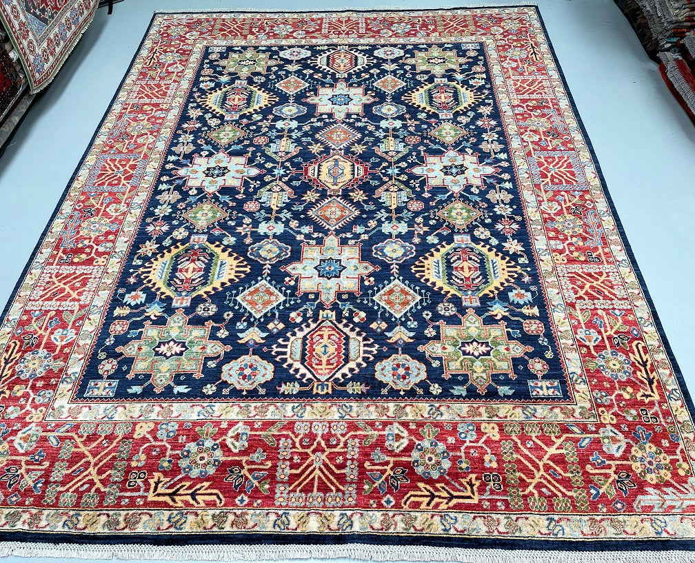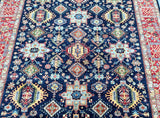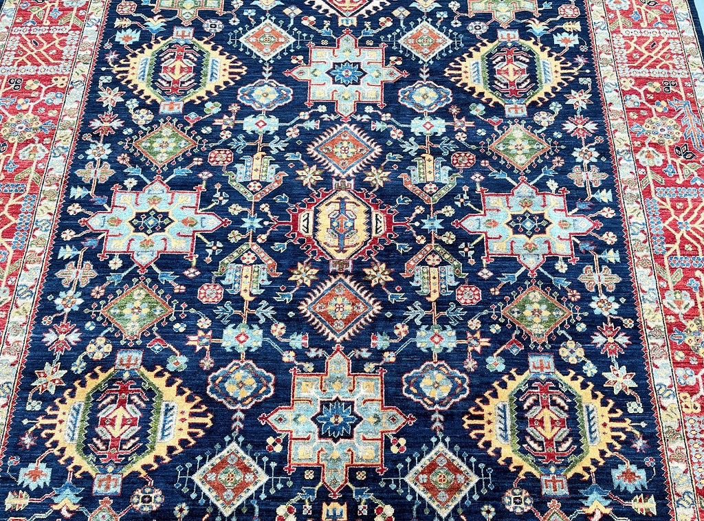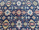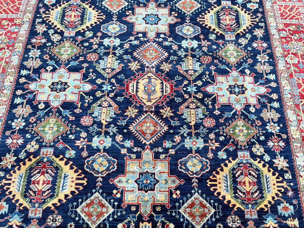 Decorative Large Room Size Authentic Handmade Super Kazak Rug. It Has a Pure Hand Spun Wool Pile On Cotton Base. Classic Blue, Beige, Red And Green Tone Dyed Using Traditional Methods (Vegetable Dyes). Last Of True Woven Tribal Art.
