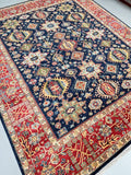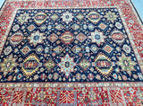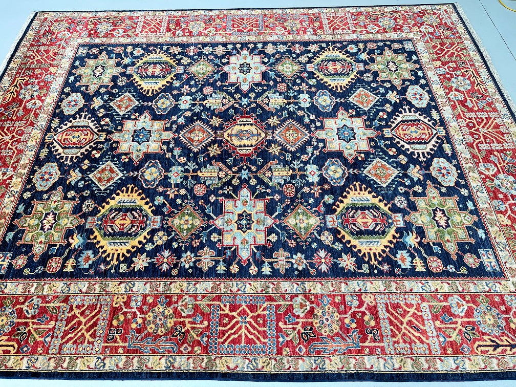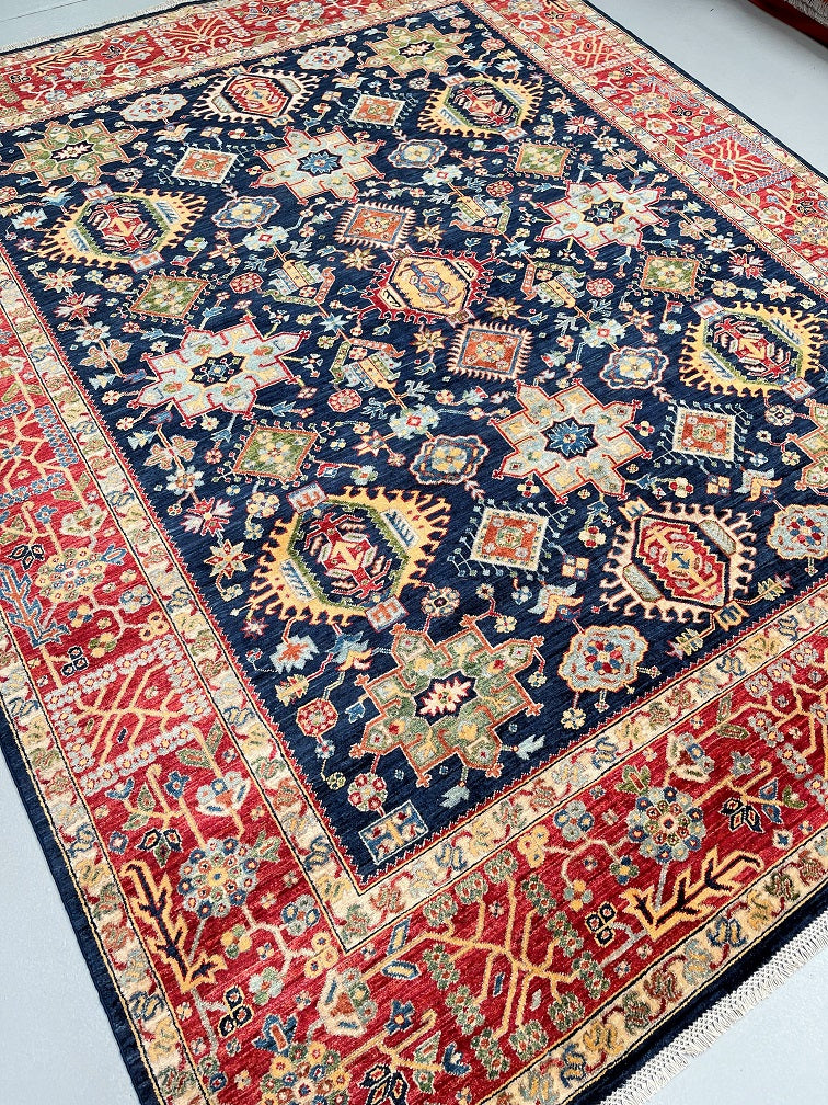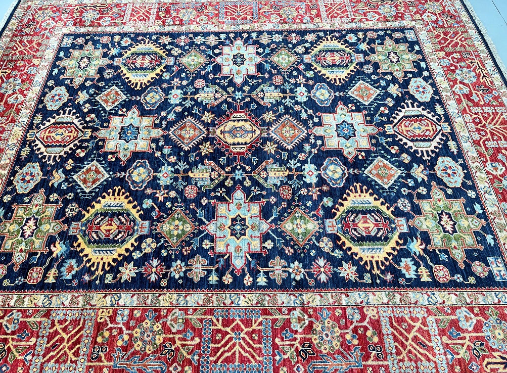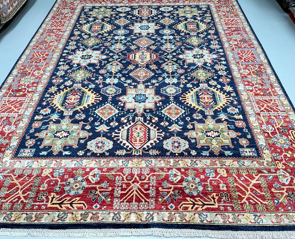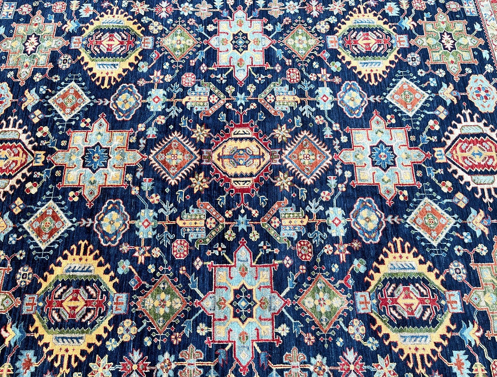 Decorative Large Room Size Authentic Handmade Super Kazak Rug. It Has a Pure Hand Spun Wool Pile On Cotton Base. Classic Blue, Beige, Red And Green Tone Dyed Using Traditional Methods (Vegetable Dyes). Last Of True Woven Tribal Art.