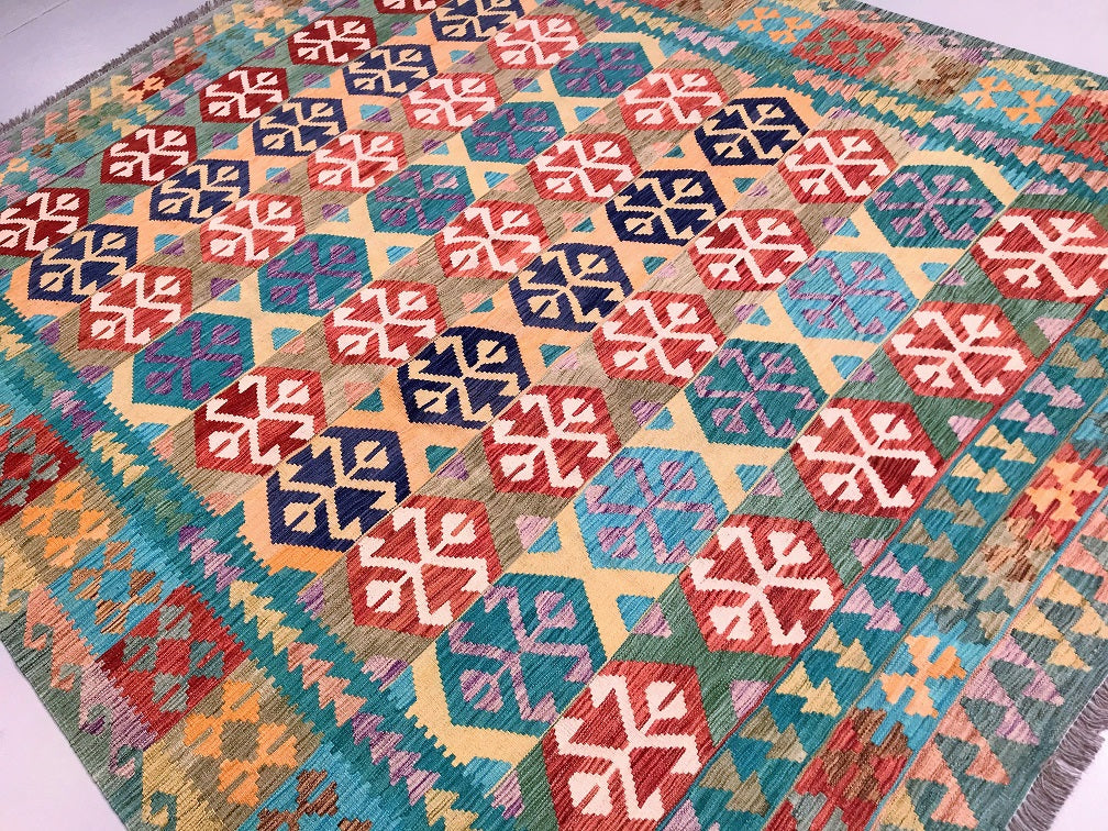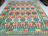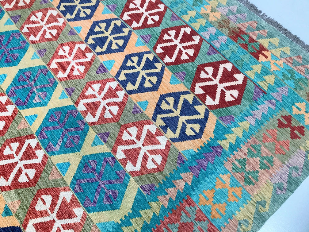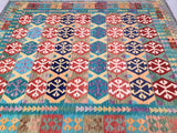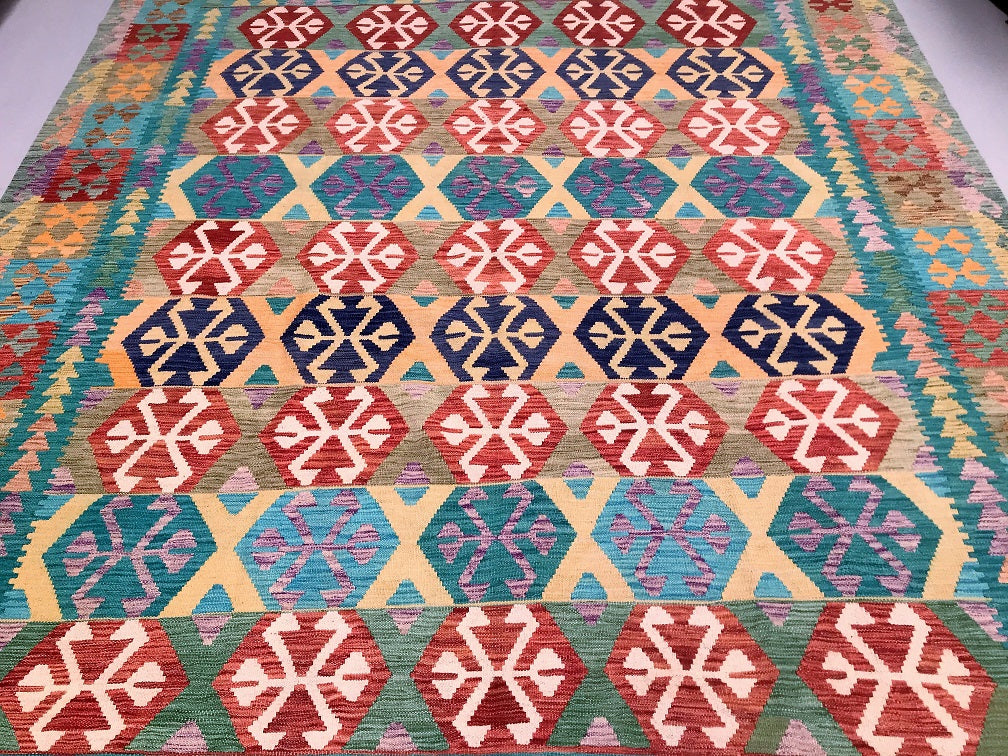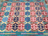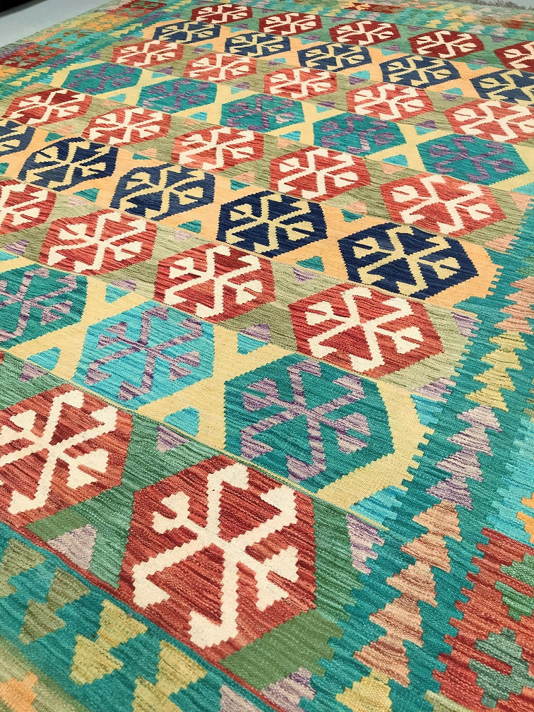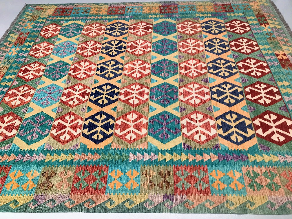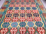 Large Room Size Bohemian Design Hand Woven Afghan Kyber Kilim Rug. Above All It Is Reversible. It Also Has A Pure Hand Spun Wool Pile On Wool Base. Vibrant Tone Dyed Using Vegetable Dyes.