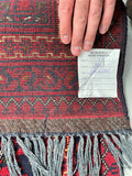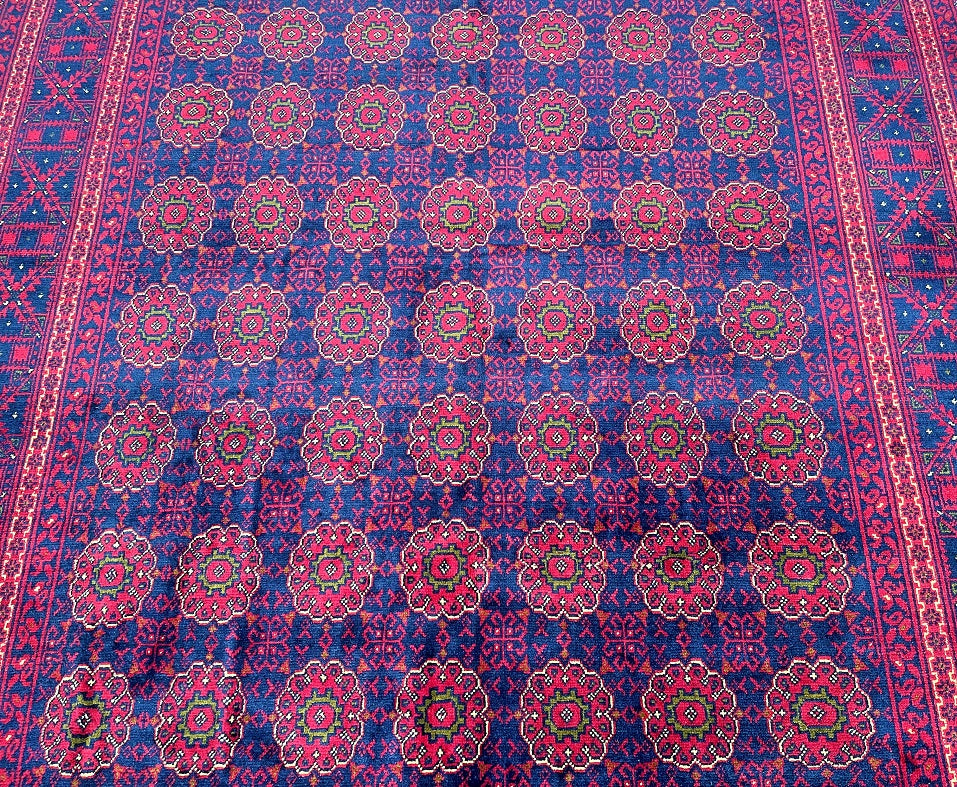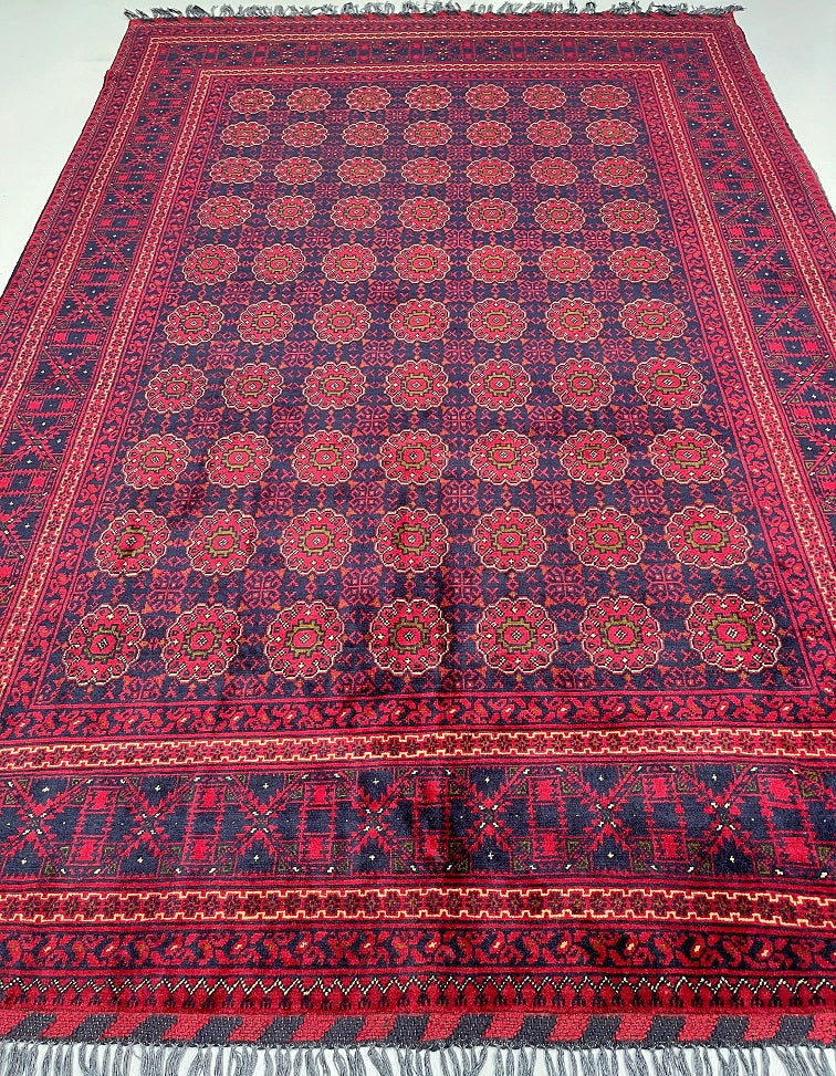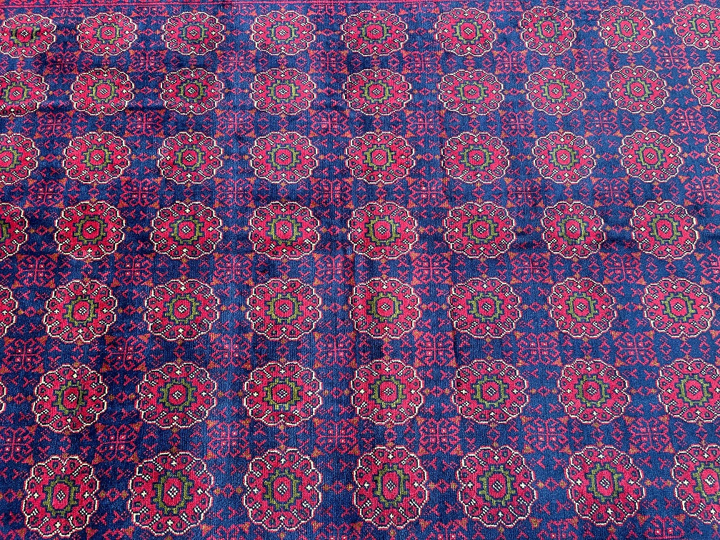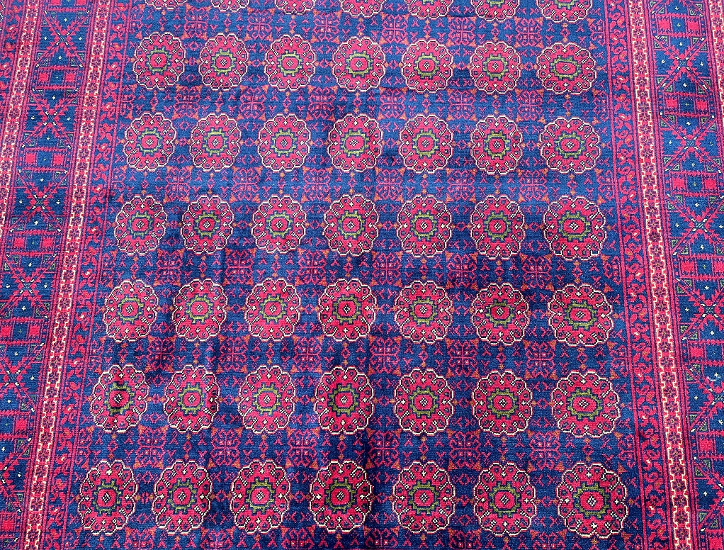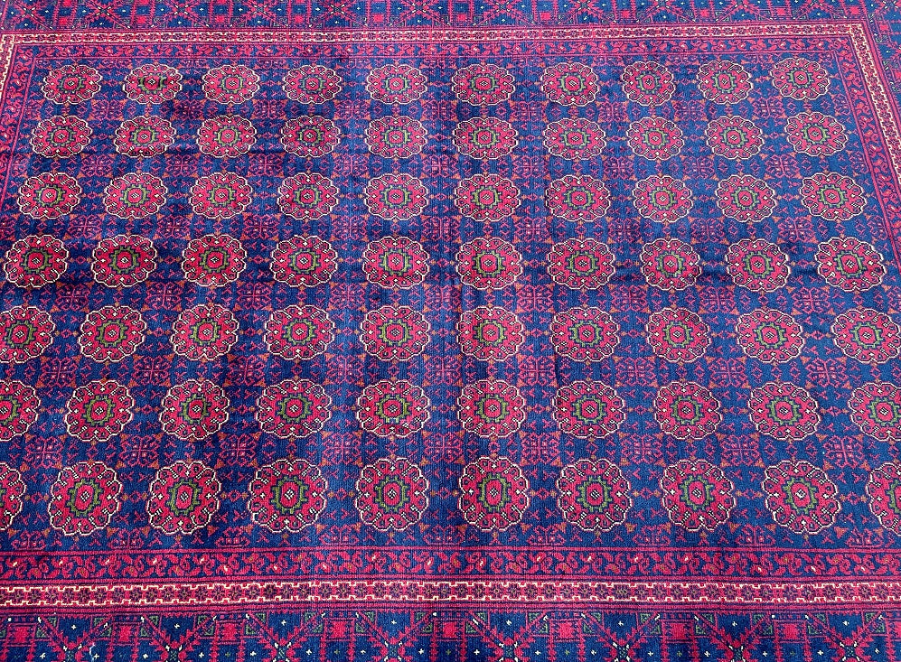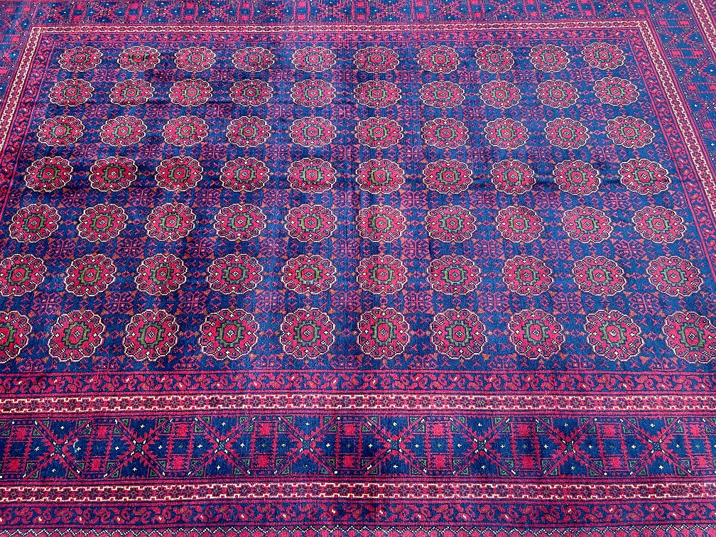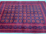 Full Room Size Genuine Handmade Afghan Kunduzi Rug. Above All It Has A Pure Hand Spun Wool Pile On Wool Base. It Also Has A Deep Indigo Blue, Maroon And Touch Of Green And Beige Tone Dyed Using Traditional Methods.