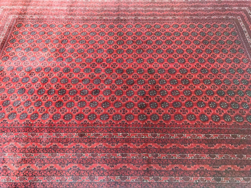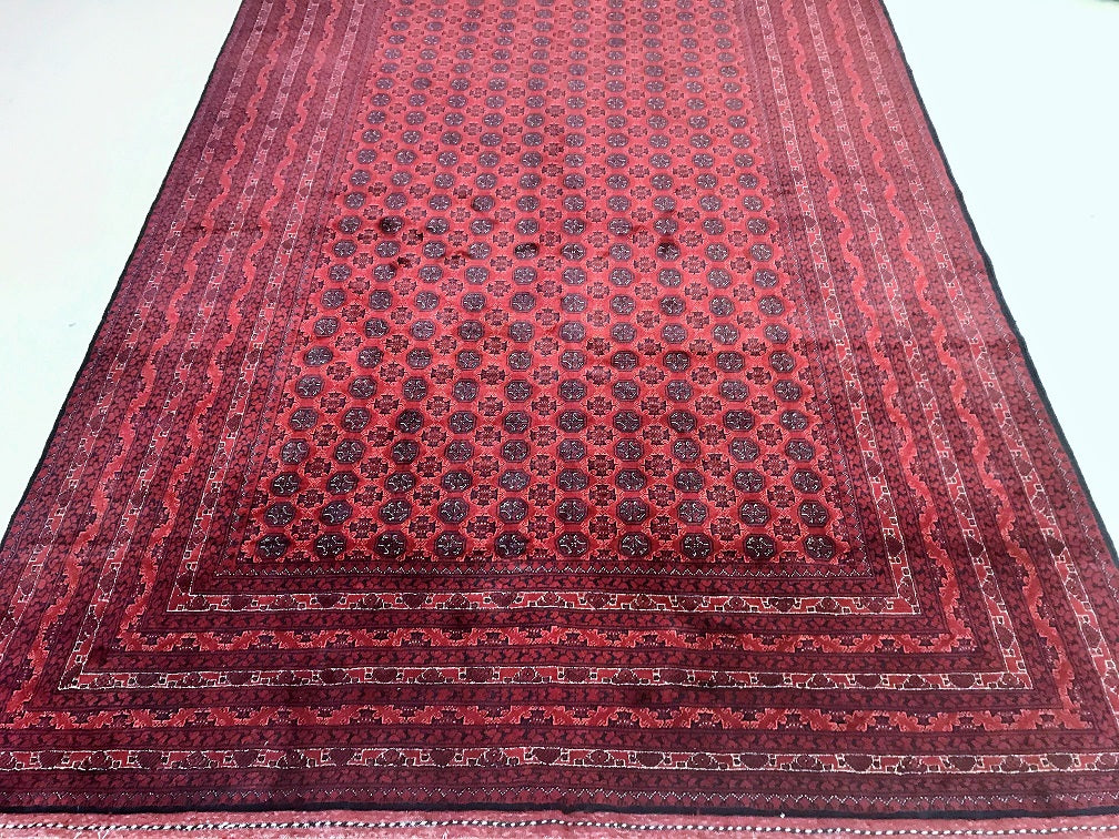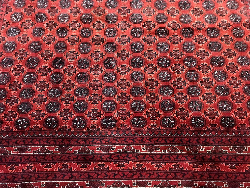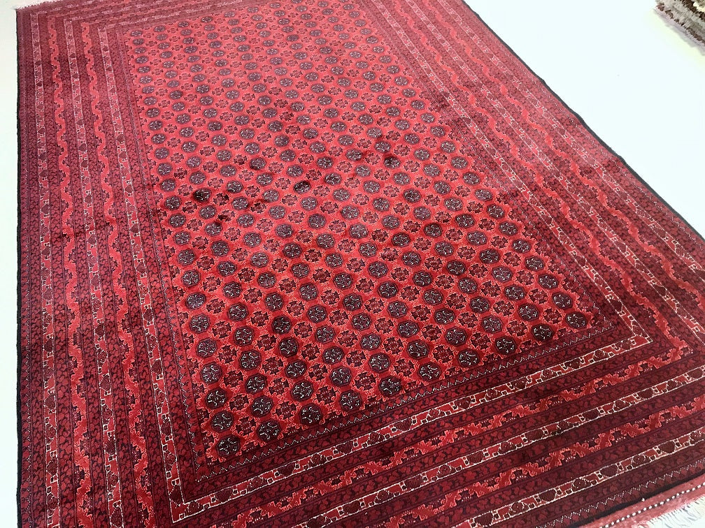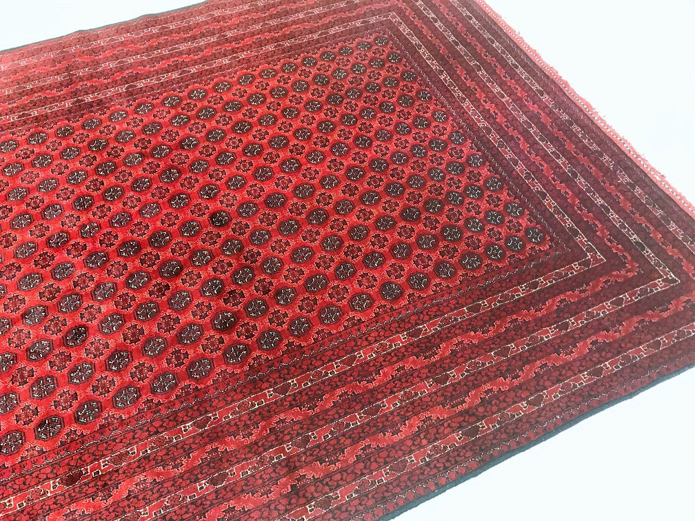 Full Room Size Hand Knotted Afghan Muri Gul Rug. Above All It Has A Merino Wool Pile On Fine Cotton Base. It Also Has A Stunning Deep Burgundy Tone Dyed Using Traditional Methods.