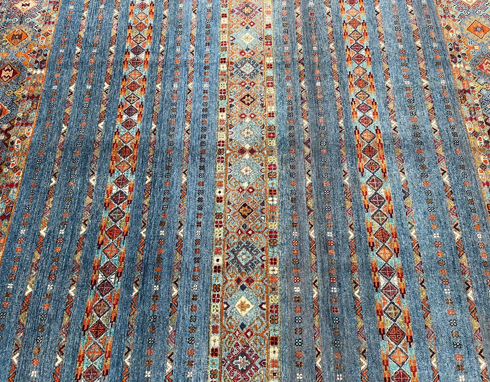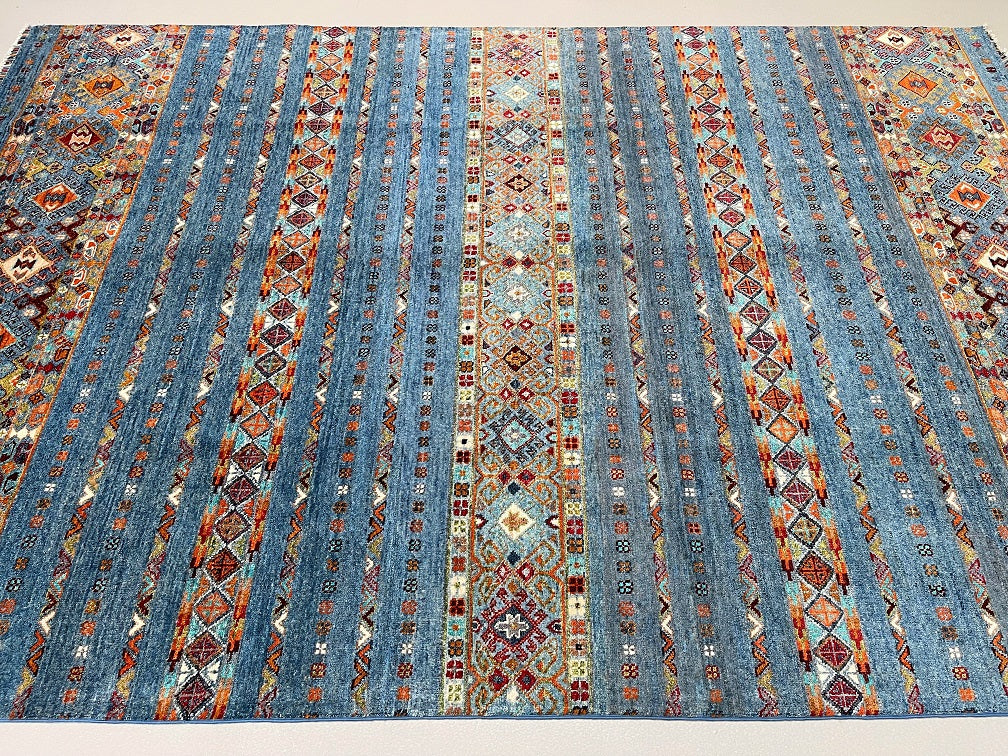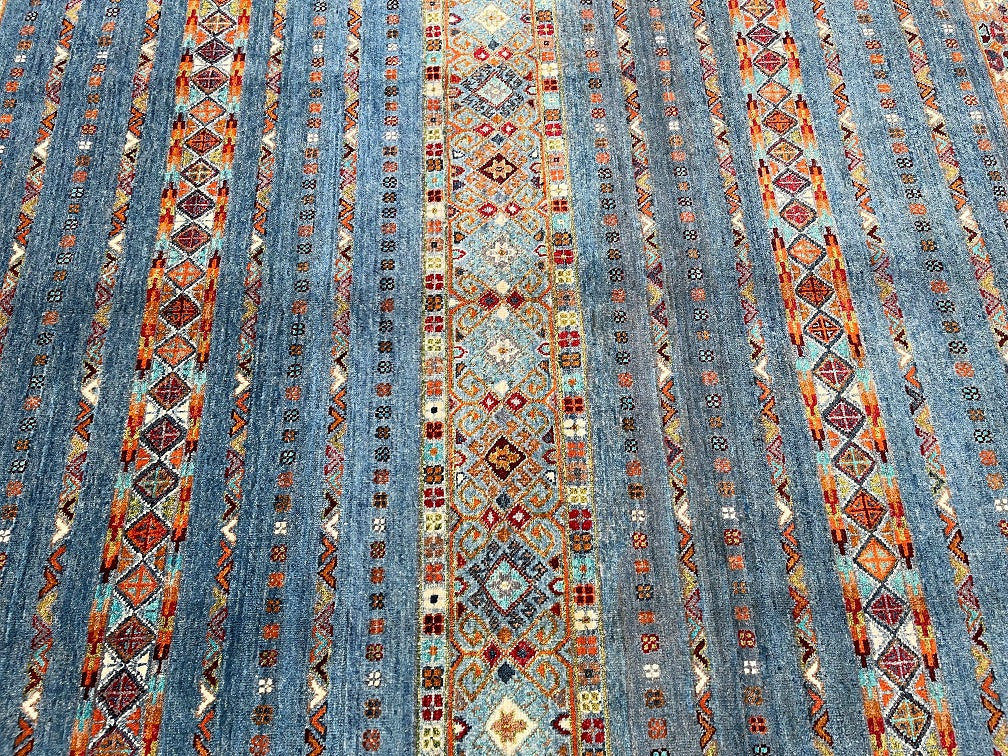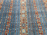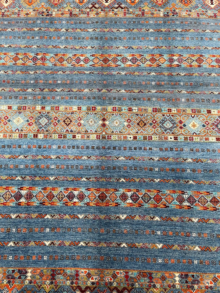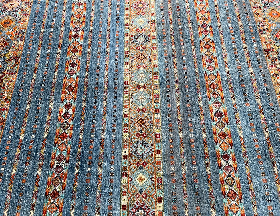 Full Room Size Genuine Hand Knotted Khorjin Design Super Kazak Rug. Above All It Is Pure Hand Spun Wool Pile On Cotton Base. Light Blue, Beige, Orange, Maroon, Turquoise And Green Tone Dyed Using Traditional Methods (Vegetable Dyes). Last of True Woven Nomadic Art.