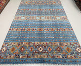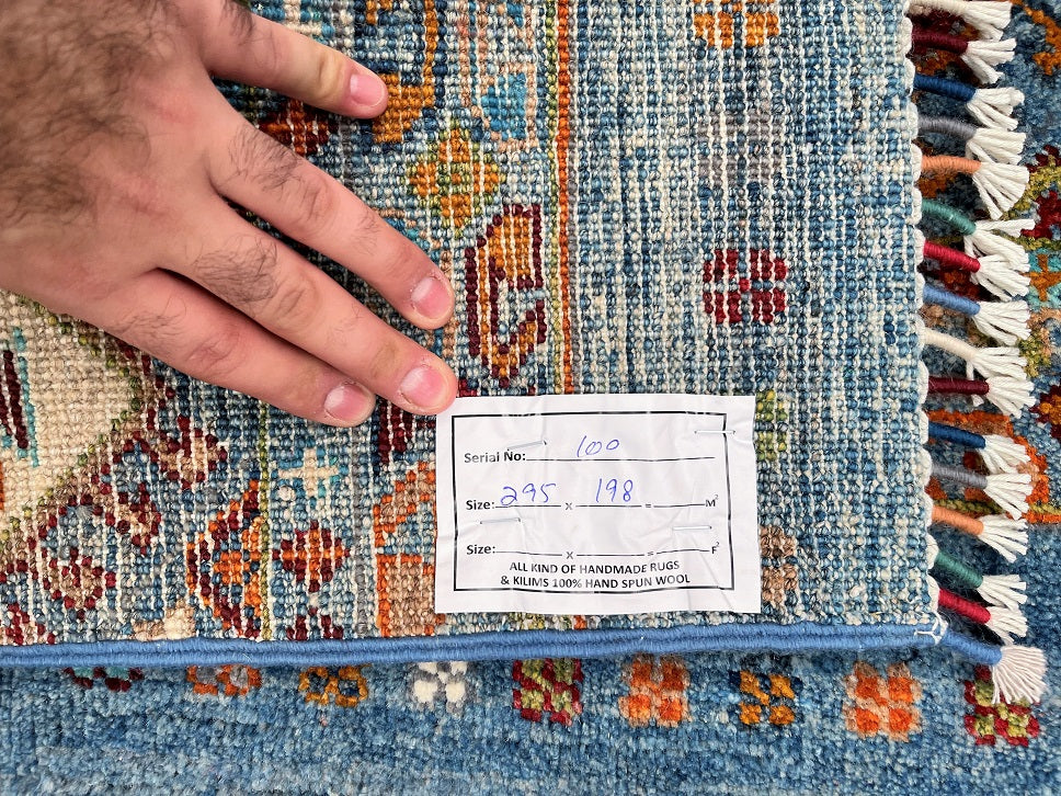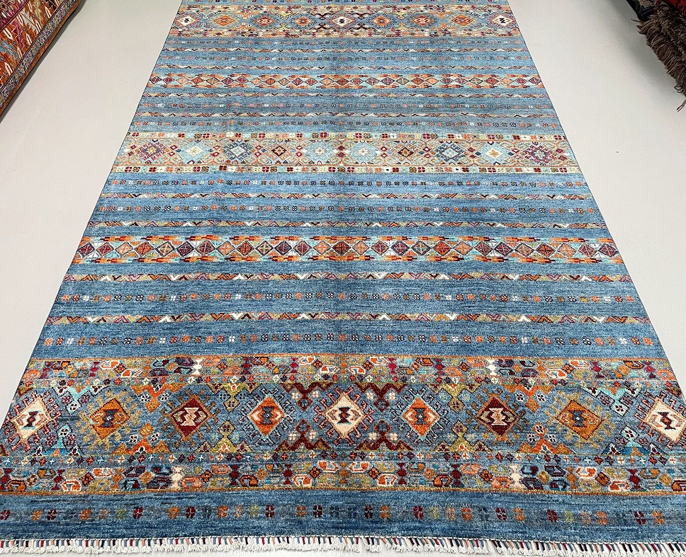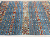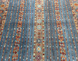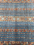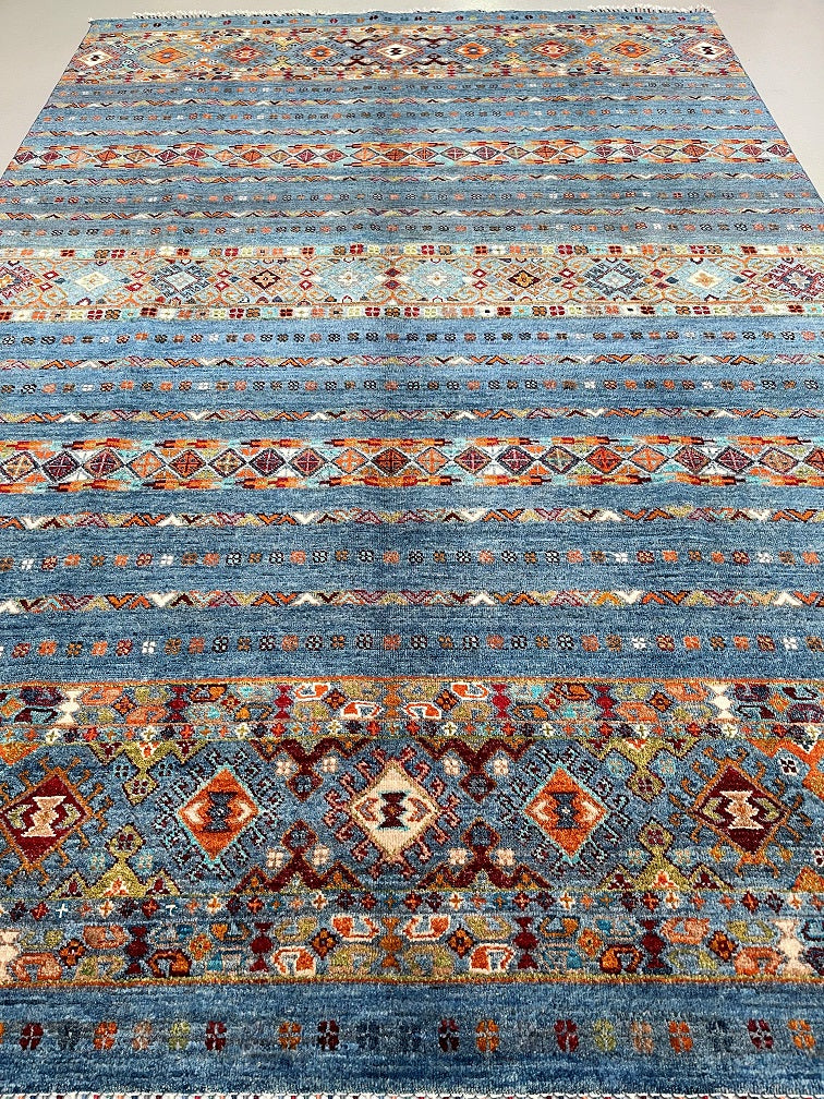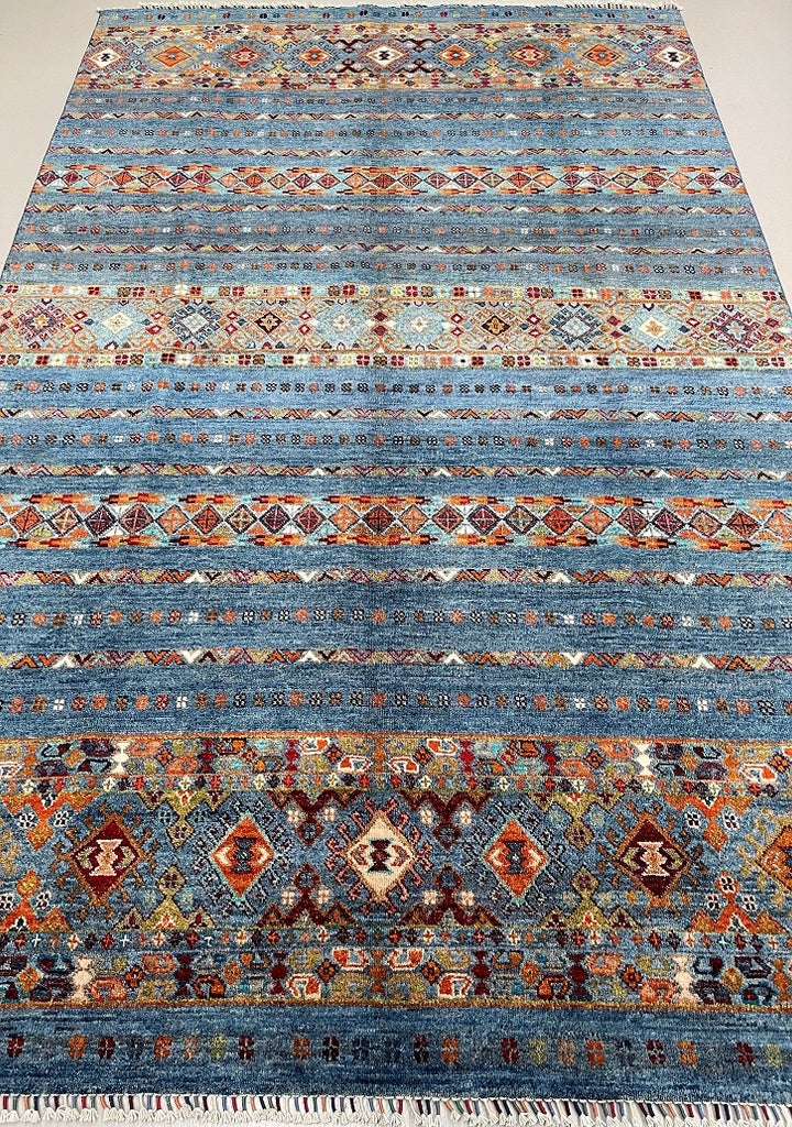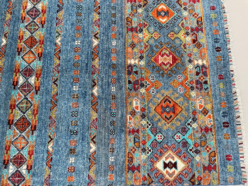 Full Room Size Genuine Hand Knotted Khorjin Design Super Kazak Rug. Above All It Is Pure Hand Spun Wool Pile On Cotton Base. Light Blue, Beige, Orange, Maroon, Turquoise And Green Tone Dyed Using Traditional Methods (Vegetable Dyes). Last of True Woven Nomadic Art.