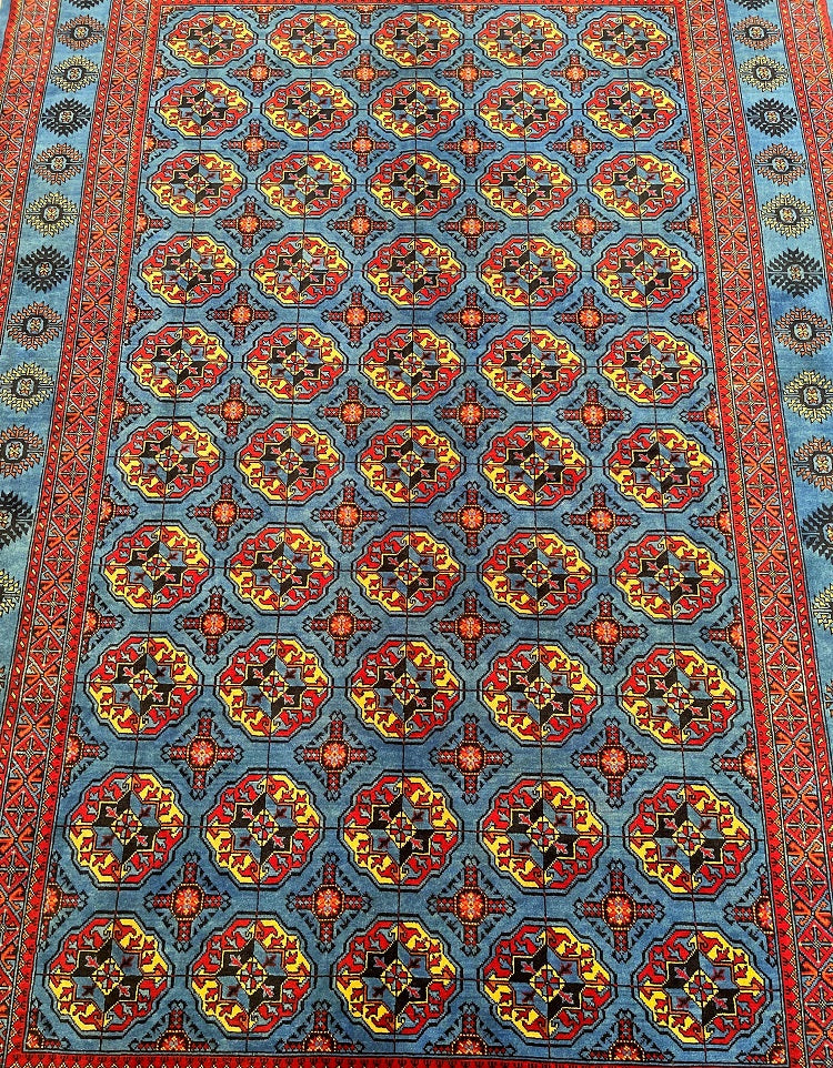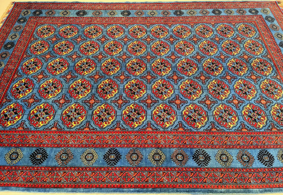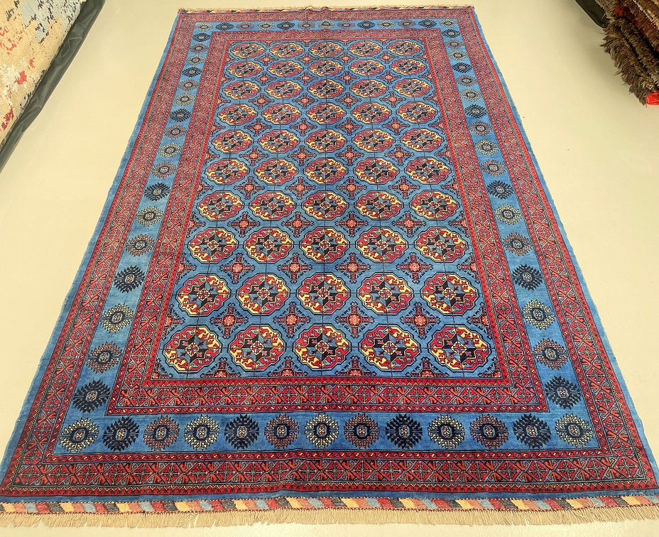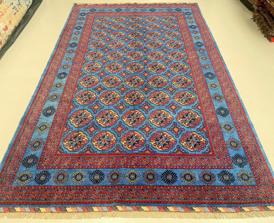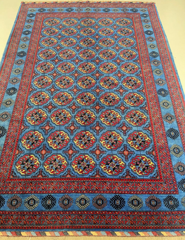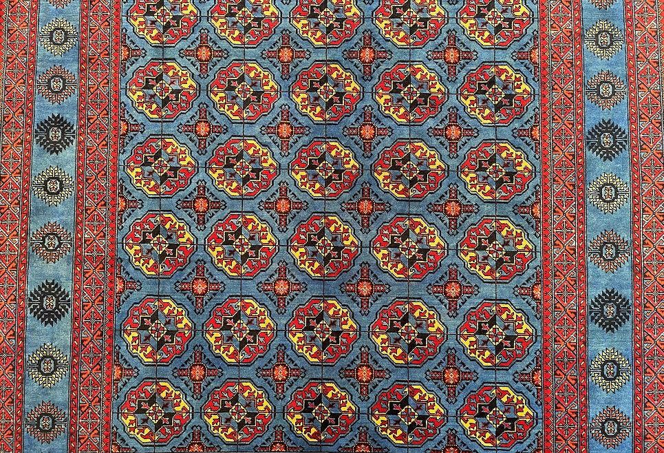 Superb Full Room Size Genuine Hand Knotted Afghan Roshnai Rug. It features a pure wool pile on a cotton base and is dyed using traditional methods to achieve vibrant blue, red, orange, black, and beige tones. The intricate tribal pattern is renowned as the Bokhara design, showcasing fine workmanship. It is important to note that it would have taken a skilled weaver around 9-12 months to weave this rug by hand. The rug measures 296 x 200 cm and has a gallery replacement value of $5990.
