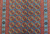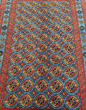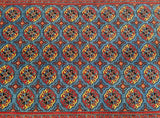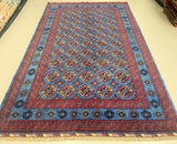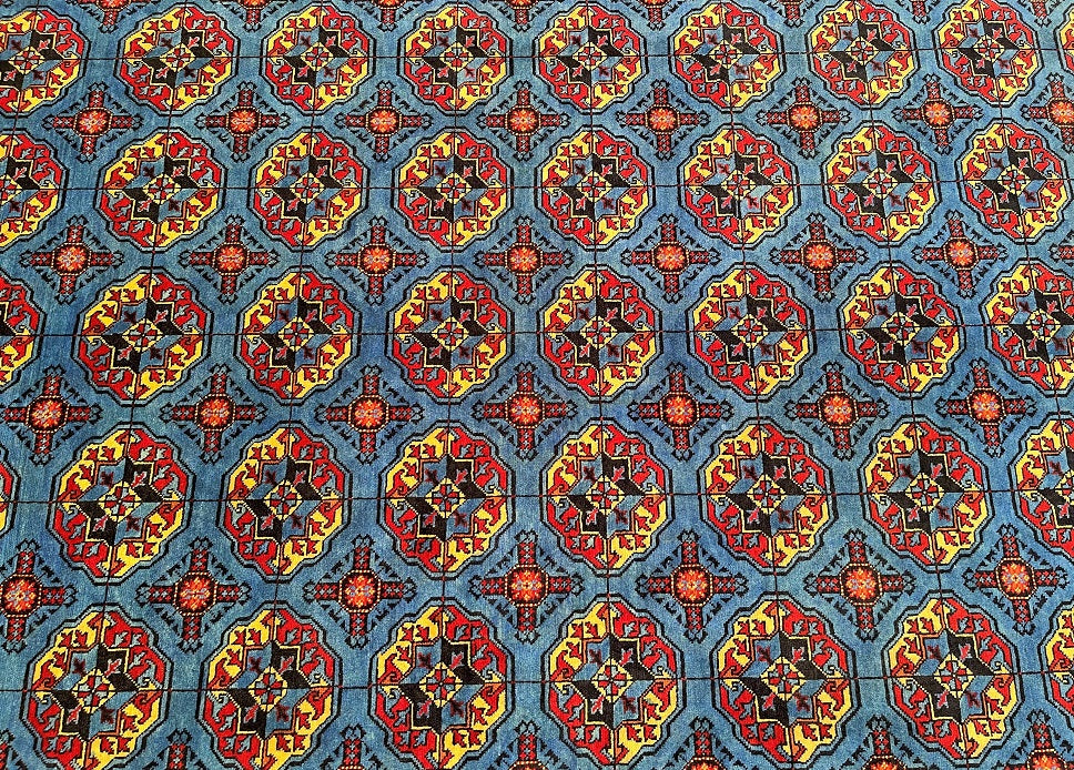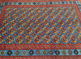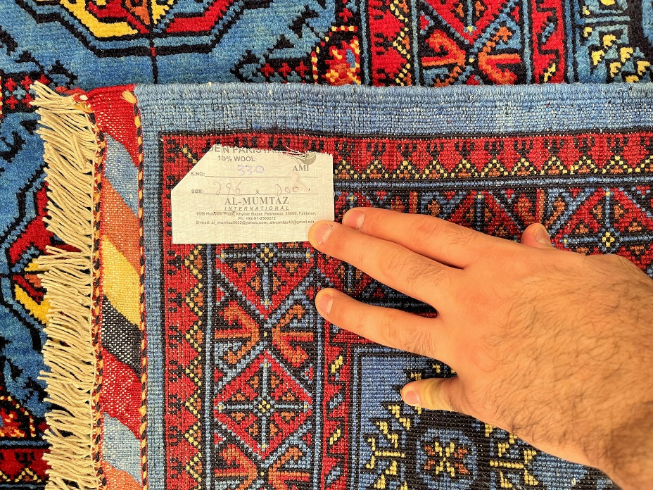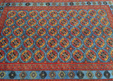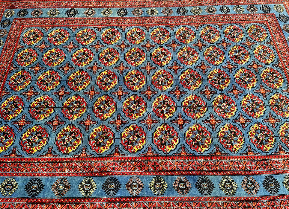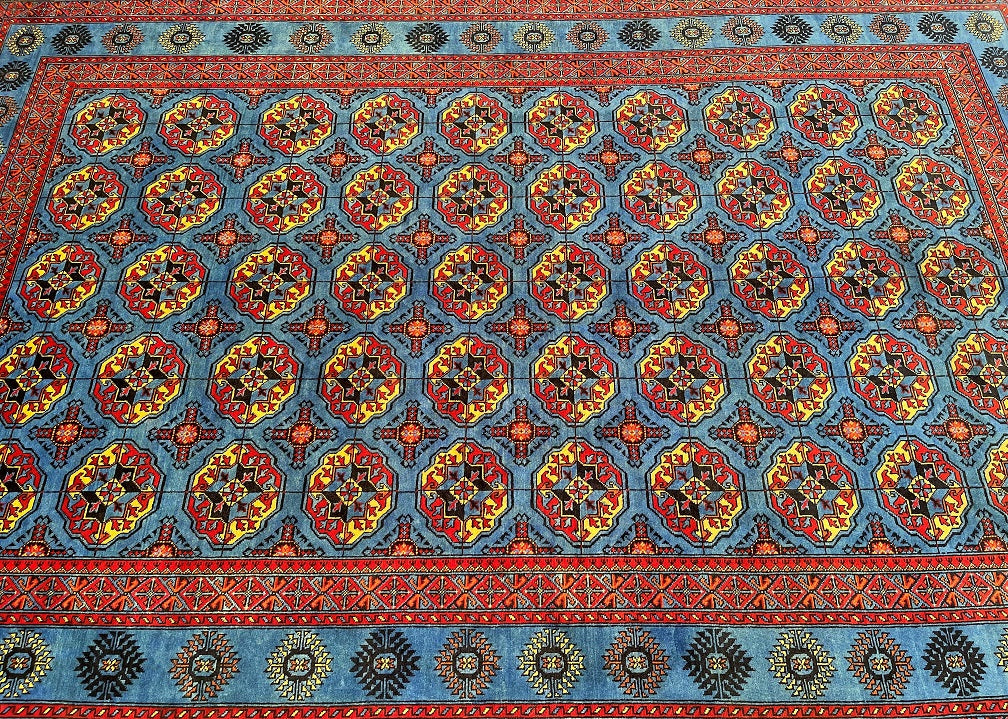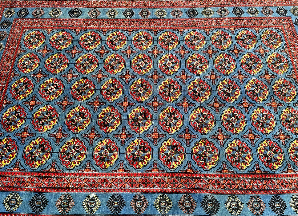 Superb Full Room Size Genuine Hand Knotted Afghan Roshnai Rug. It features a pure wool pile on a cotton base and is dyed using traditional methods to achieve vibrant blue, red, orange, black, and beige tones. The intricate tribal pattern is renowned as the Bokhara design, showcasing fine workmanship. It is important to note that it would have taken a skilled weaver around 9-12 months to weave this rug by hand. The rug measures 296 x 200 cm and has a gallery replacement value of $5990.