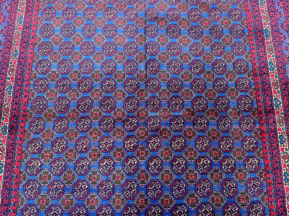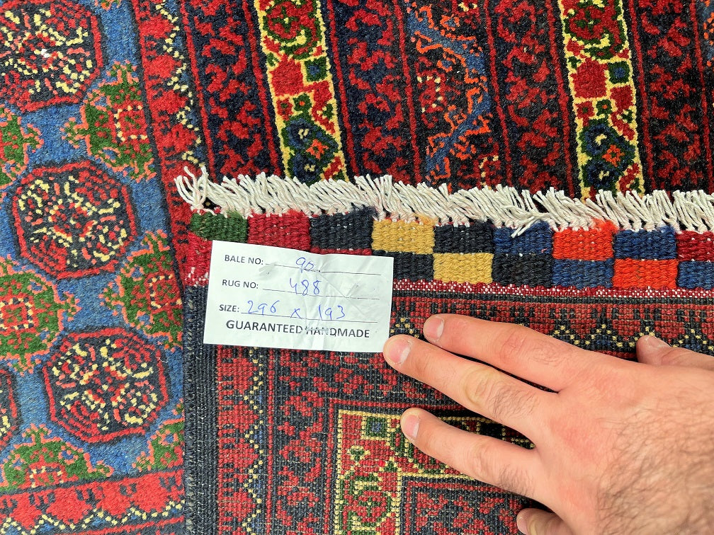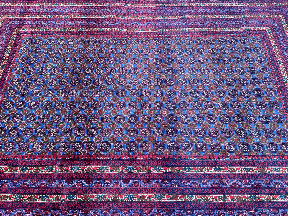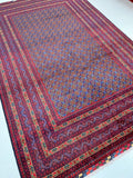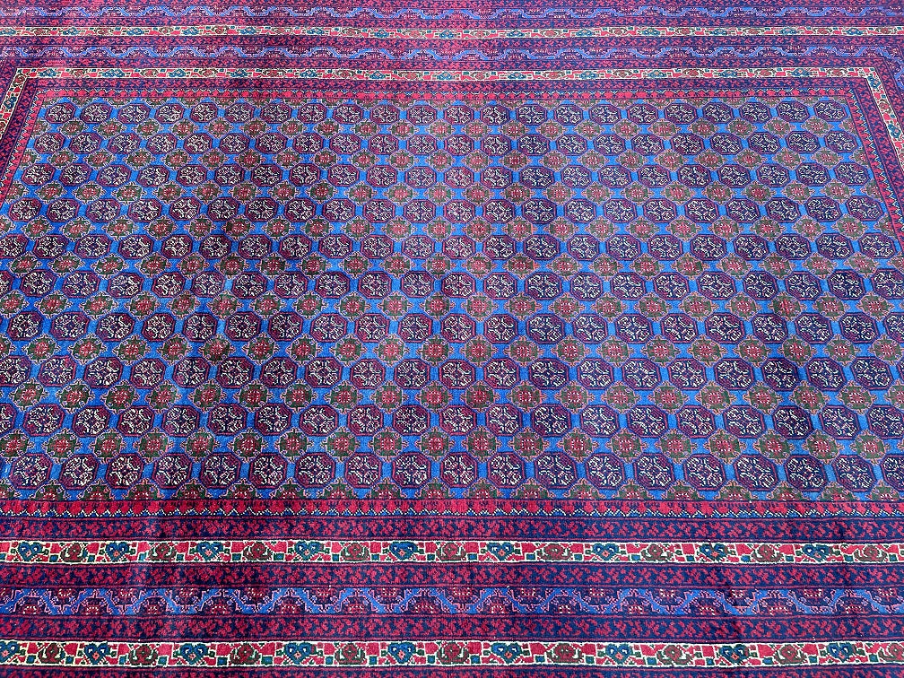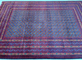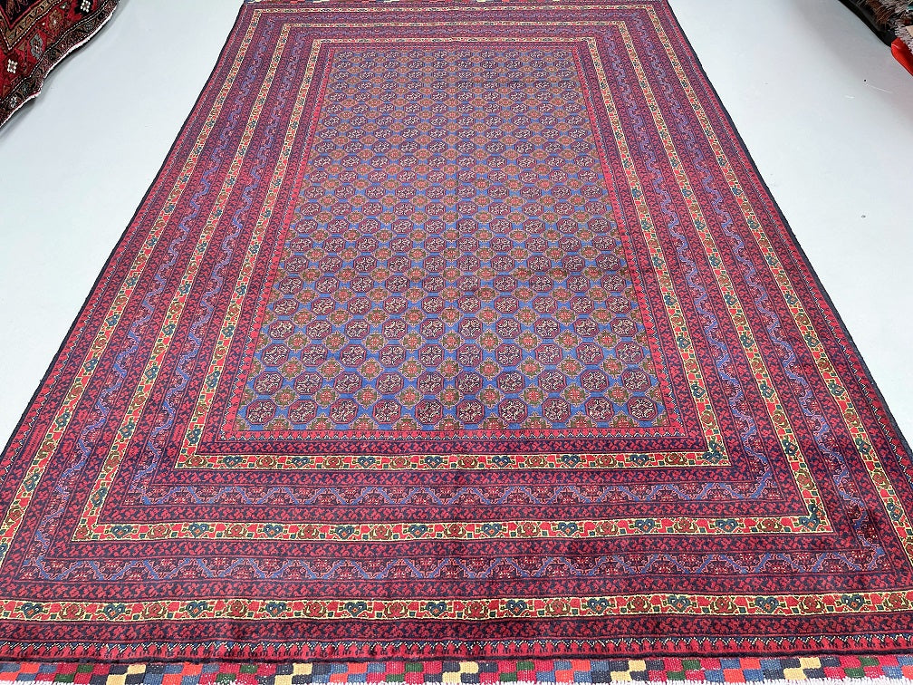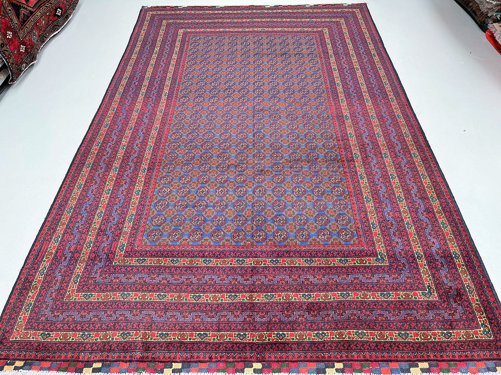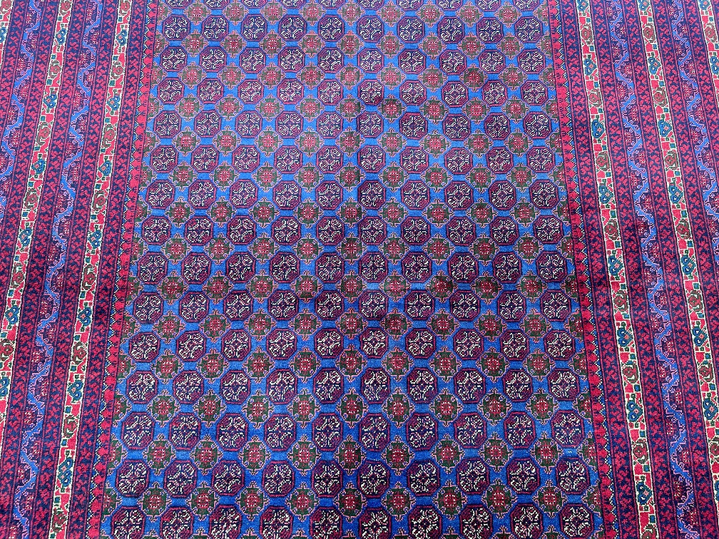 Full Room Size Genuine Hand Knotted Afghan Roshnai Rug. Above All It Has A Pure Hand Spun Wool Pile On Wool Base. It Also Has A Blue, Burgundy, Green, Black And Beige Tone Dyed Using Traditional Methods.