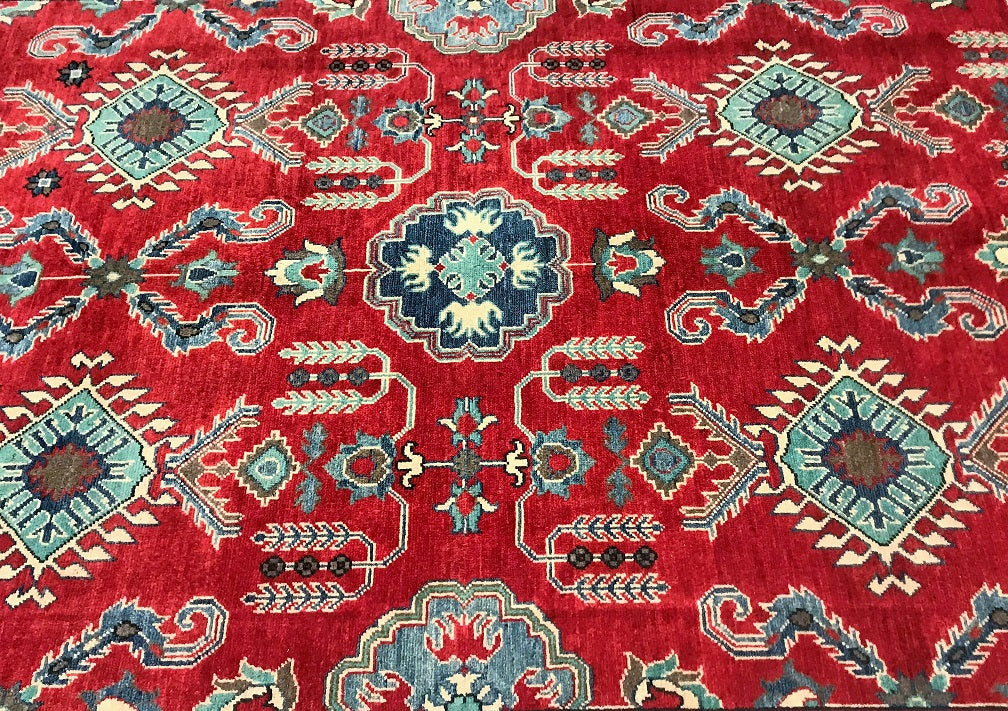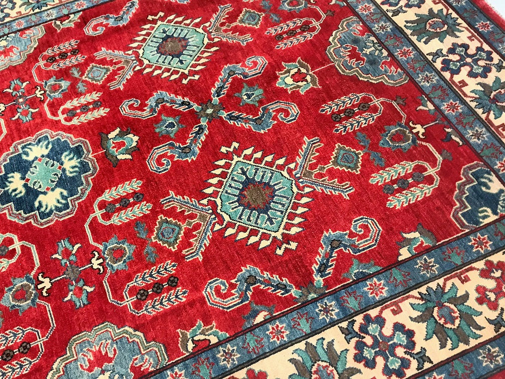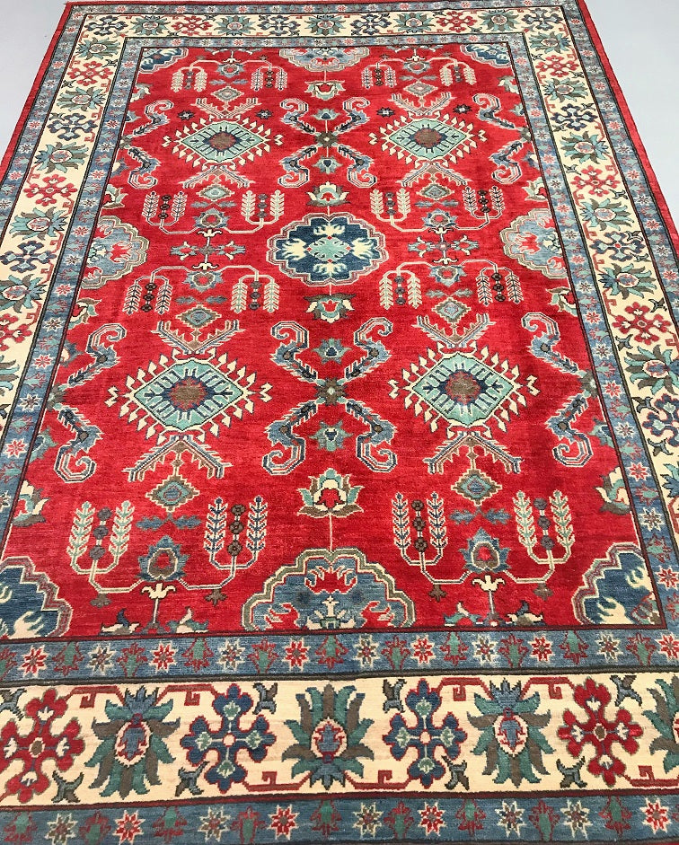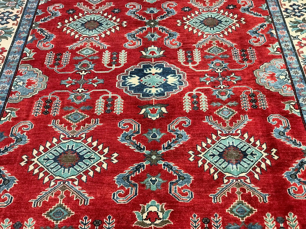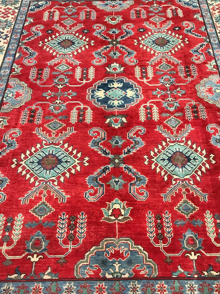 Gorgeous Full Room Size Hand Knotted Afghan Kazak Rug. Above All It Has A Hand Spun Wool Pile On Cotton Base. Main Colors Are Red, Beige, Blue Dyed Using Traditional Methods (Vegetable Dyes). Last of True Woven Nomadic Art.