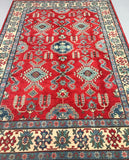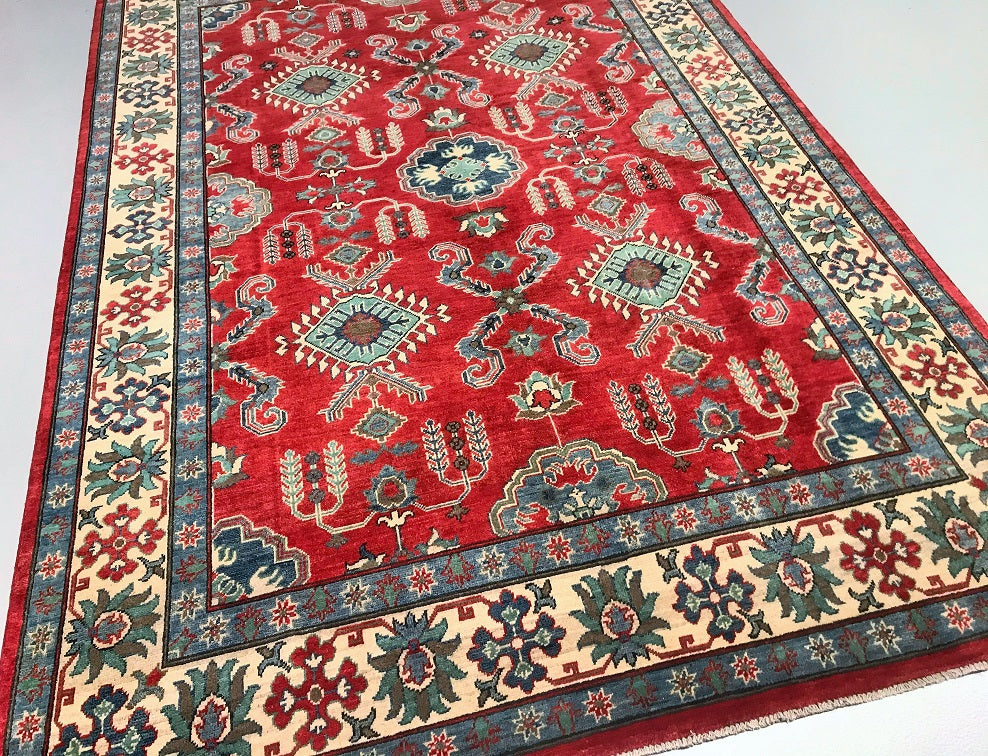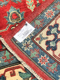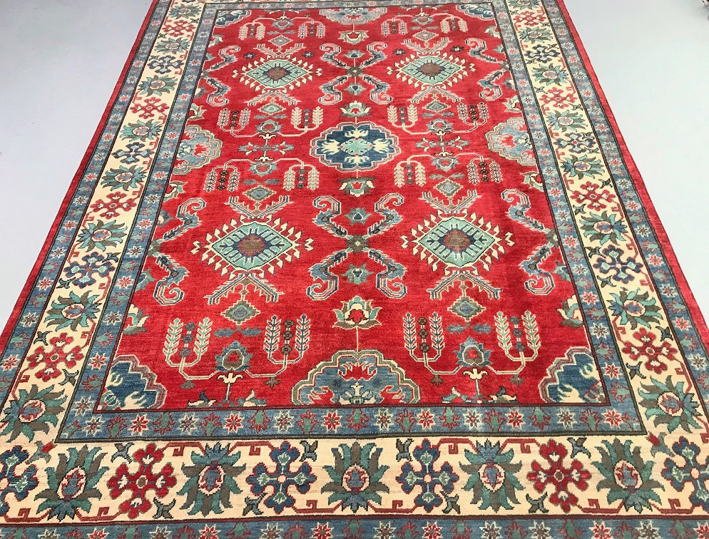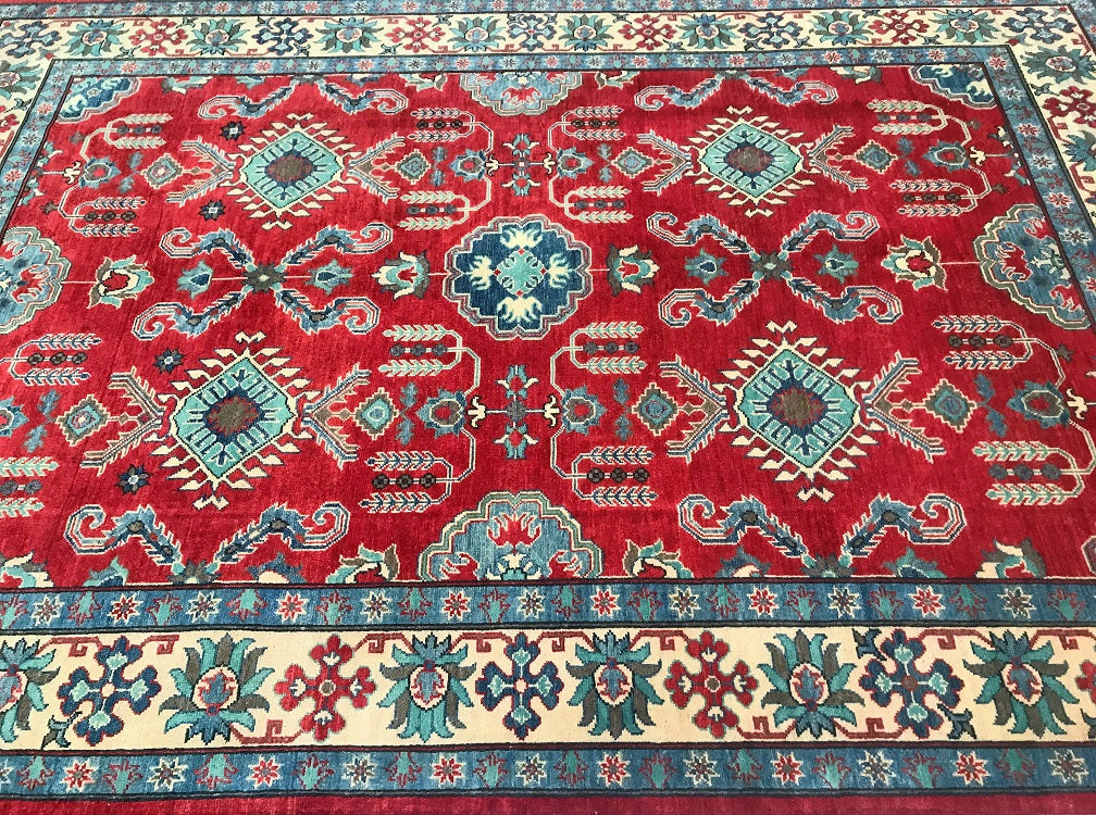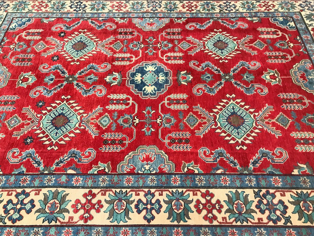 Gorgeous Full Room Size Hand Knotted Afghan Kazak Rug. Above All It Has A Hand Spun Wool Pile On Cotton Base. Main Colors Are Red, Beige, Blue Dyed Using Traditional Methods (Vegetable Dyes). Last of True Woven Nomadic Art.
