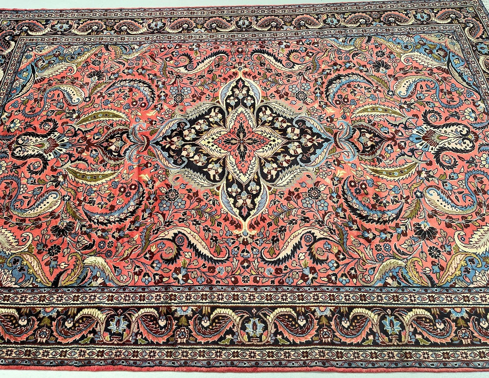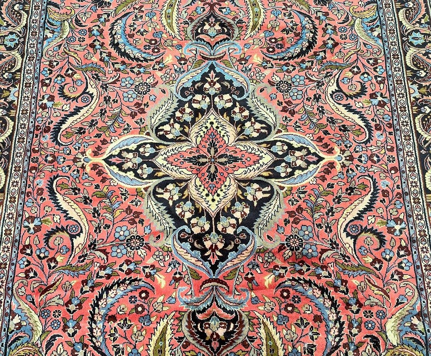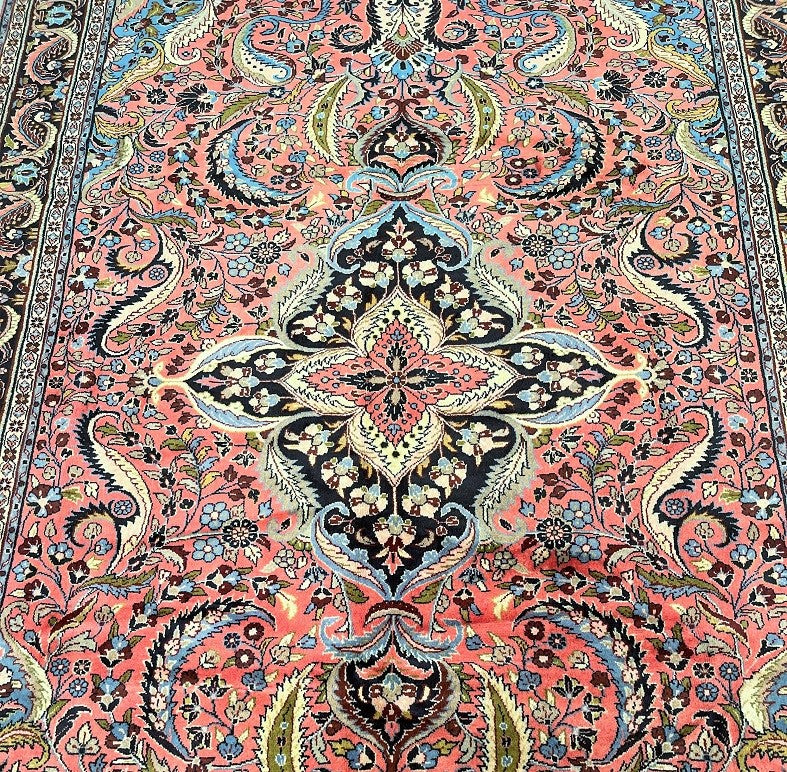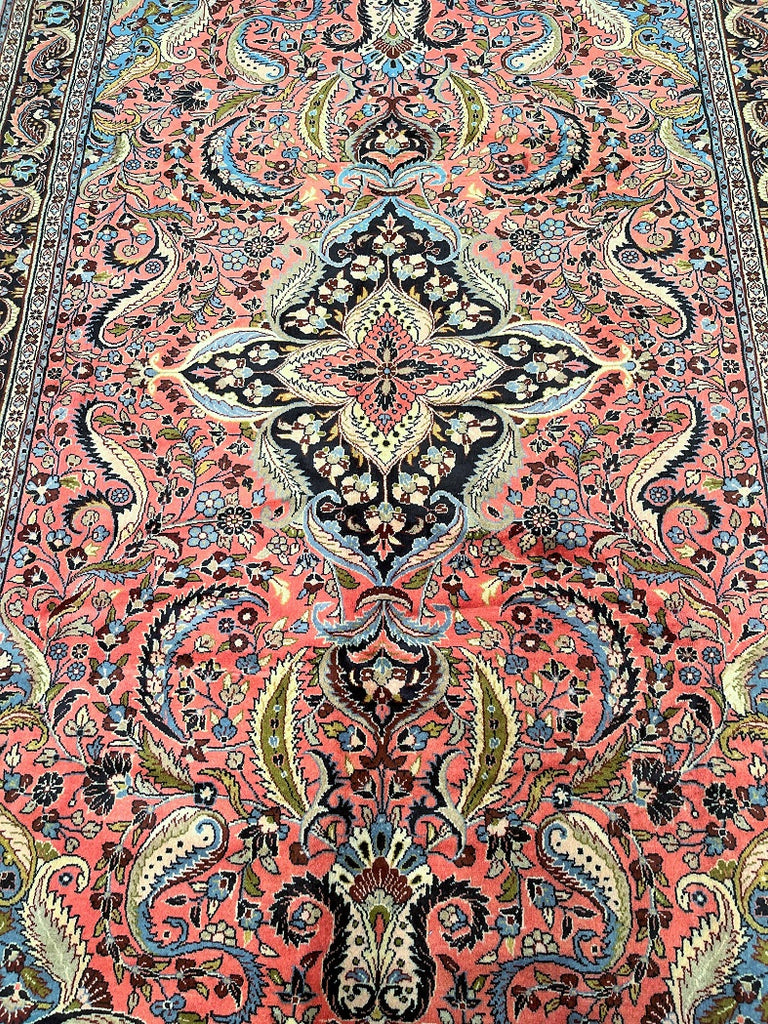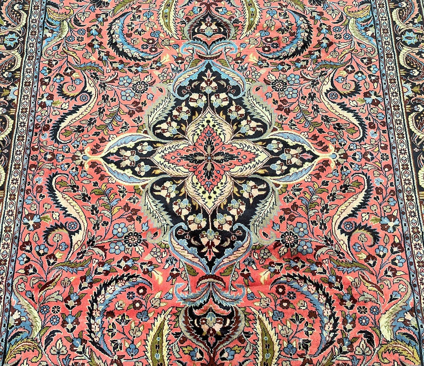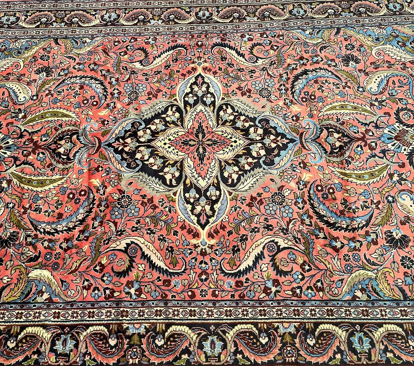 Full Room Size Authentic Handmade Persian Mehraban Rug. Above All It Has A Pure Hand Spun Wool Pile On Cotton Base. Salmon Pink, Beige, Green, French Blue And Black Tone Dyed Using Traditional Methods.