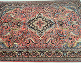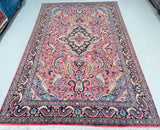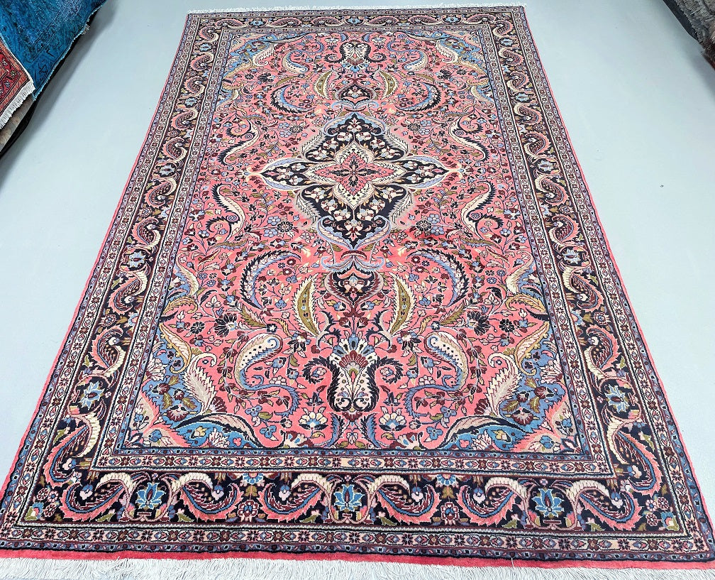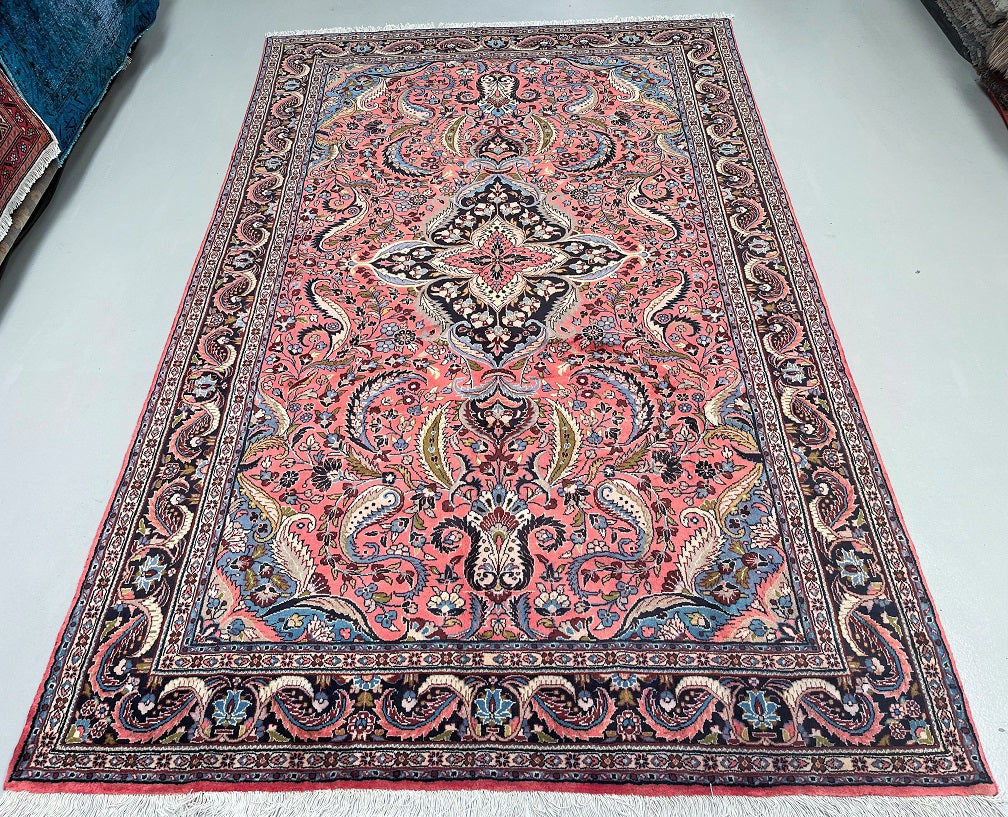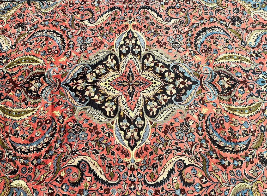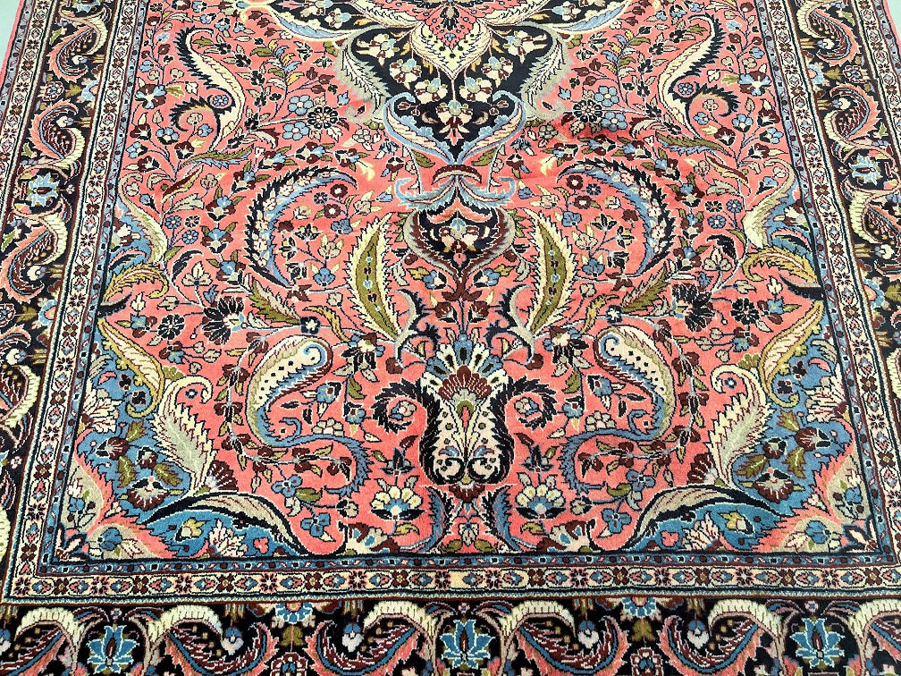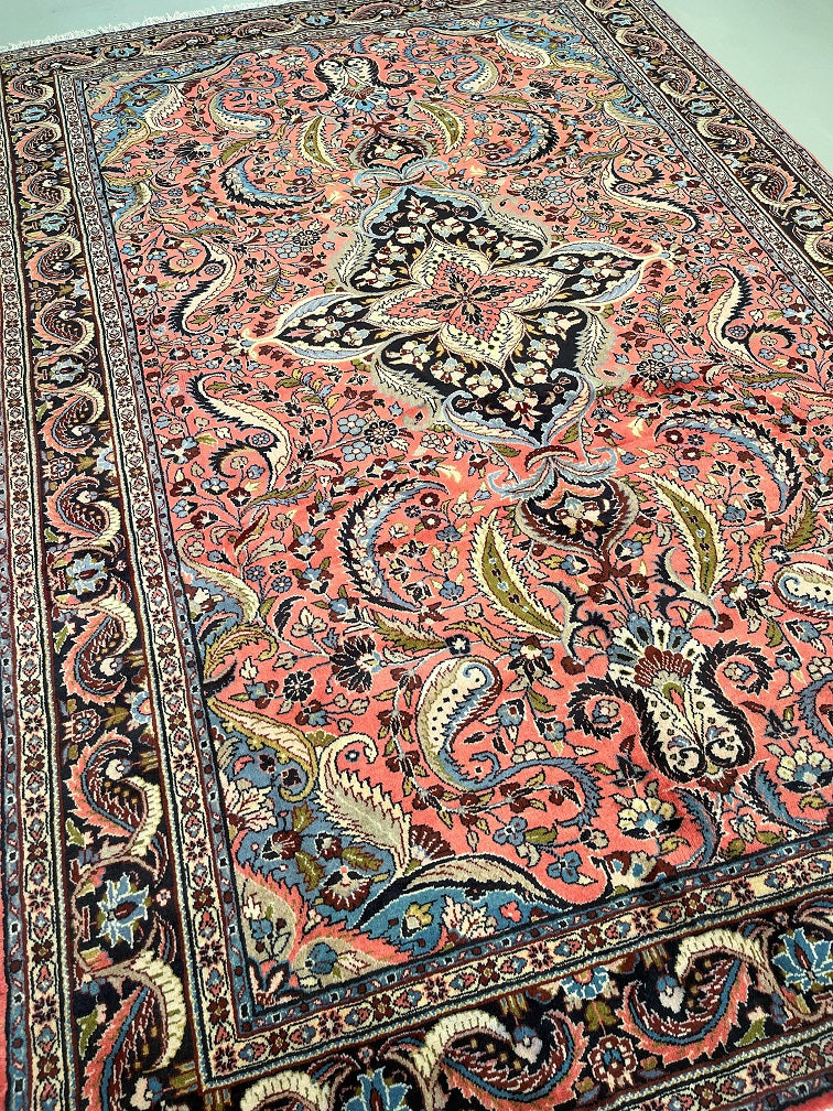 Full Room Size Authentic Handmade Persian Mehraban Rug. Above All It Has A Pure Hand Spun Wool Pile On Cotton Base. Salmon Pink, Beige, Green, French Blue And Black Tone Dyed Using Traditional Methods.