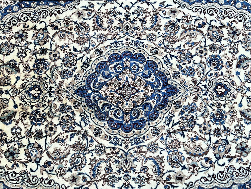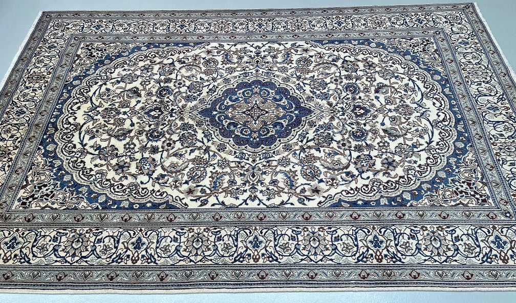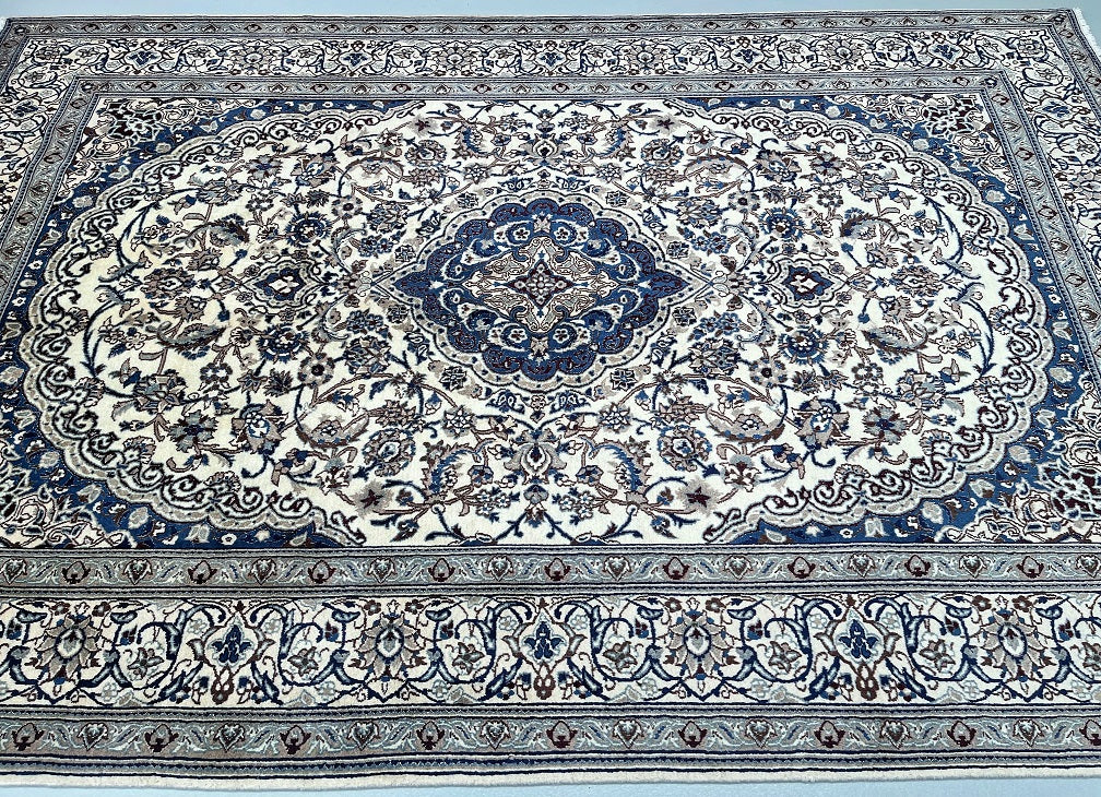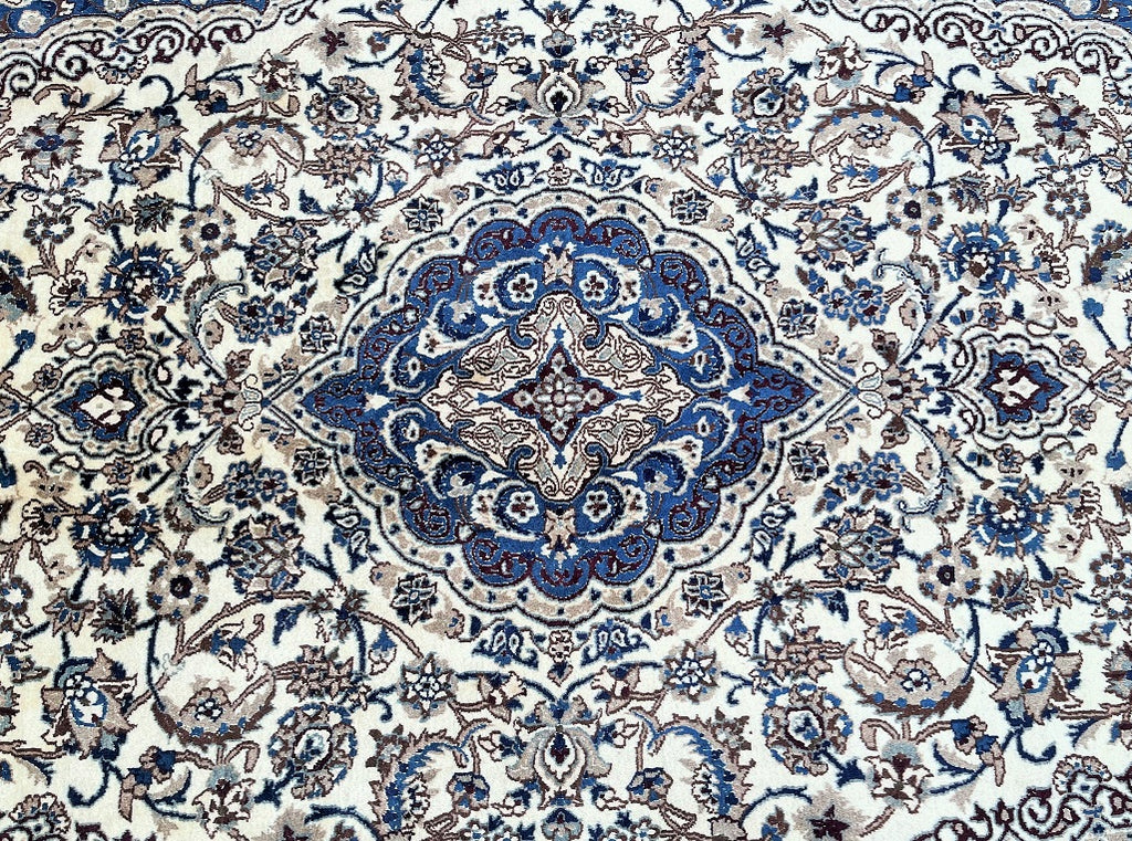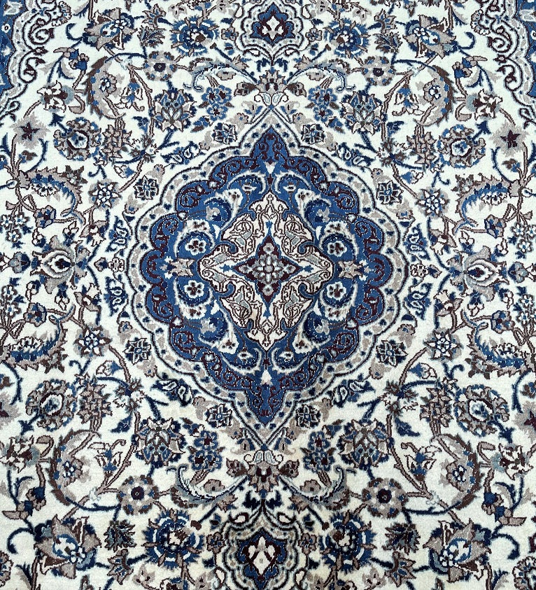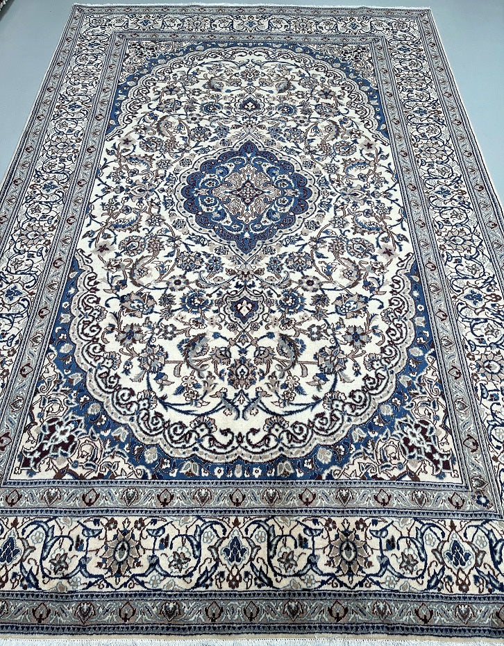 Full Room Size Authentic Hand Knotted Persian Nain Rug. Lamb’s Wool With Touch Of Silk Pile On Cotton Base. Beige, Blue, Brown And Burgundy Tone Dyed Using Traditional Methods.