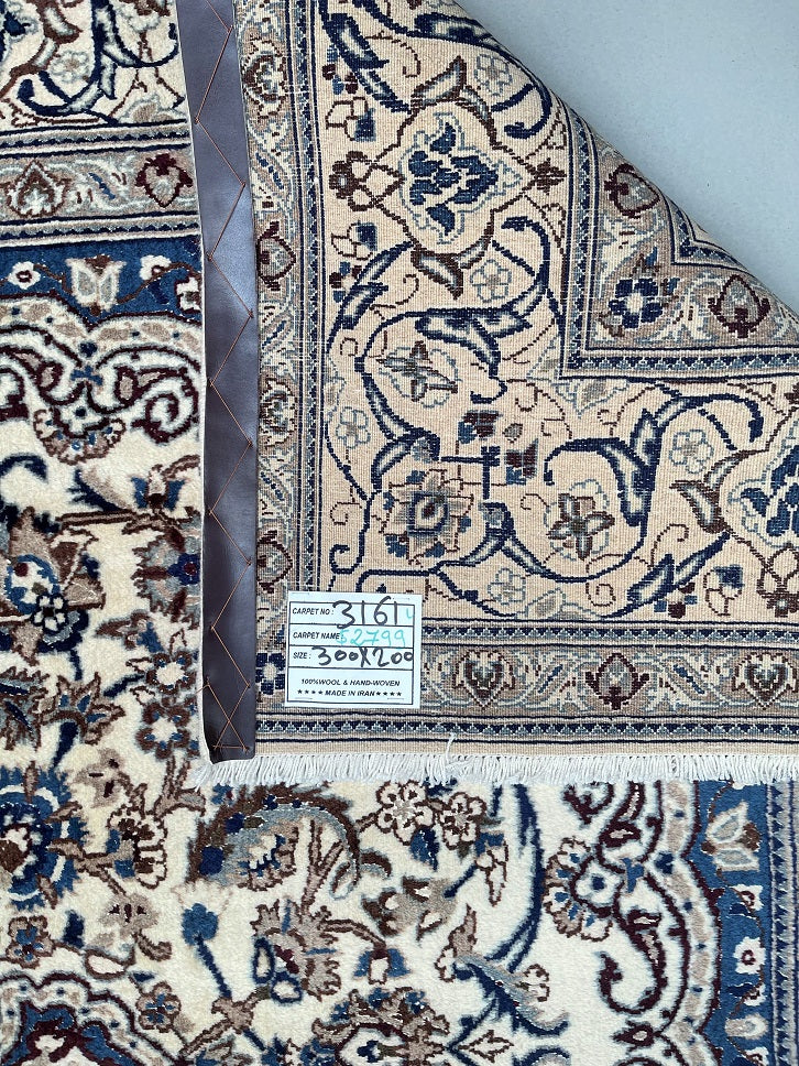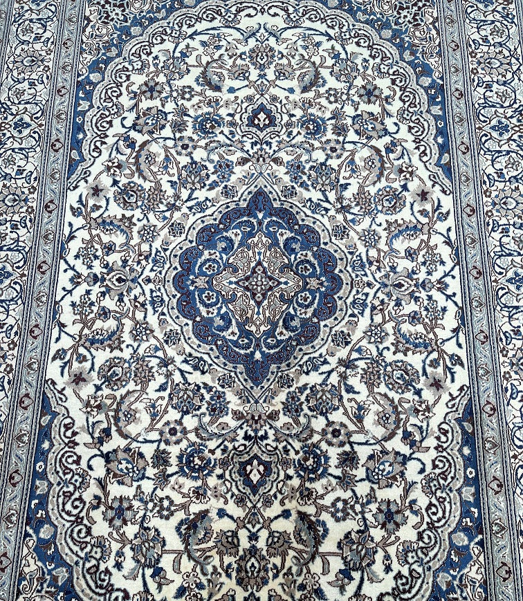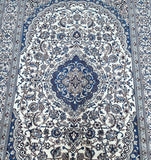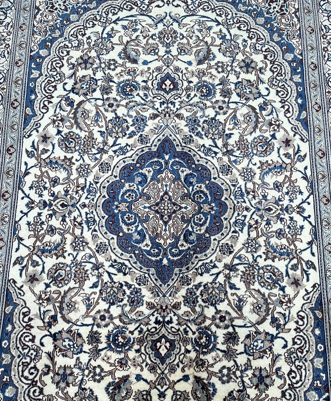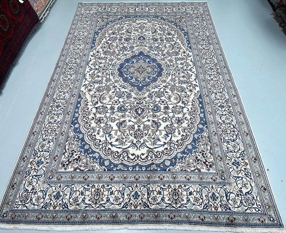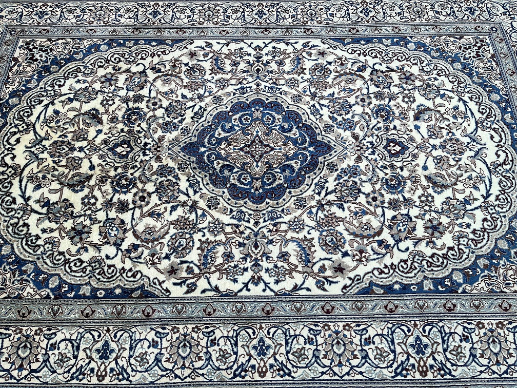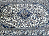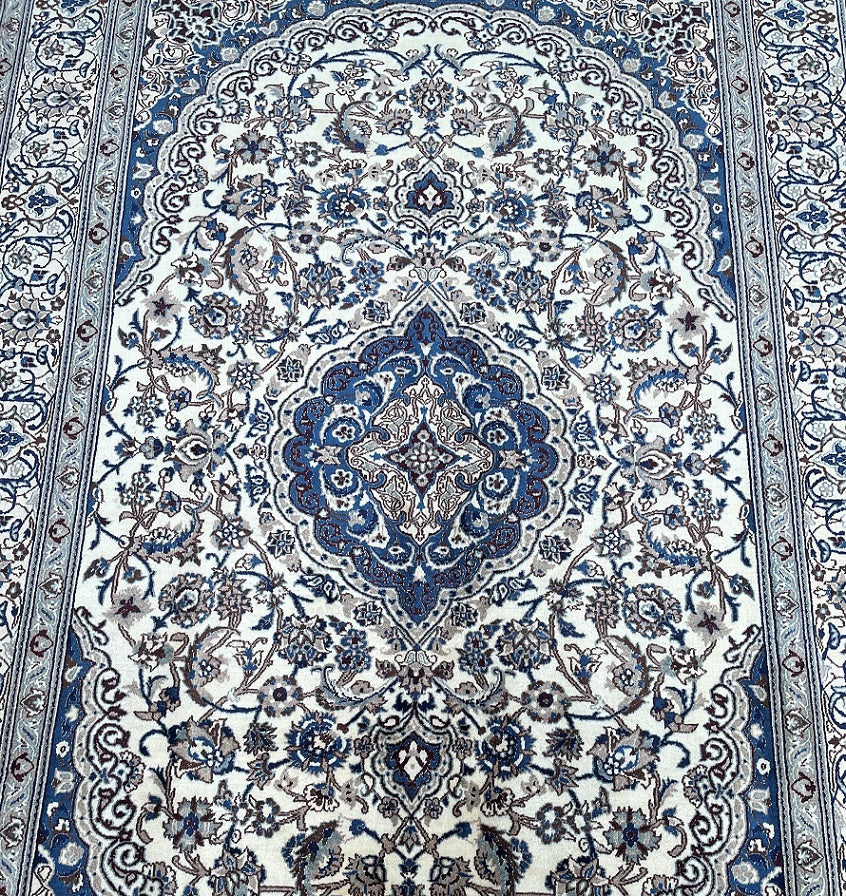 Full Room Size Authentic Hand Knotted Persian Nain Rug. Lamb’s Wool With Touch Of Silk Pile On Cotton Base. Beige, Blue, Brown And Burgundy Tone Dyed Using Traditional Methods.