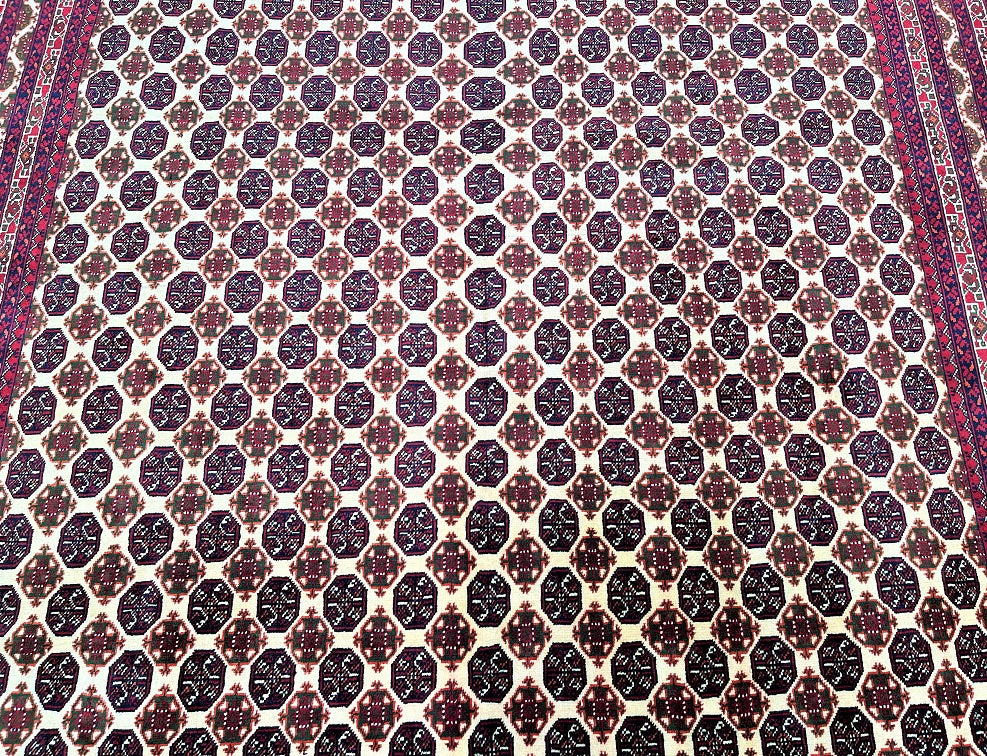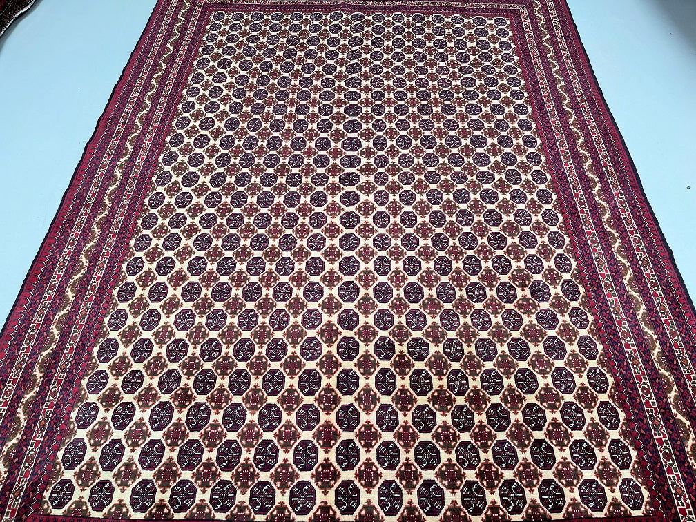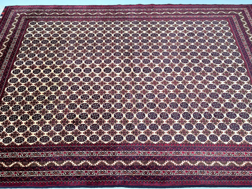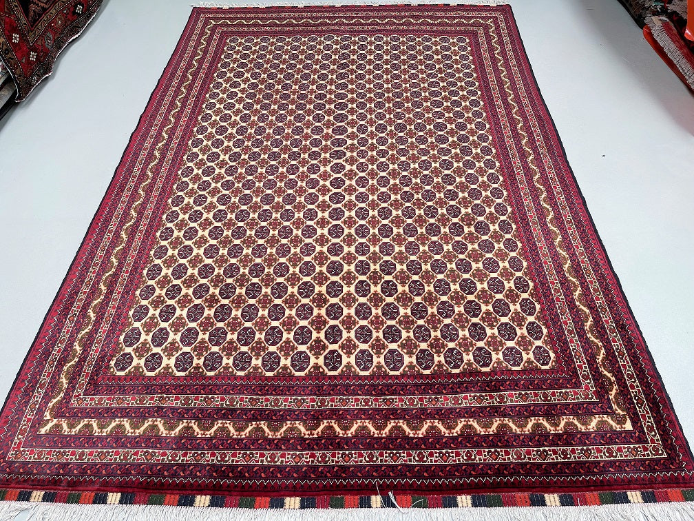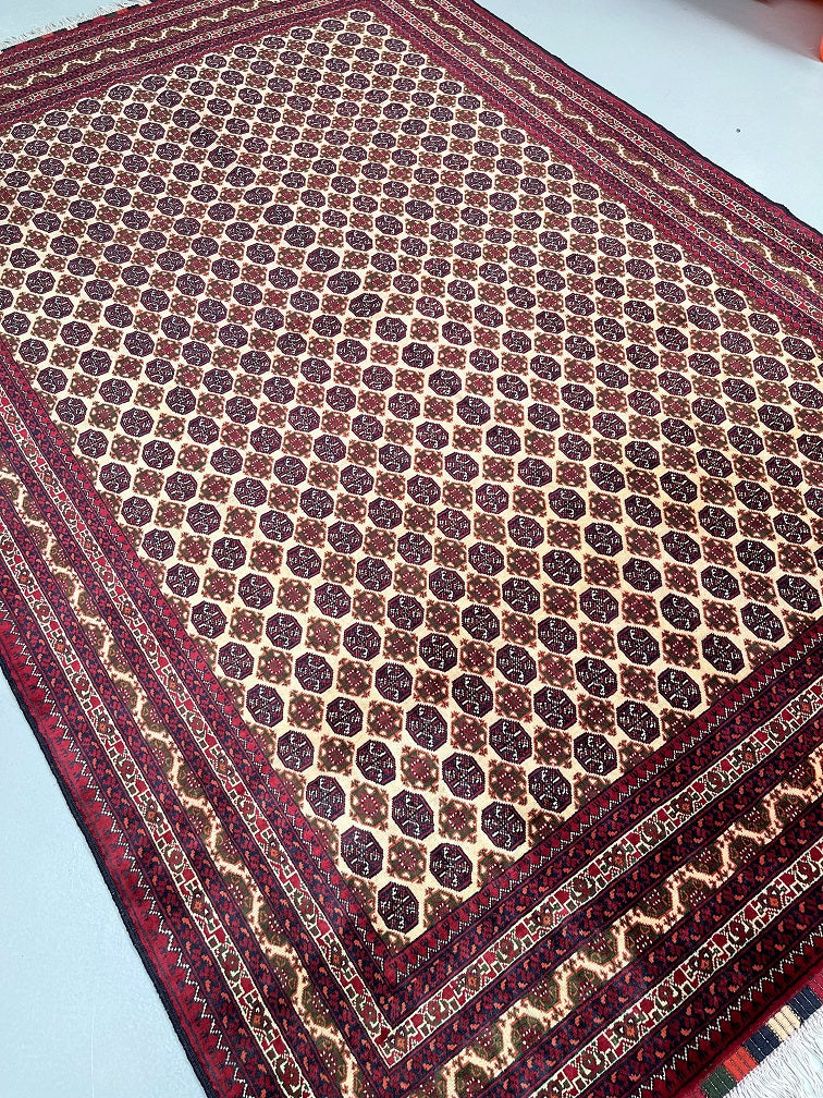 Superb Full Room Size Genuine Handmade Afghan Roshnai Rug. Above All It Is Pure Hand Spun Wool Pile On Wool Base. Main Colors Are Beige, Green, Black and Burgundy Tone Dyed Using Traditional Methods.