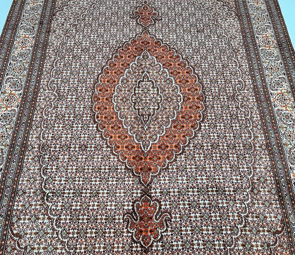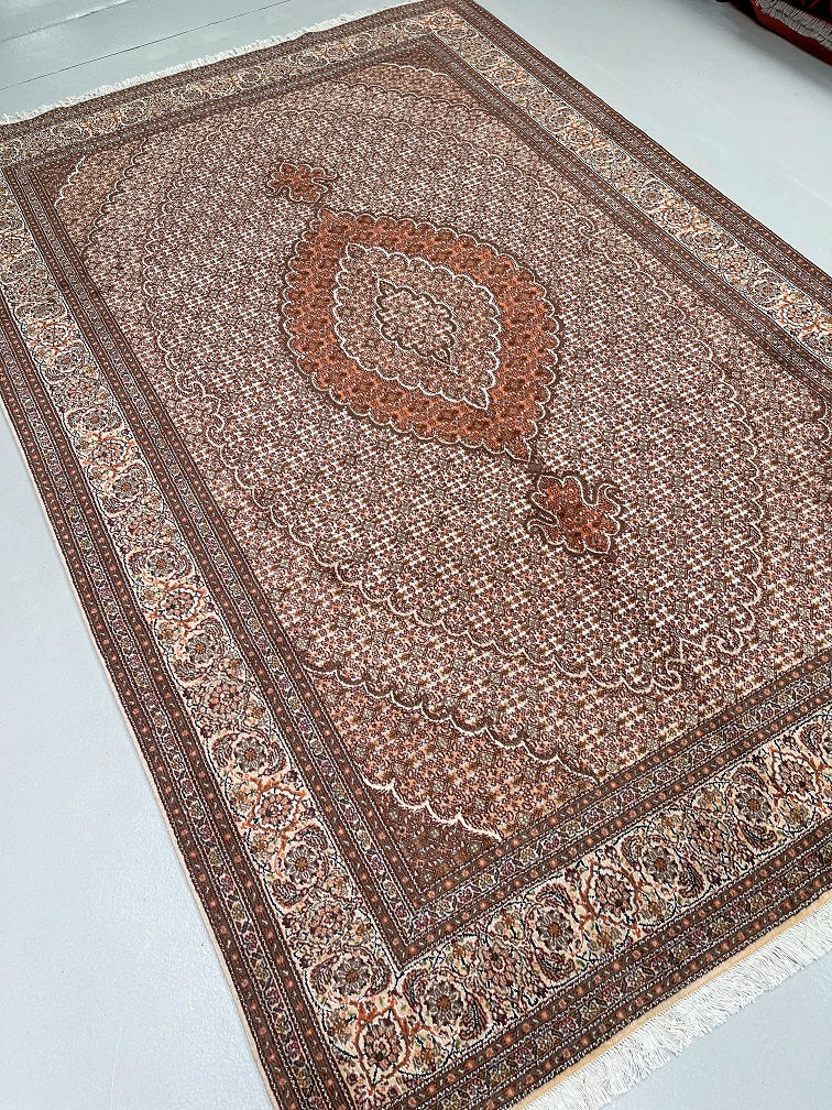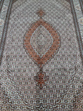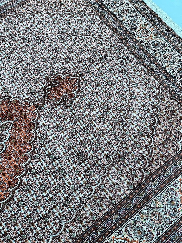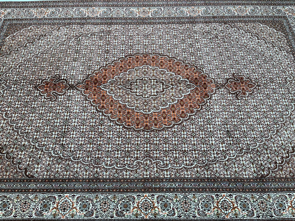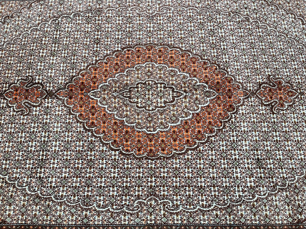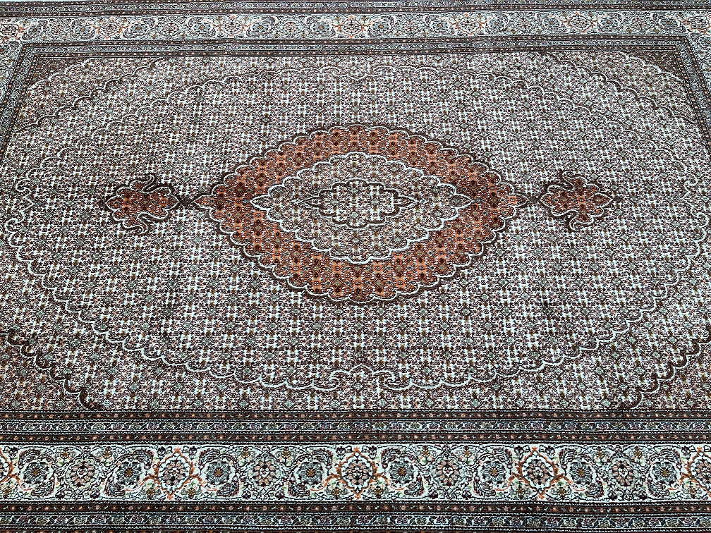 Fine Full Room Size Authentic Handmade Persian Tabriz Rug. Above All This Is A Unique Colour Combination You Only See In Finer Tabriz Rug. Lamb’s Wool Pile On Cotton Base. It Has A Beige, Caramel, Brown, Black And Pistachio Tones Dyed Using Traditional Methods.