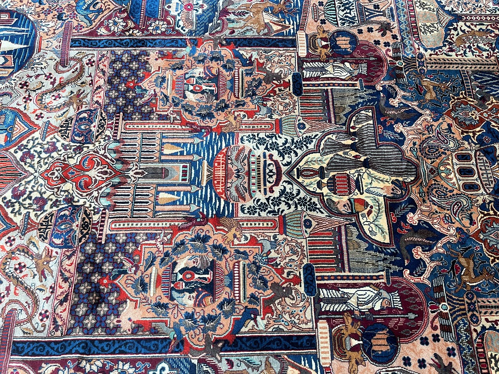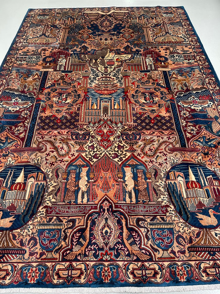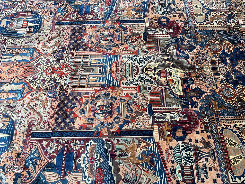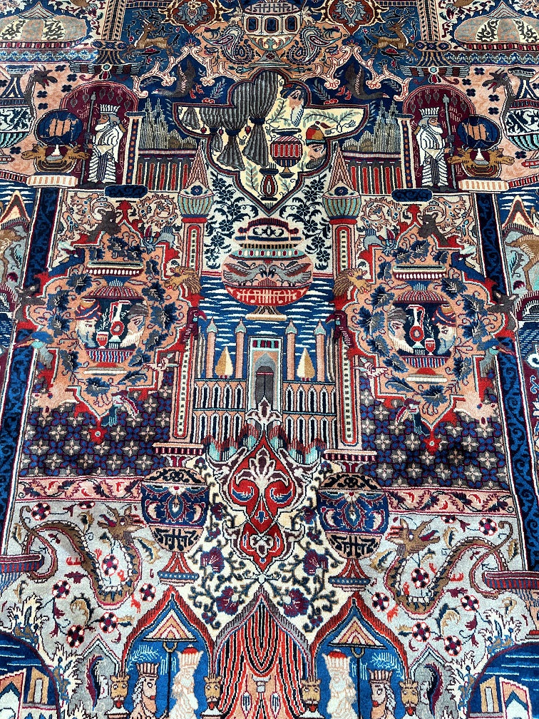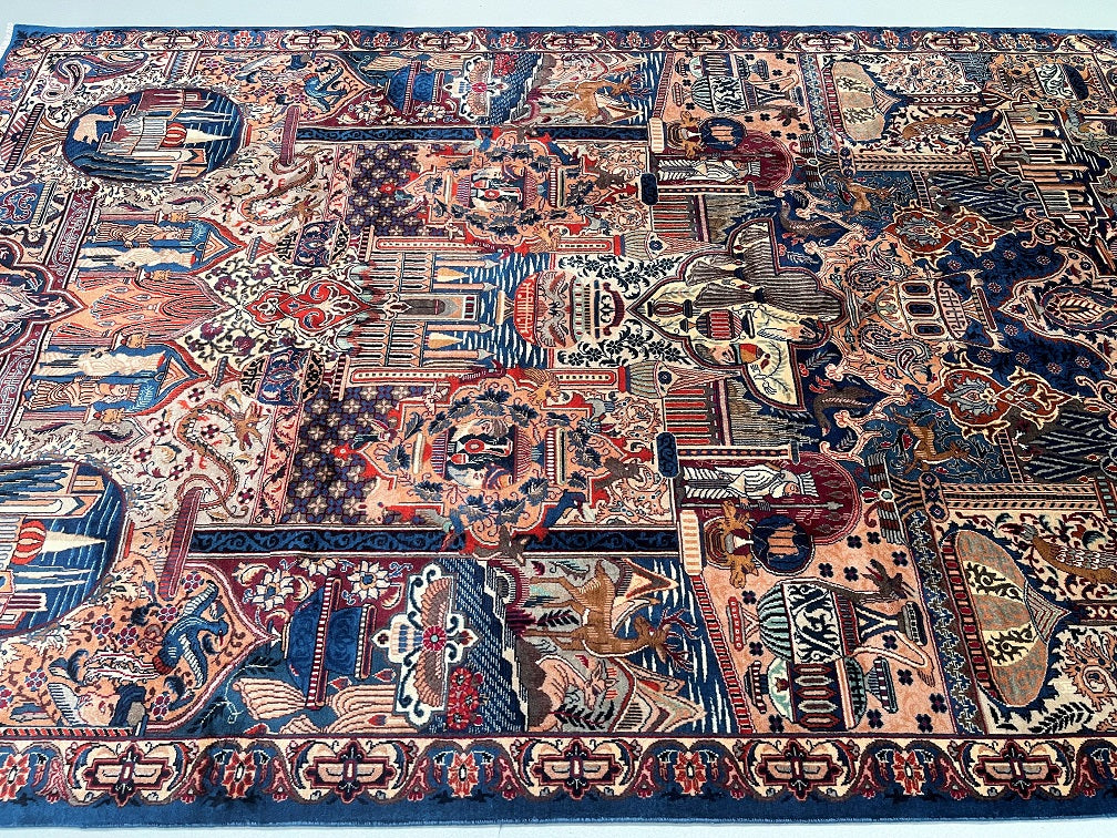 Full Room Size Authentic Hand Knotted Persepolis Persian Kashmar Carpet. Above All It Is Hard To Get Find Handmade Rug In Such Unique Pattern. Pure Lamb’s Wool Pile On Cotton Base. It Also Has A Blue Background Dyed Using Traditional Methods.