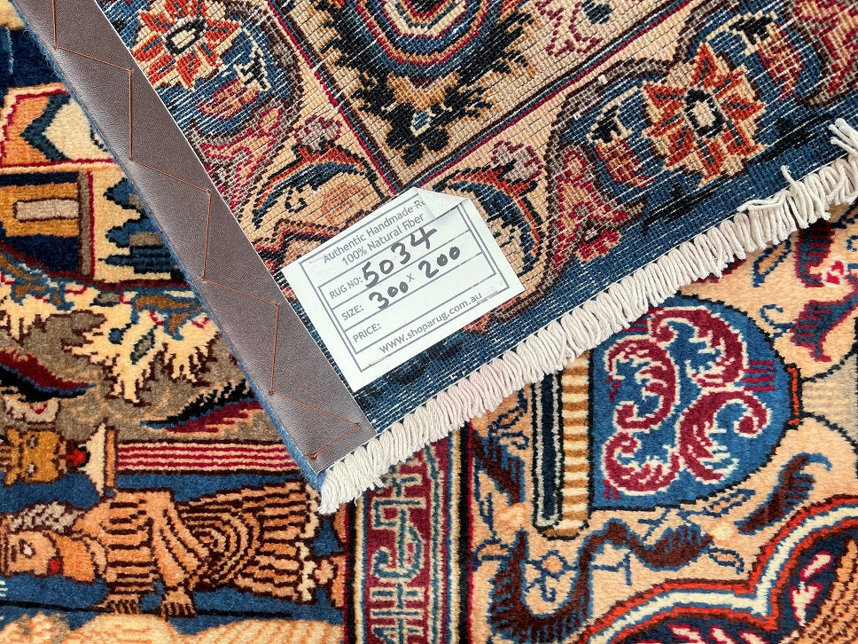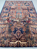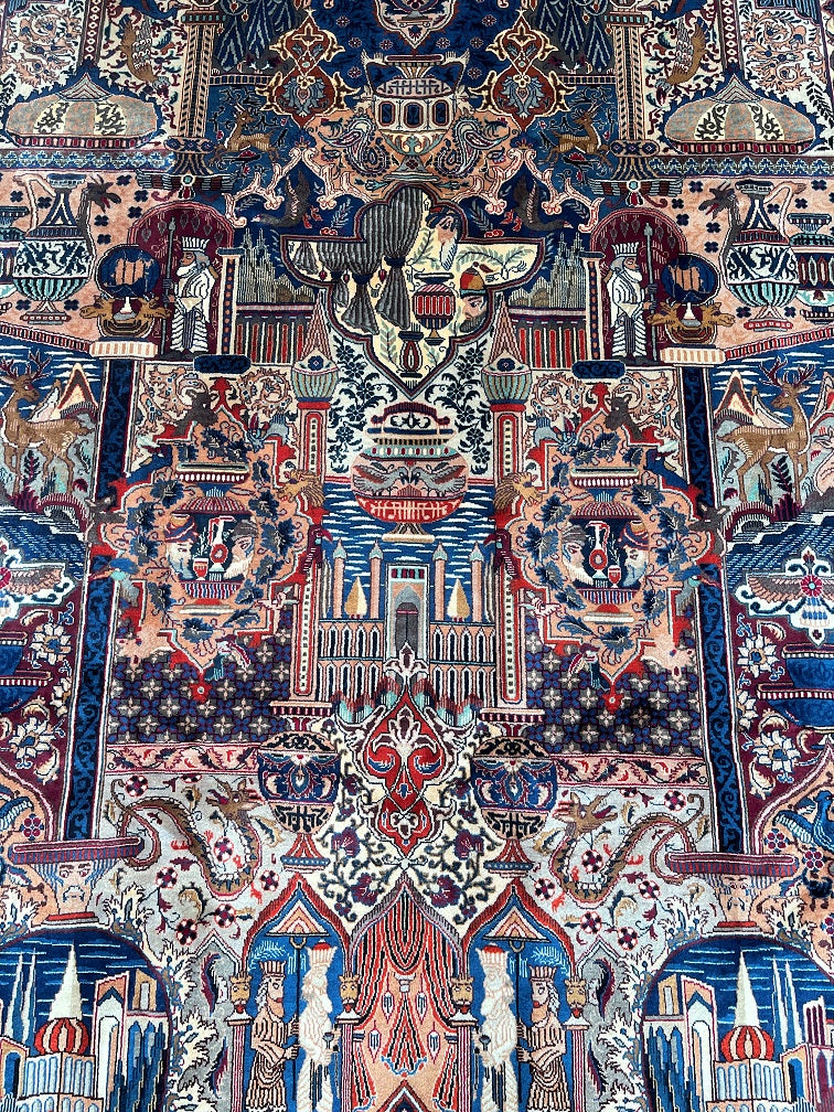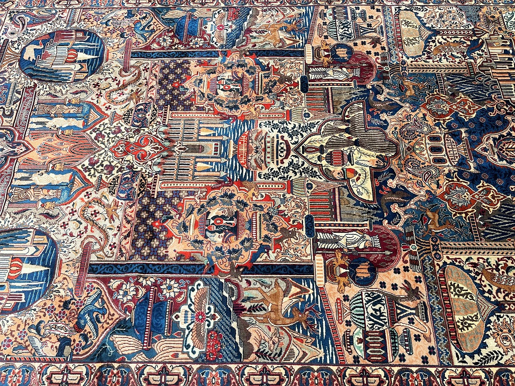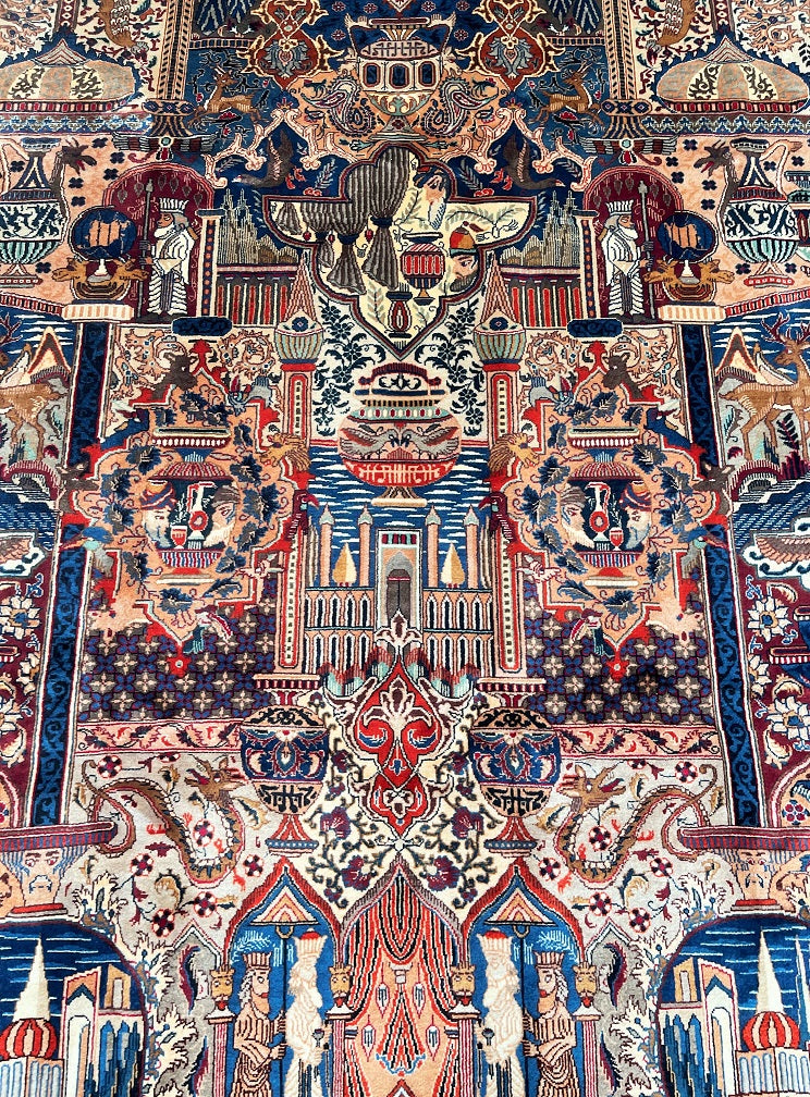 Full Room Size Authentic Hand Knotted Persepolis Persian Kashmar Carpet. Above All It Is Hard To Get Find Handmade Rug In Such Unique Pattern. Pure Lamb’s Wool Pile On Cotton Base. It Also Has A Blue Background Dyed Using Traditional Methods.