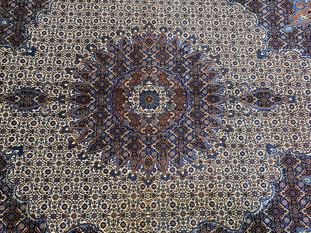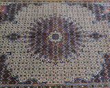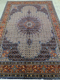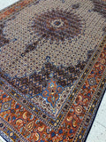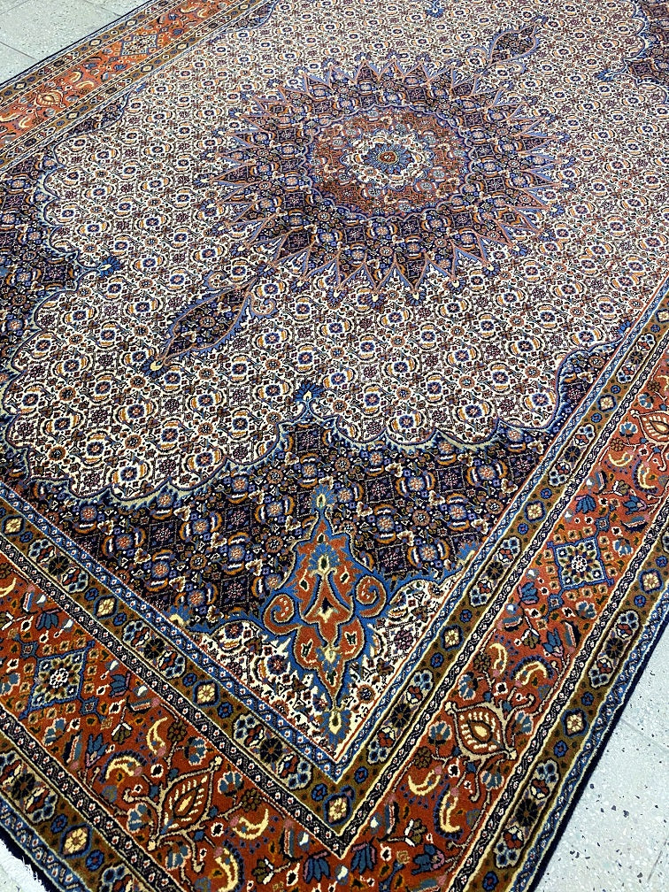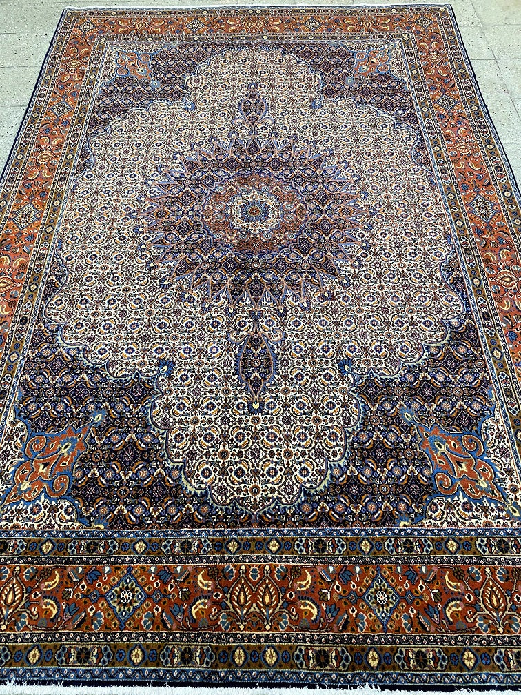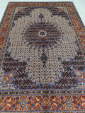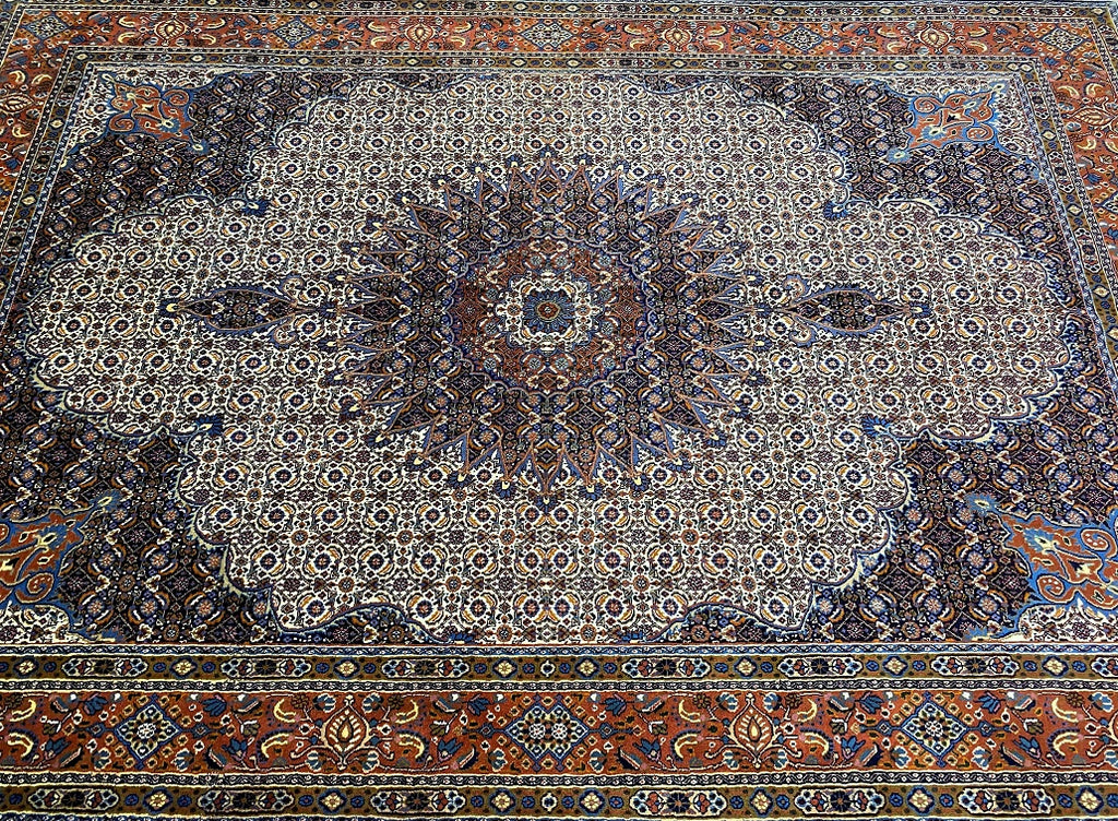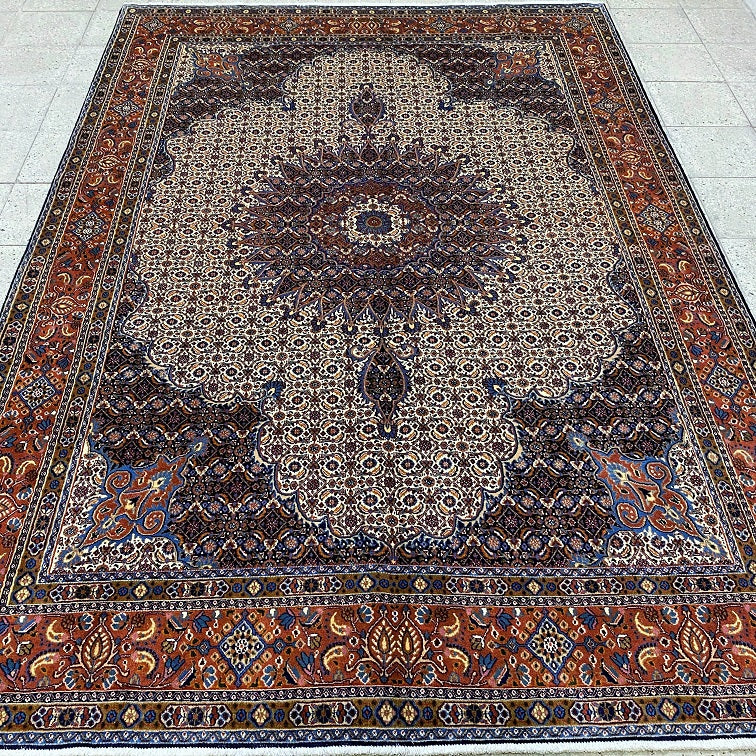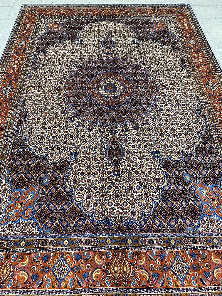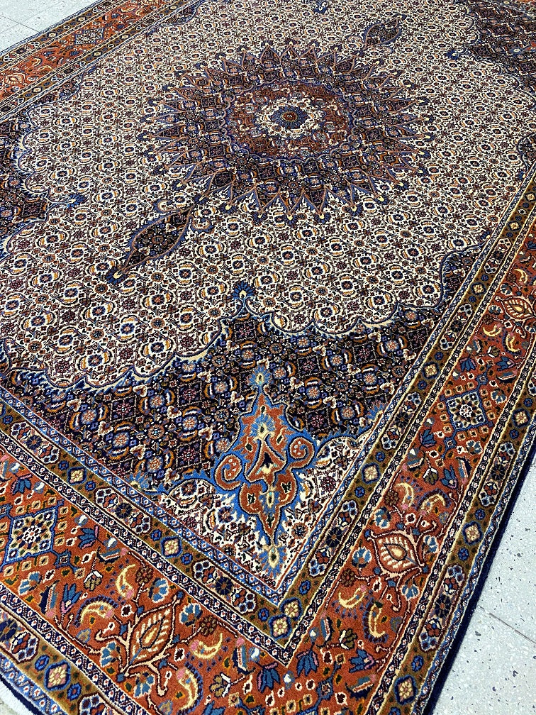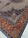 Full Room Size Fish Design Authentic Hand Knotted Persian Birjand Rug. Above All It Is Hard To Find This Quality Original Handmade In Room Size Rugs. Lamb’s Wool And Silk inlaid Pile On Fine Cotton Base. Beige, Indigo Blue And Terracotta Tone Dyed Using Traditional Methods. Pin Point Quality Rug That Would Add Instant Style to Any Room.