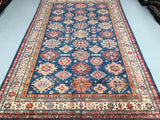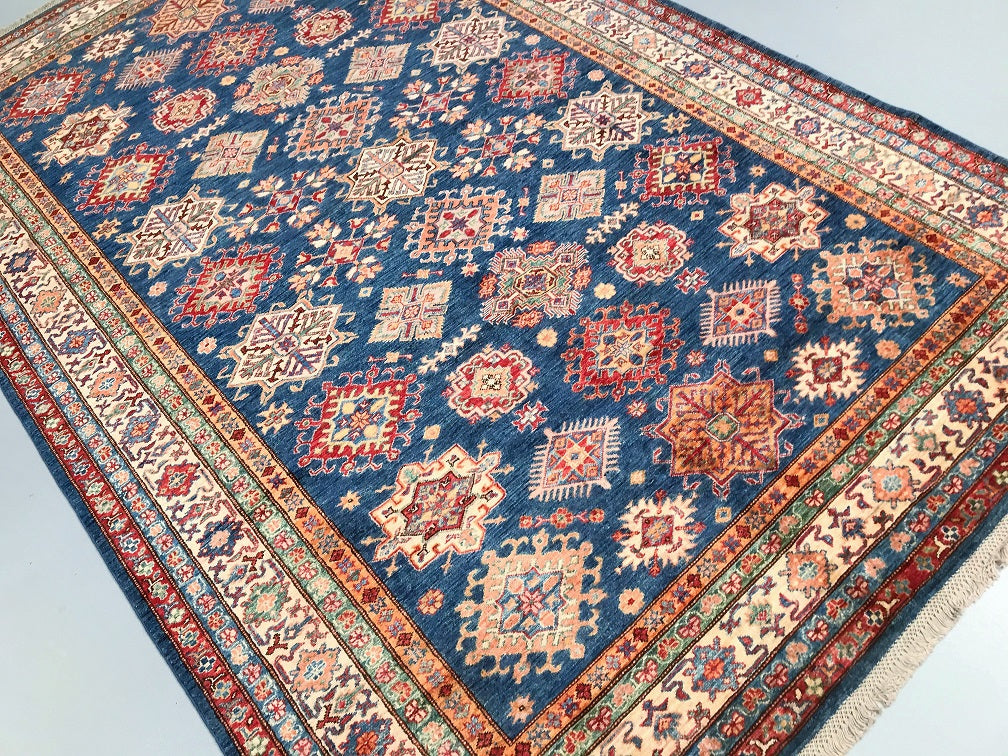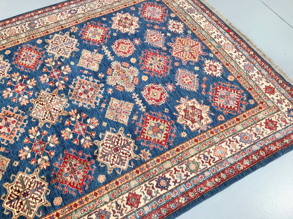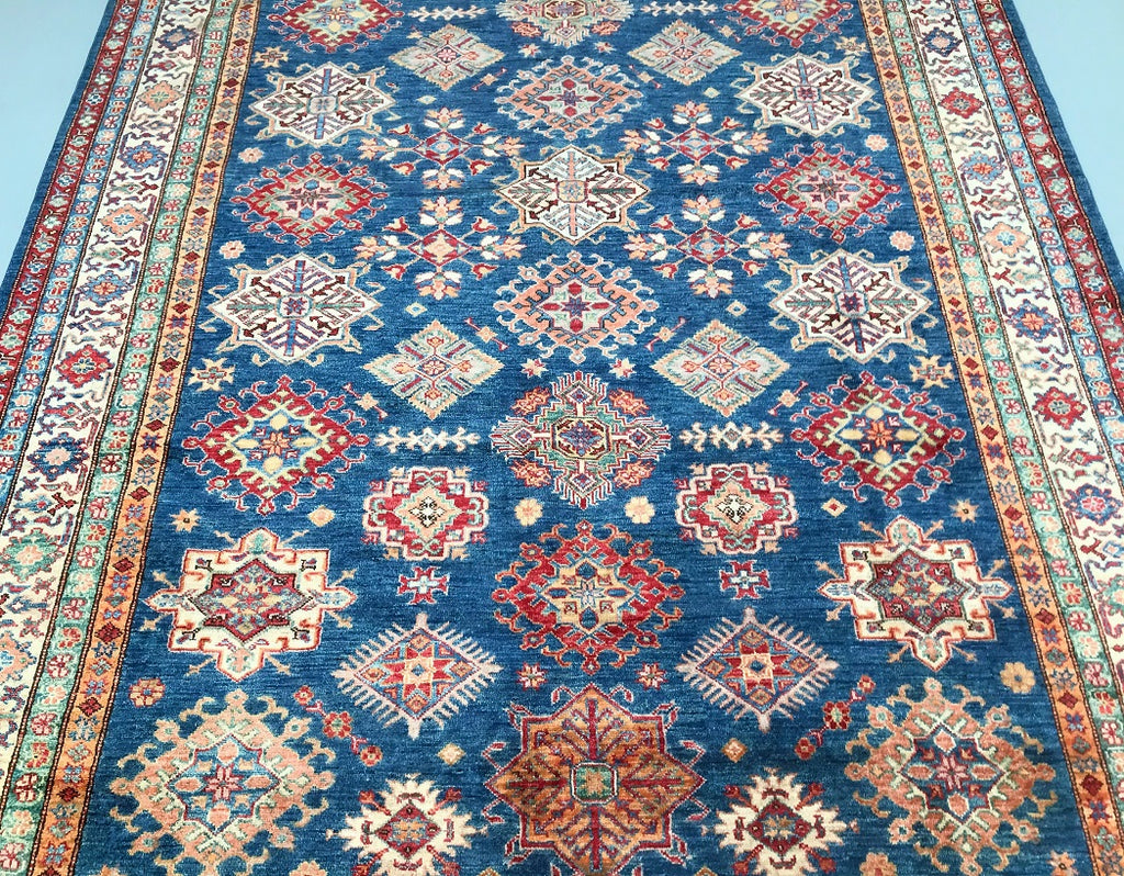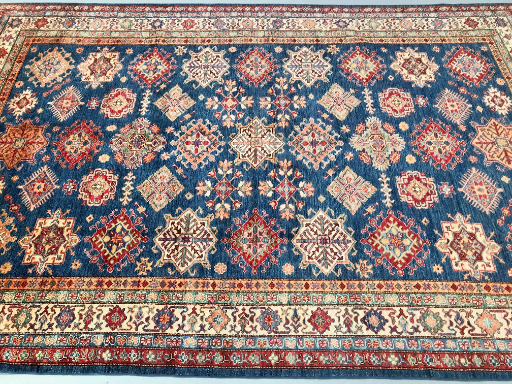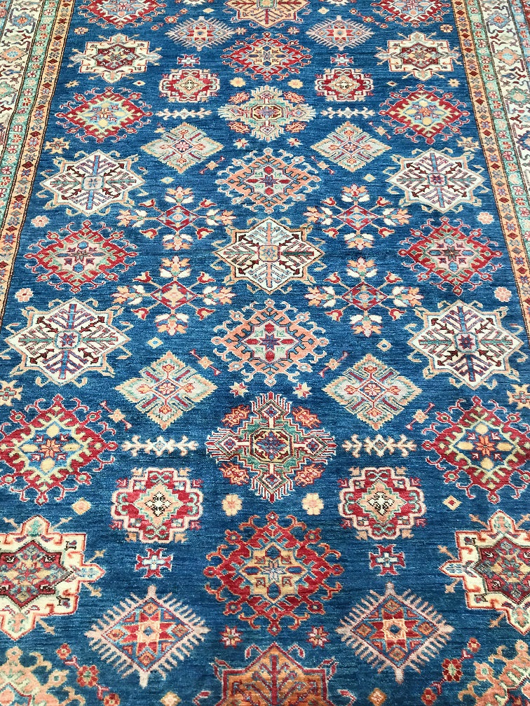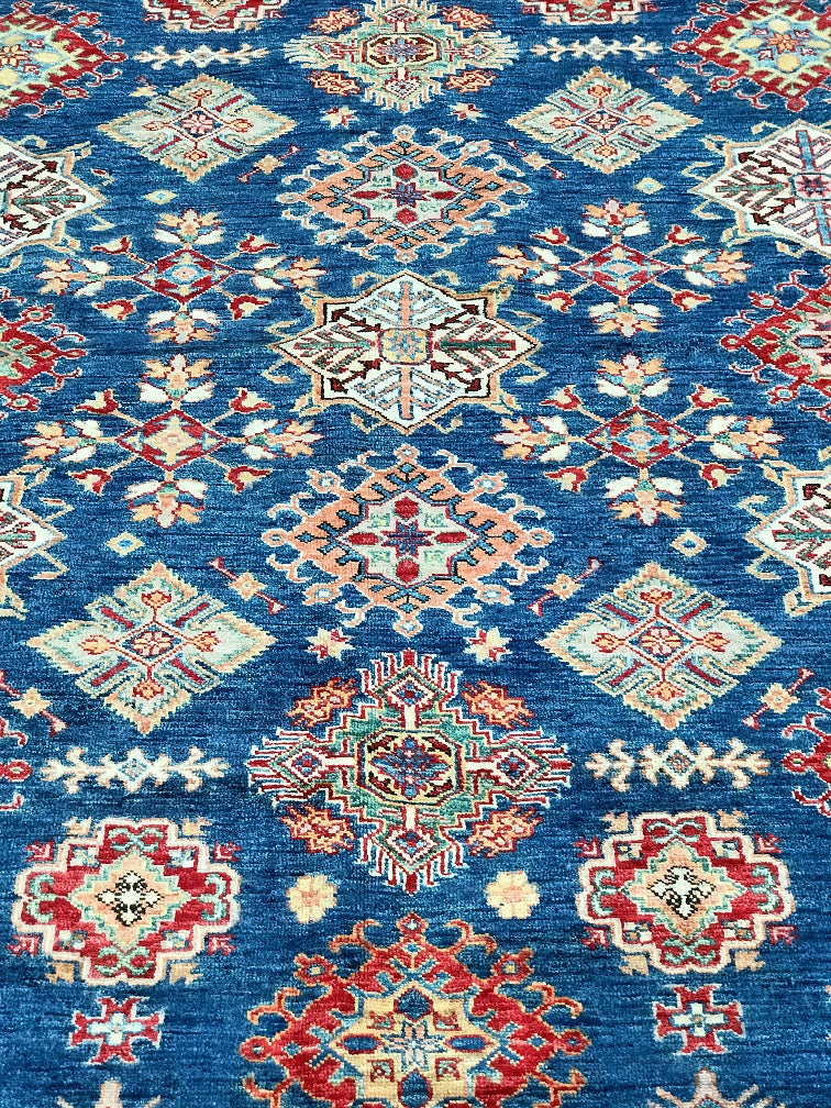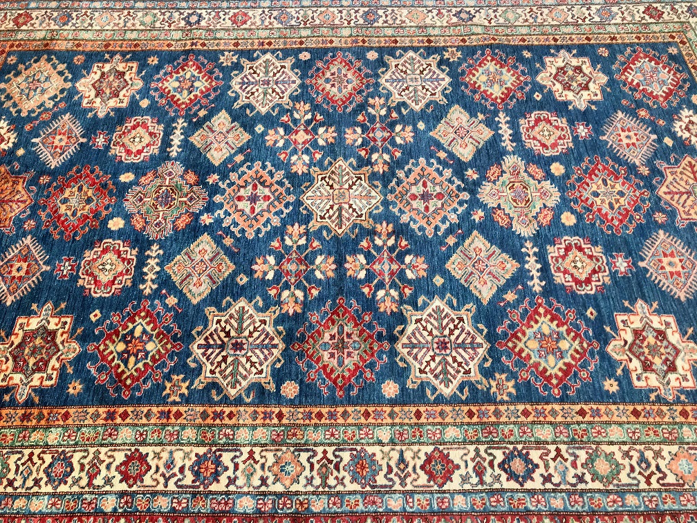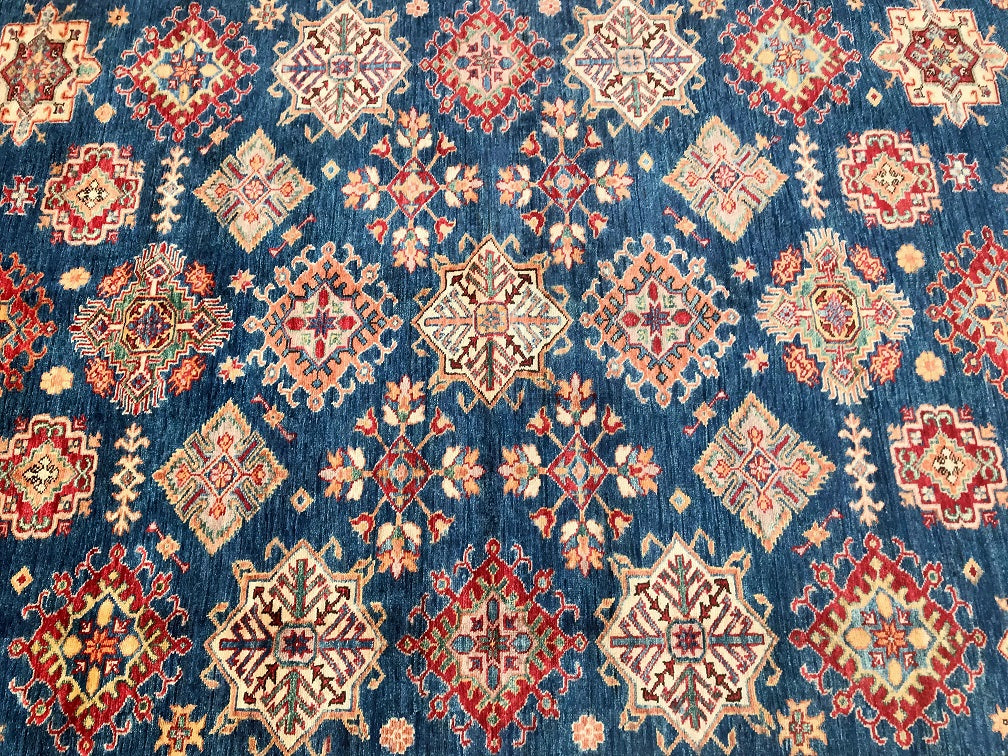 Exquisite Full Room Size Hand Knotted Afghan Super Kazak Rug. Above All This Quality of Kazak Rugs Are Rare And Are Made Using Merino Wool Pile on Cotton Base. Classic Blue Tone Dyed Using Traditional Methods (Vegetable Dyes). Last of True Woven Nomadic Art.