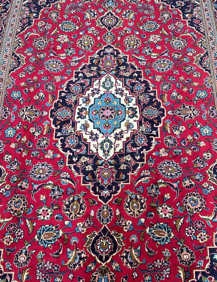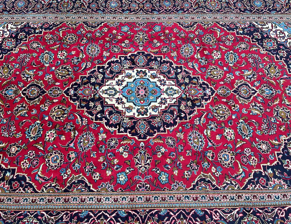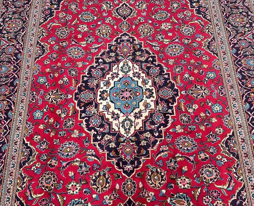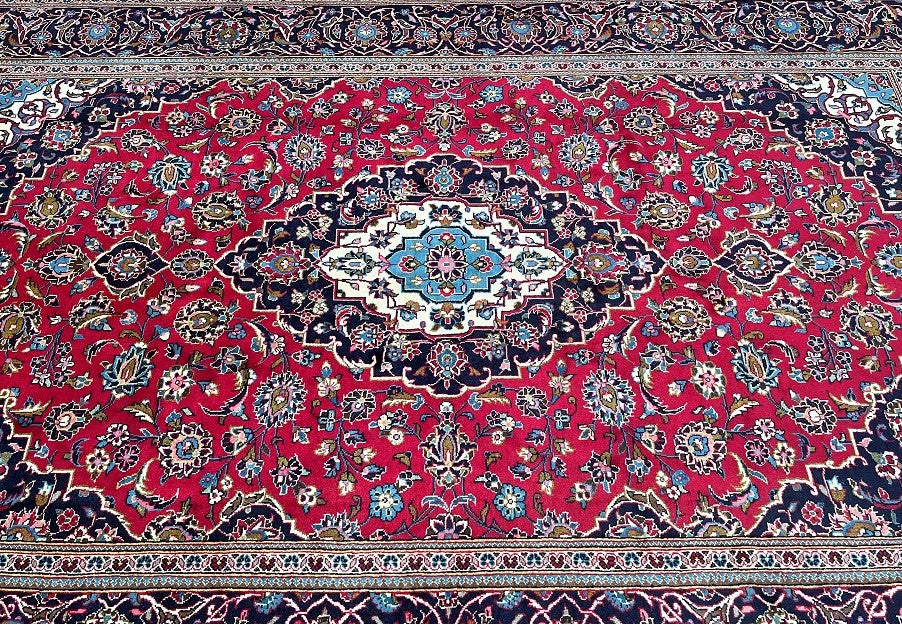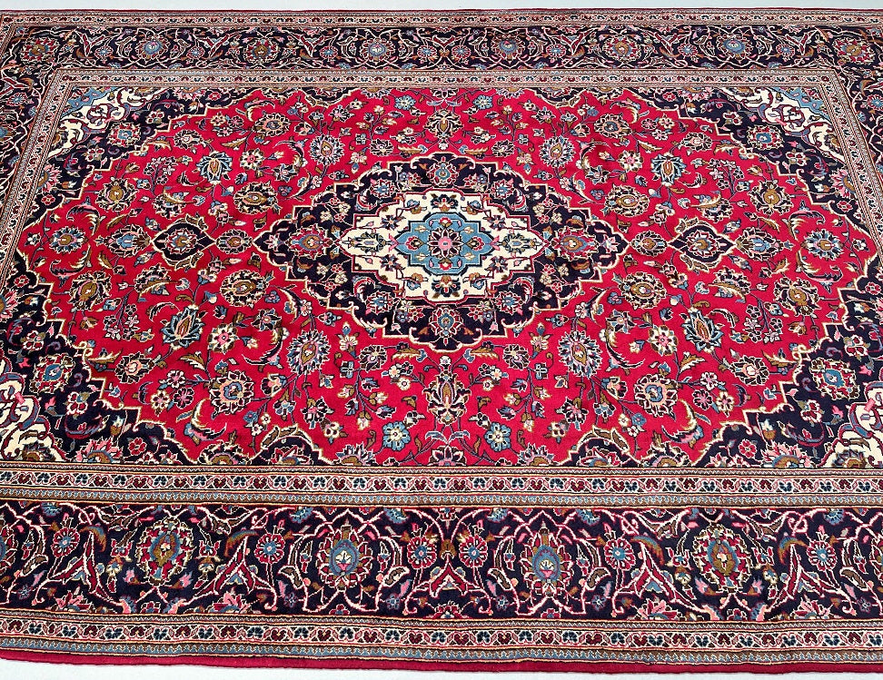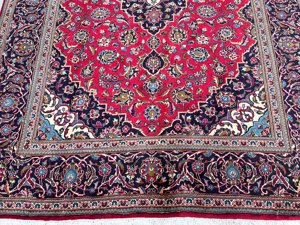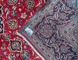 Dense Quality Full Room Size Authentic Handmade Persian Kashan Carpet. Above All It Is Hard To Get This Quality Original Handmade Rug In Larger Sizes. Also It Has Pure Lamb’s Wool Pile On Cotton Base. Soft Red, Beige, Light Blue, Mustard And Indigo Blue Tones Dyed Using Traditional Methods.