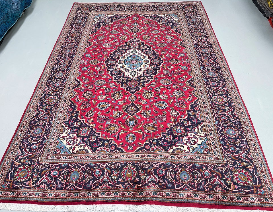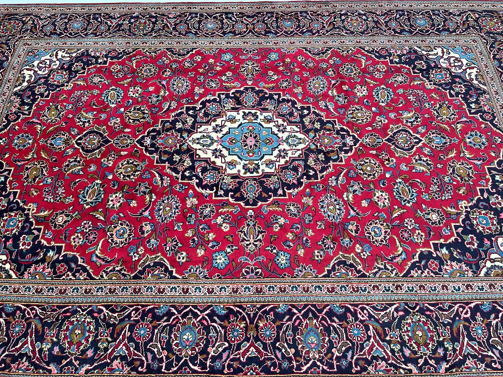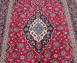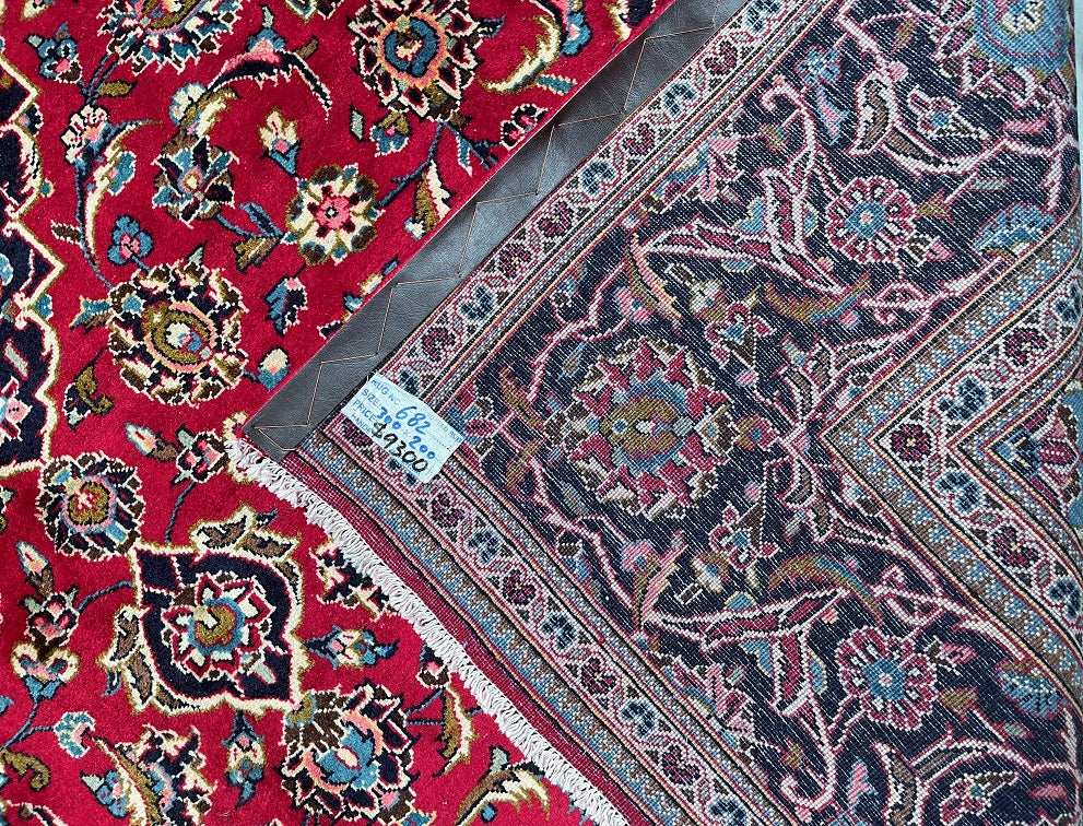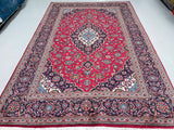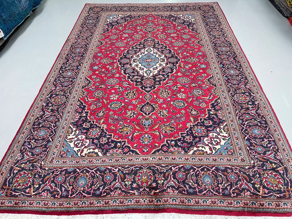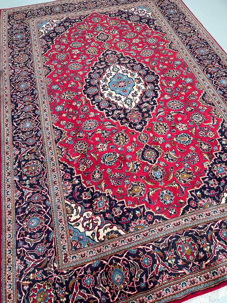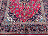 Dense Quality Full Room Size Authentic Handmade Persian Kashan Carpet. Above All It Is Hard To Get This Quality Original Handmade Rug In Larger Sizes. Also It Has Pure Lamb’s Wool Pile On Cotton Base. Soft Red, Beige, Light Blue, Mustard And Indigo Blue Tones Dyed Using Traditional Methods.