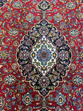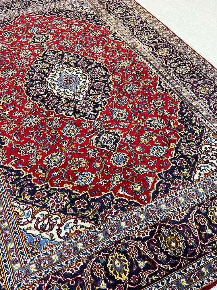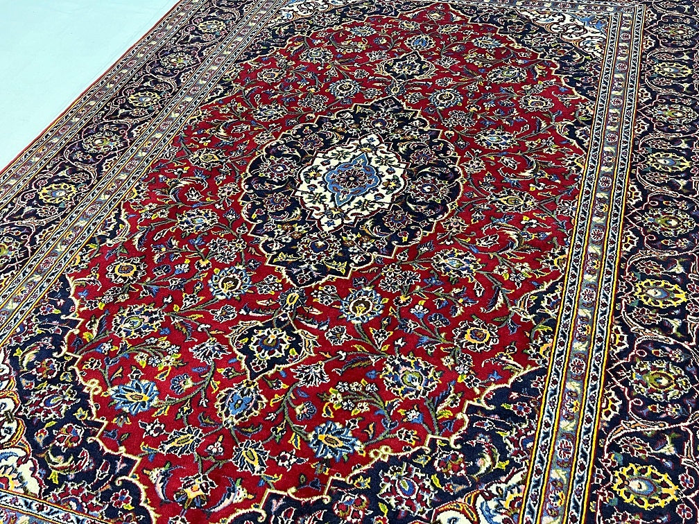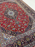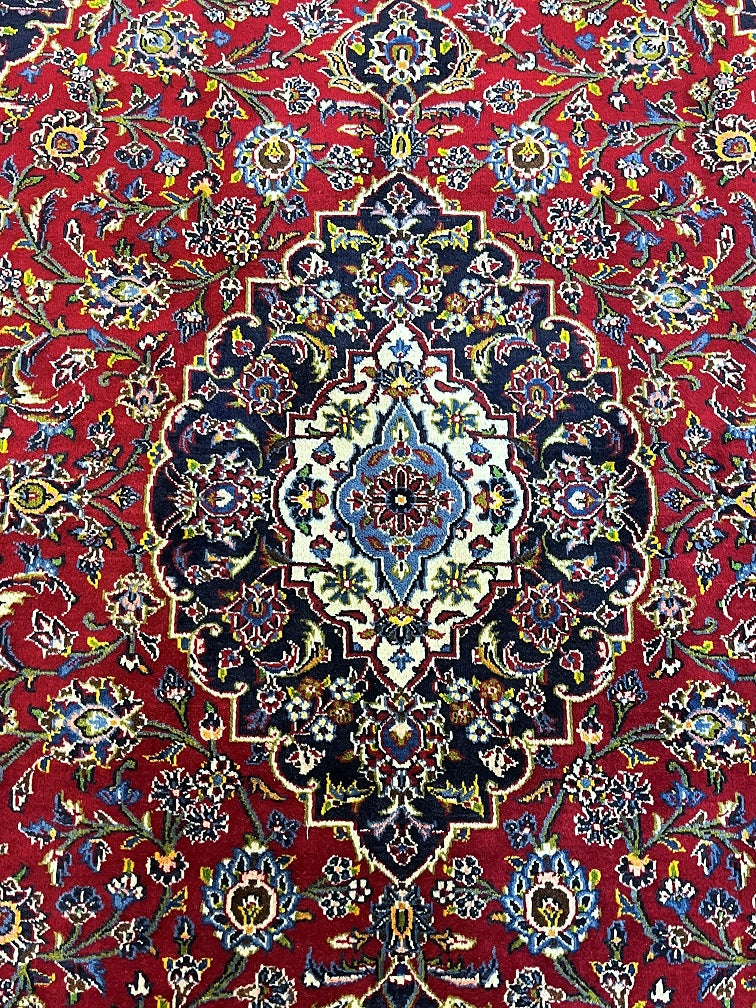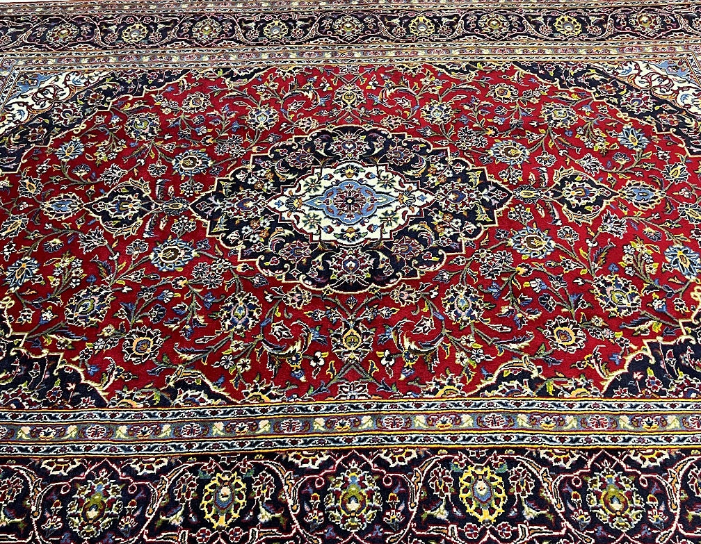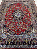 Full Room Size Authentic Handmade Persian Kashan Carpet. Above All It Has A Pure Lamb’s Wool Pile On Cotton Base. Maroon Red, Indigo Blue, Light Blue, Green, Yellow and Beige Tone Dyed Using Traditional Methods.