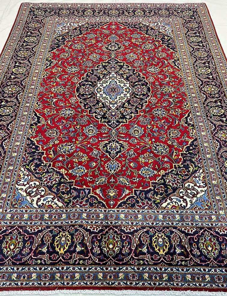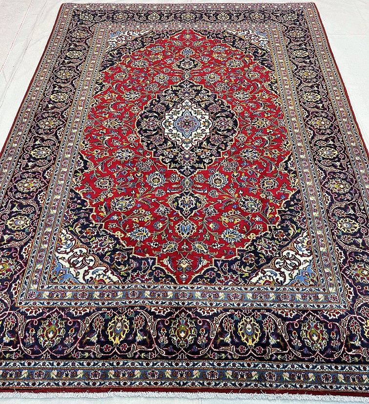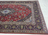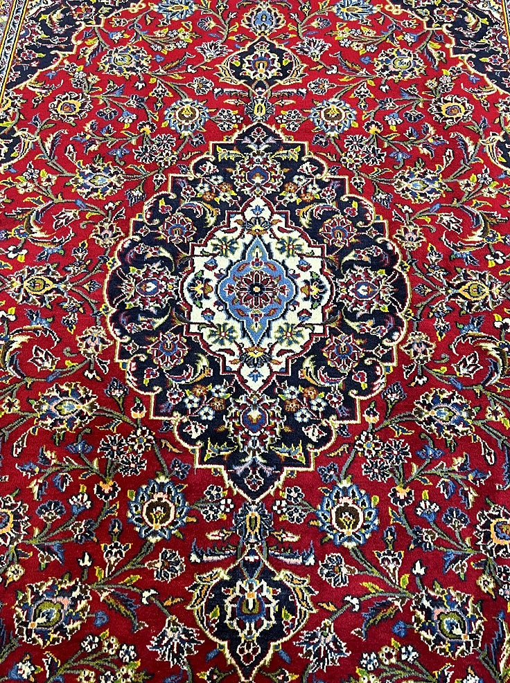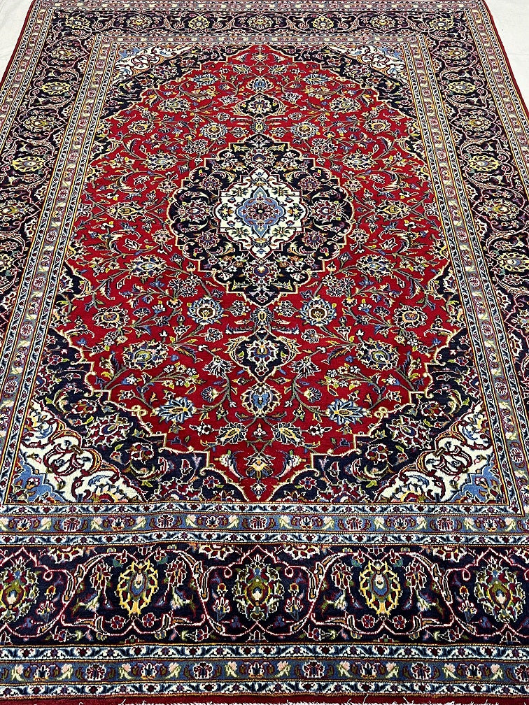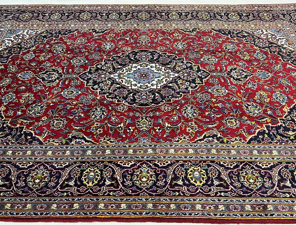Full Room Size Authentic Handmade Persian Kashan Carpet. Above All It Has A Pure Lamb’s Wool Pile On Cotton Base. Maroon Red, Indigo Blue, Light Blue, Green, Yellow and Beige Tone Dyed Using Traditional Methods.