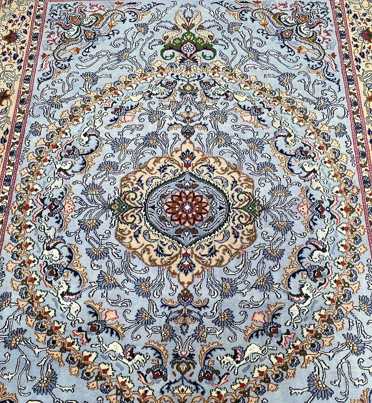 Rare Full Room Size Authentic Persian Birjand Mood Rug. First Of All It Is Hard To Find This Design in Large Room Size Handmade Rugs. It Also Has A Lamb’s Wool And Silk Highlights Pile on Fine Cotton. It Also Have A Light Blue/Aqua Tone Dyed Using Traditional Methods.