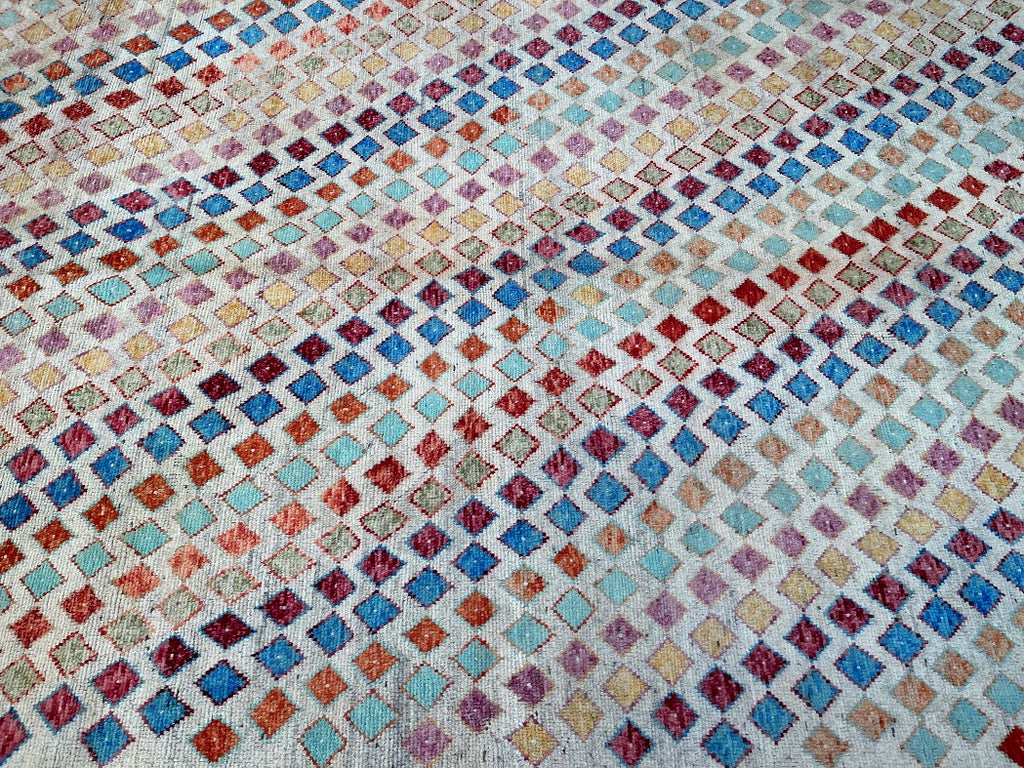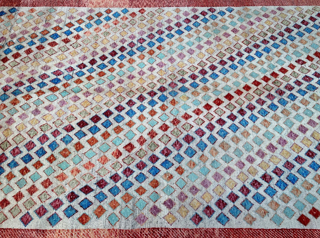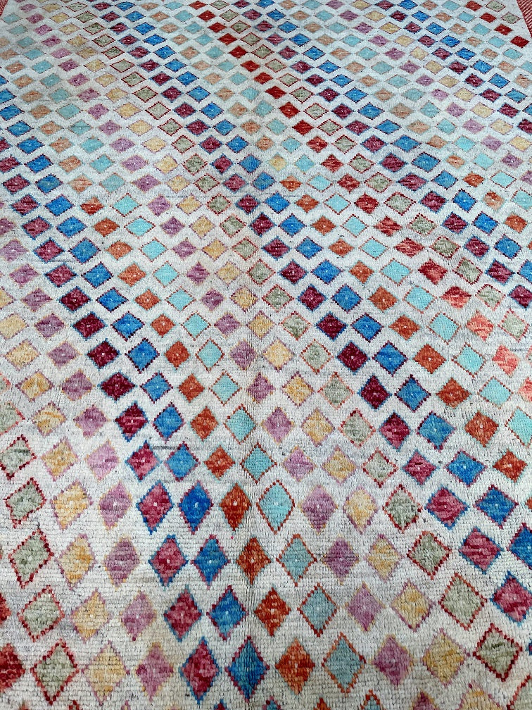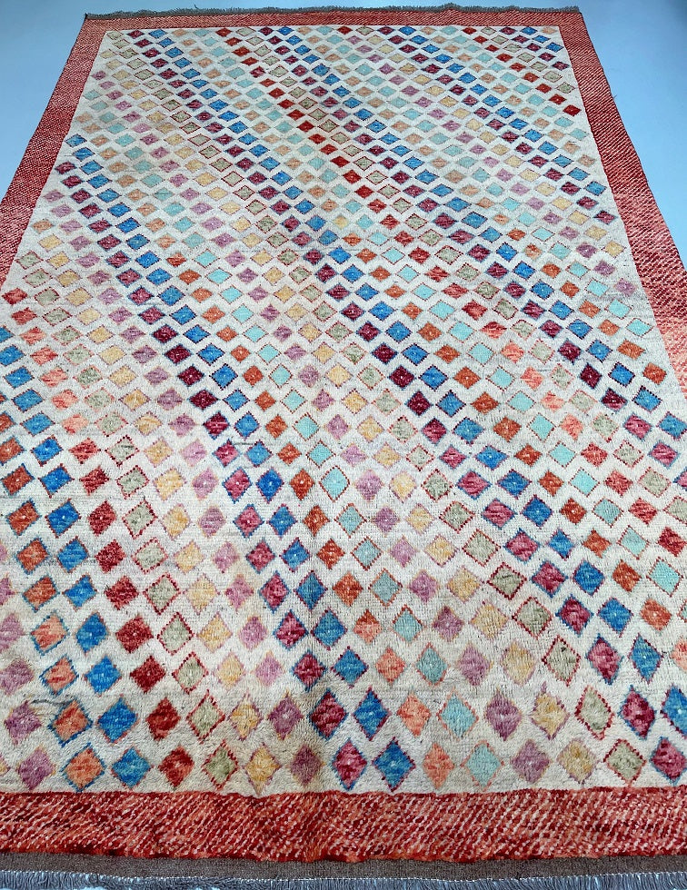 Full Room Size Moroccan Style Hand Knotted Afghan Gabbeh Rug. Above All It Has A Wool Pile On Wool Base. Multi-Color Tone Dyed Using Traditional Methods. Last of True Woven Nomadic Art.