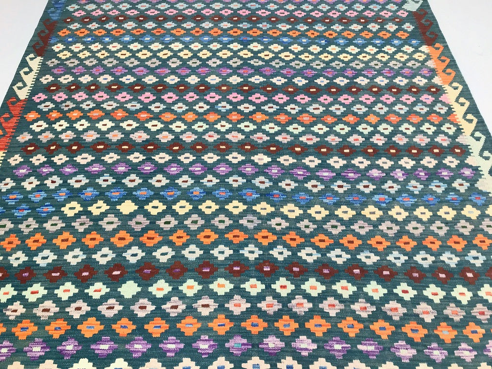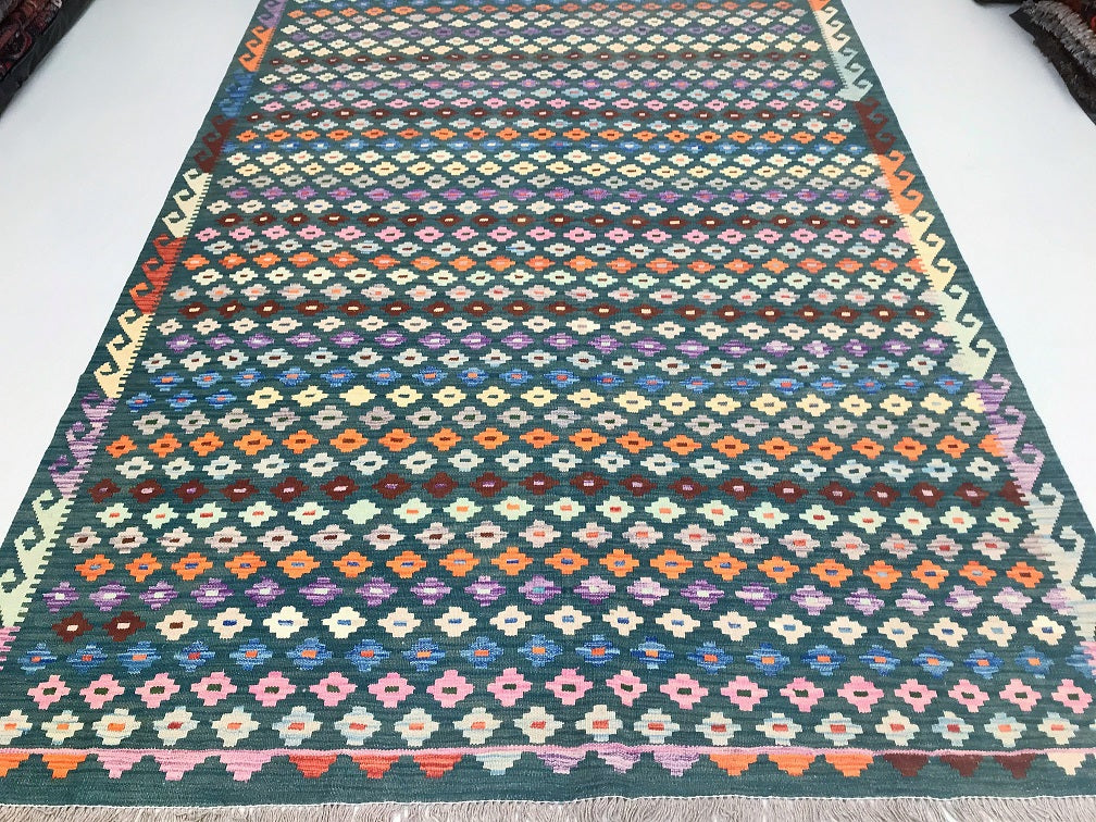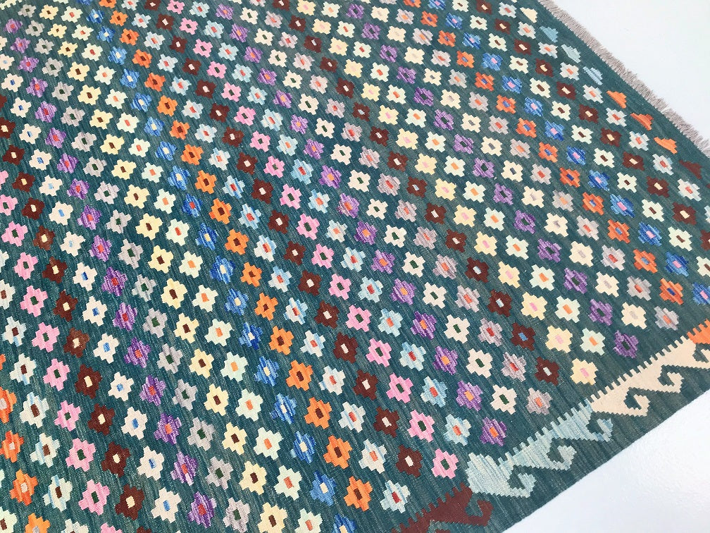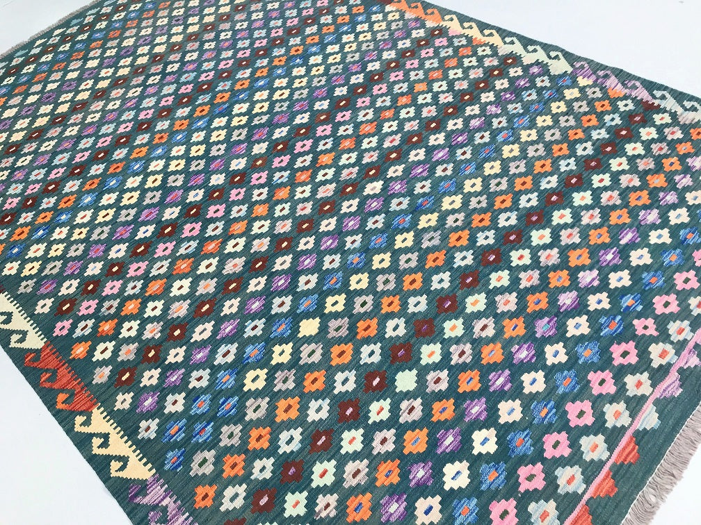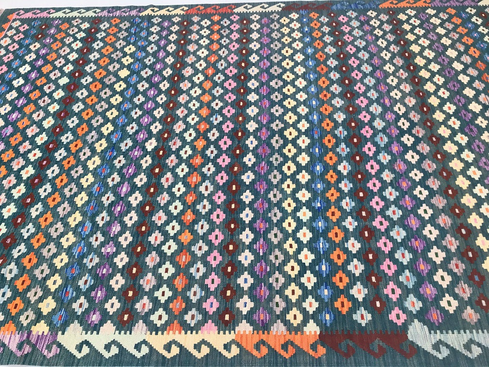 Full Room Size Hand Woven Afghan Kyber Kilim Rug. Above All It Is Reversible. It Also Has A Pure Hand Spun Wool Pile On Wool Base. Army Green Background Dyed Using Vegetable Dyes.