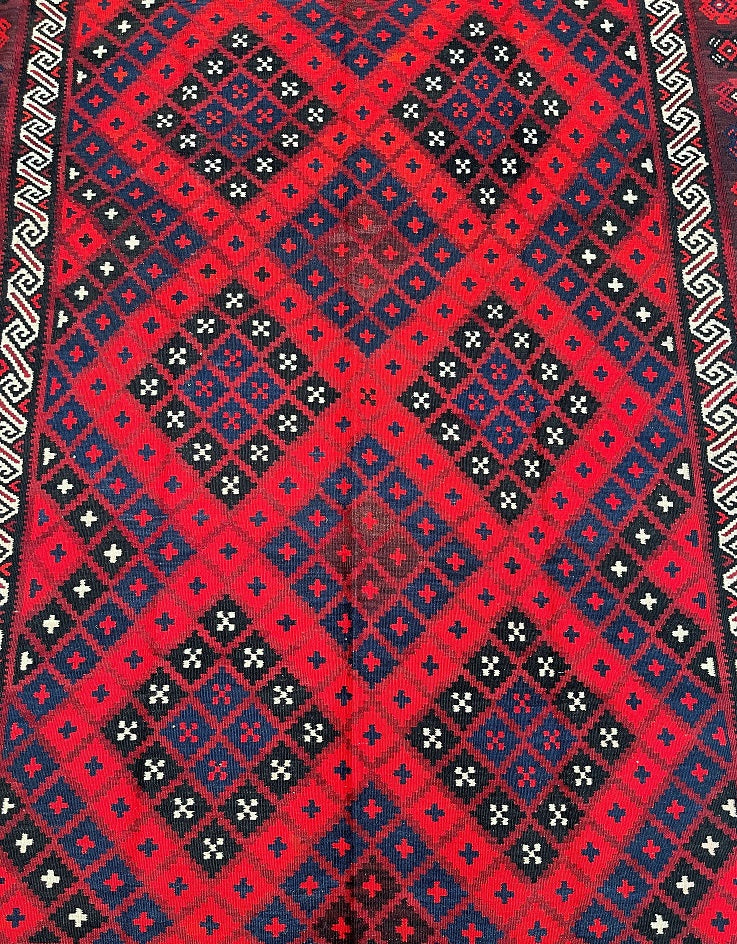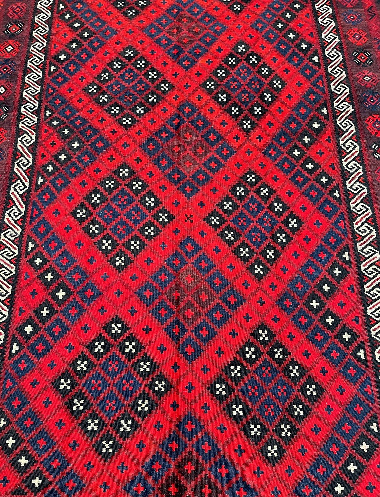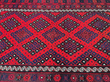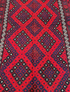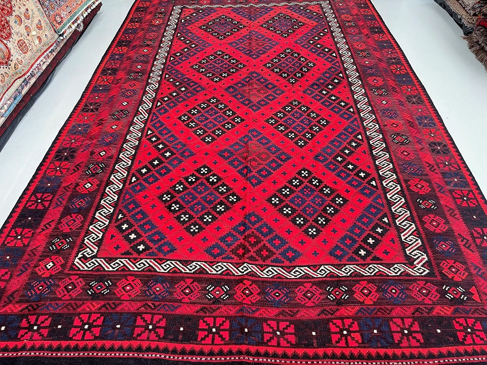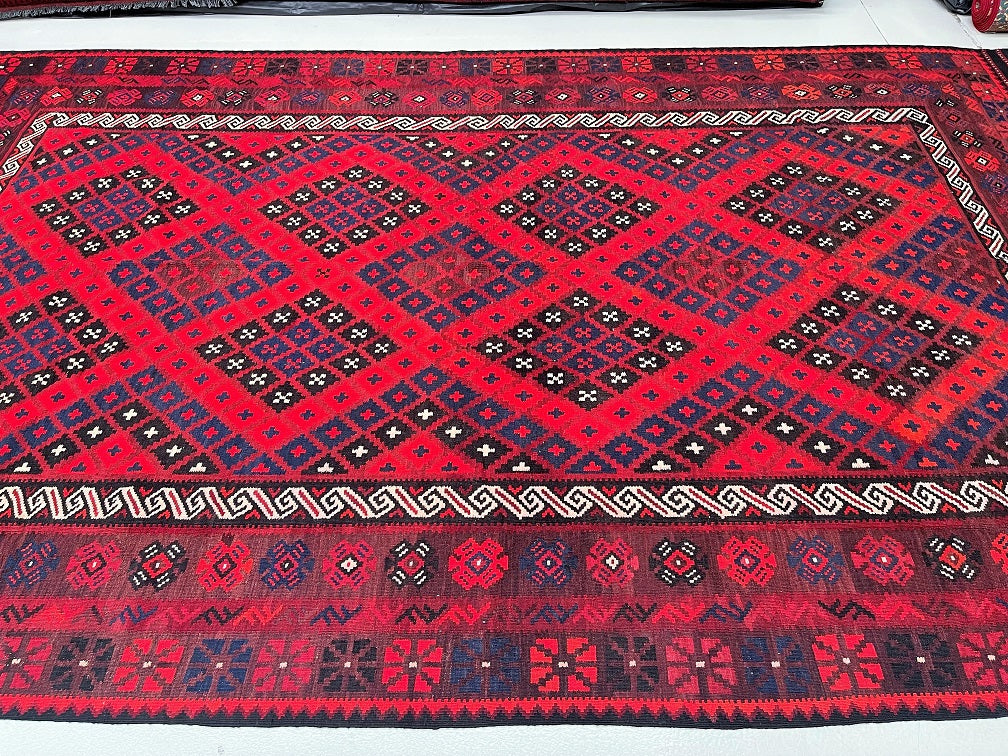Large Room Size Tribal Hand Woven Afghan Meymaneh Kilim Rug. Ideal for Lounge or Dining Room. It Also Has A Pure Hand Spun Wool Pile On Wool Base. Red, Black, With A Hint of Indigo Blue Tone Dyed Using Traditional Methods.