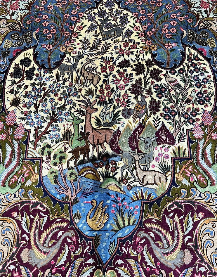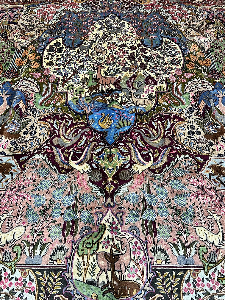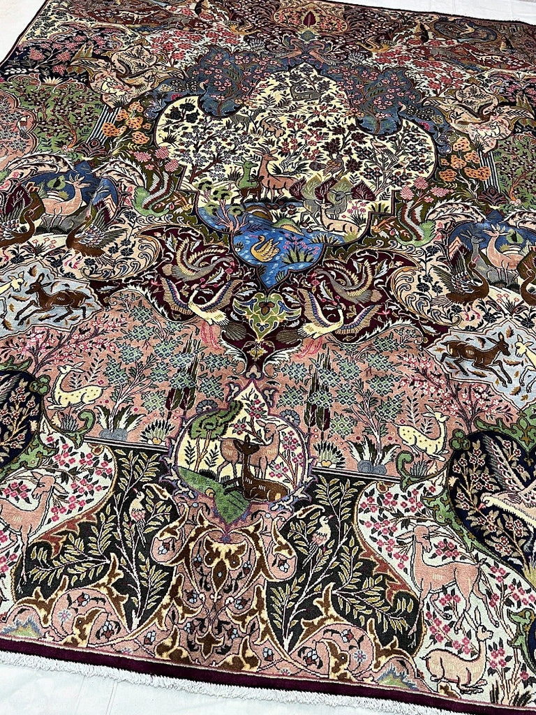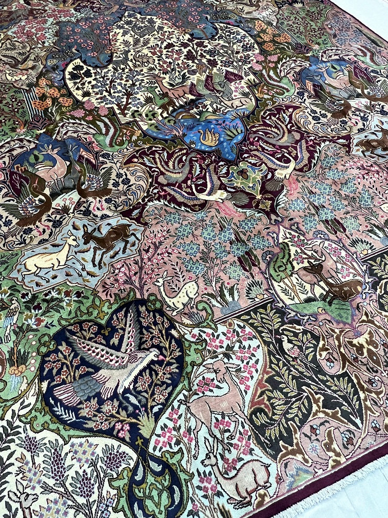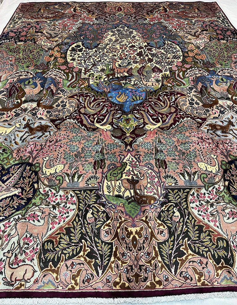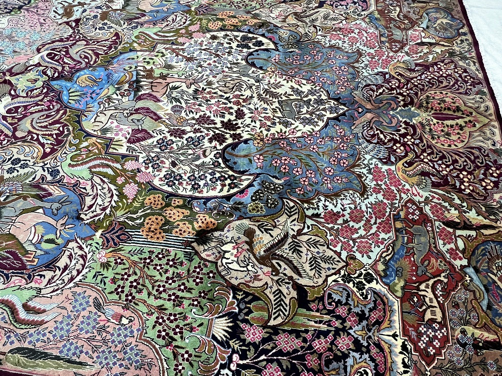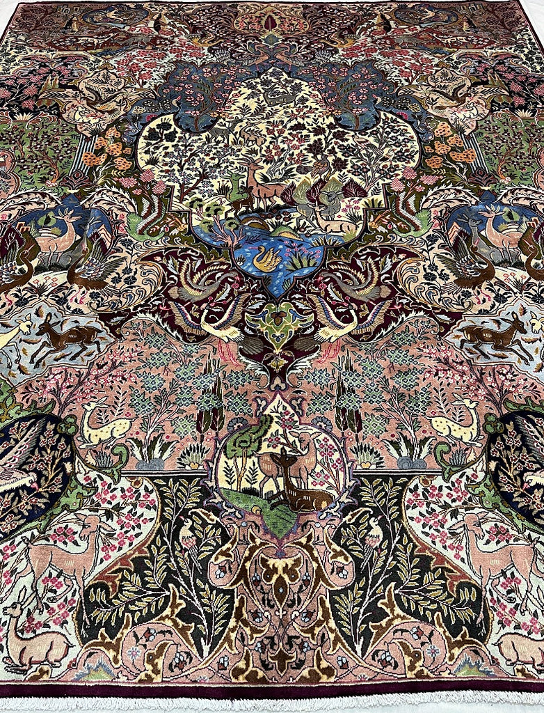 Superb Massive Room Size Authentic Hand Knotted Persian Kashmar Rug. Above All It Is Hard To Find Garden Of Paradise rugs In 4x3mm Size. It Also Has A Pure Lamb’s Wool Pile On Cotton Base. Multi-Color Tones Dyed Using Traditional Methods. It Will Look Like A Painting On The Floor.
