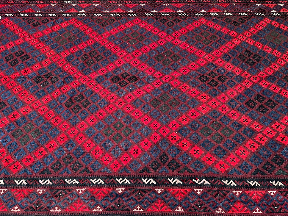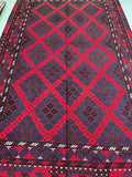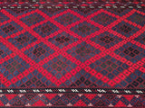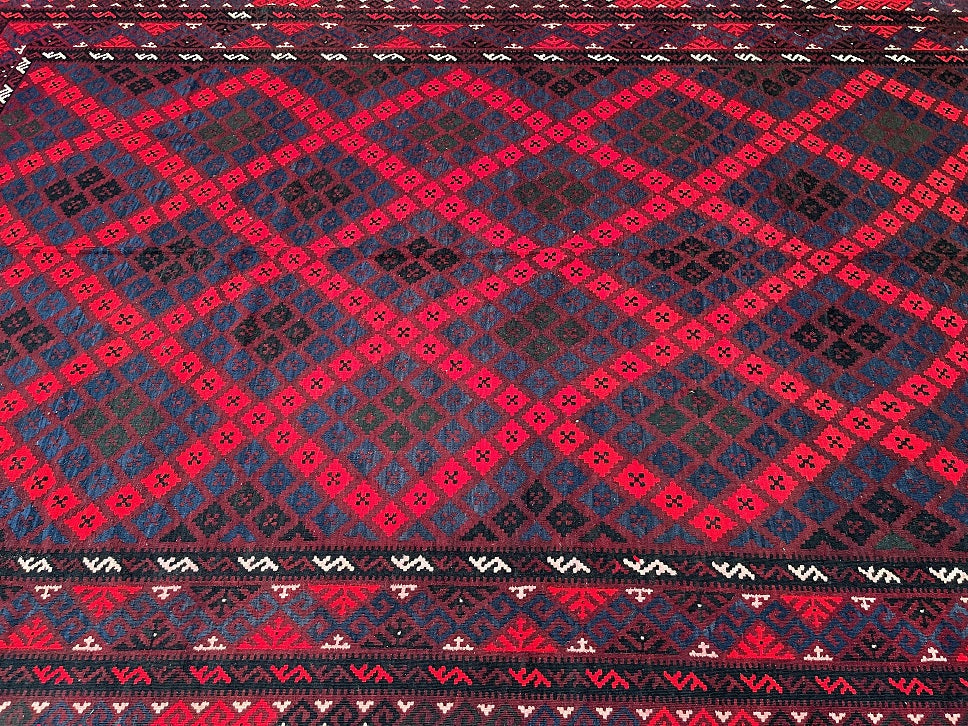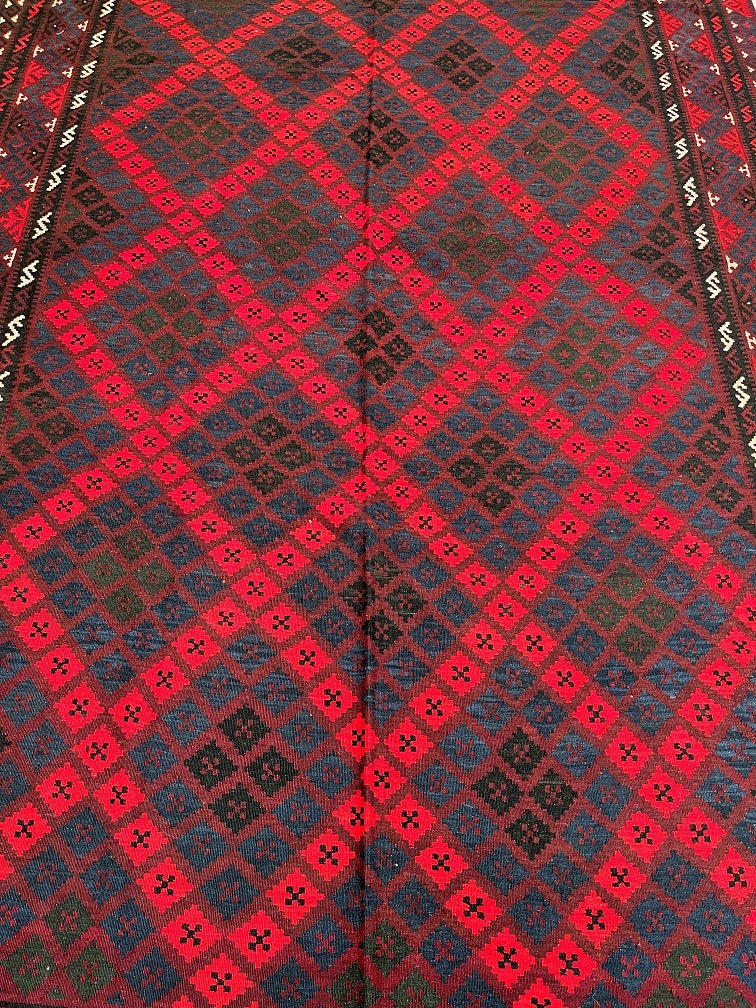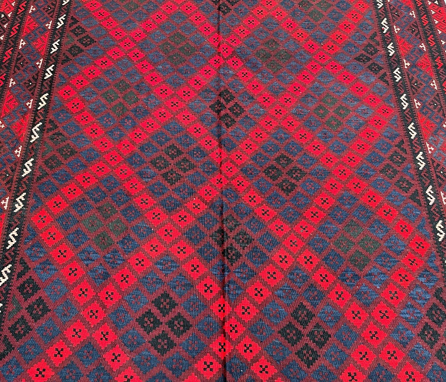Large Room Size Tribal Hand Woven Vintage Afghan Meymaneh Kilim Rug. Ideal for Lounge or Dining Room. It Also Has A Pure Hand Spun Wool Pile On Wool Base. Red, Black, White And Blue Tones Dyed Using Traditional Methods.