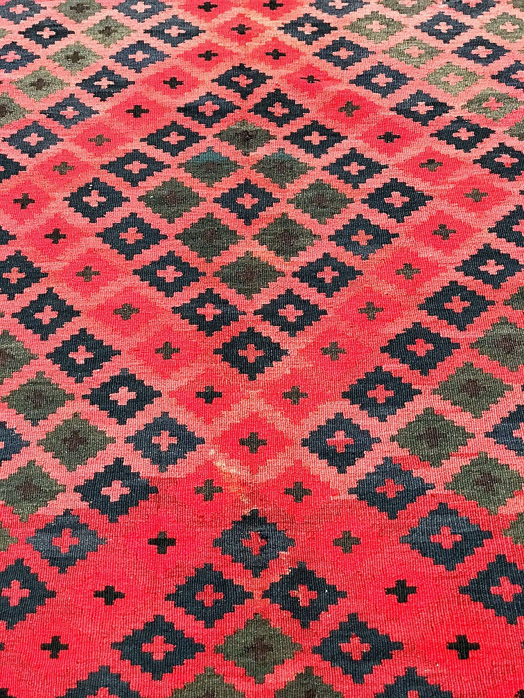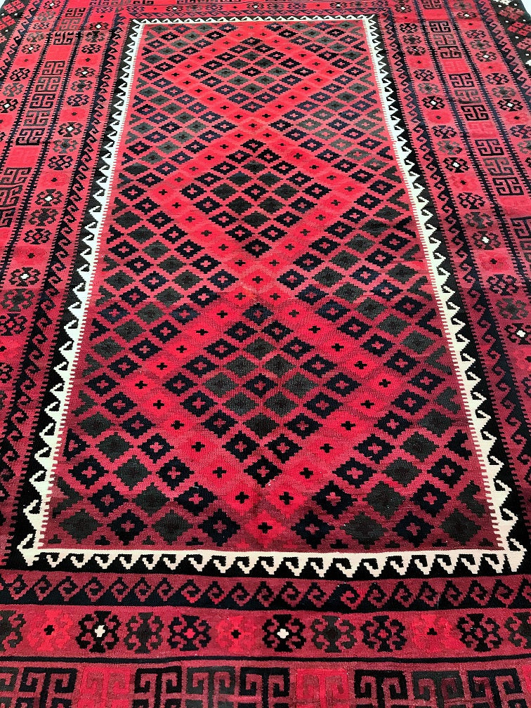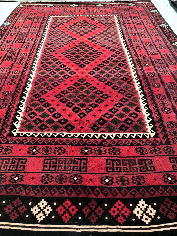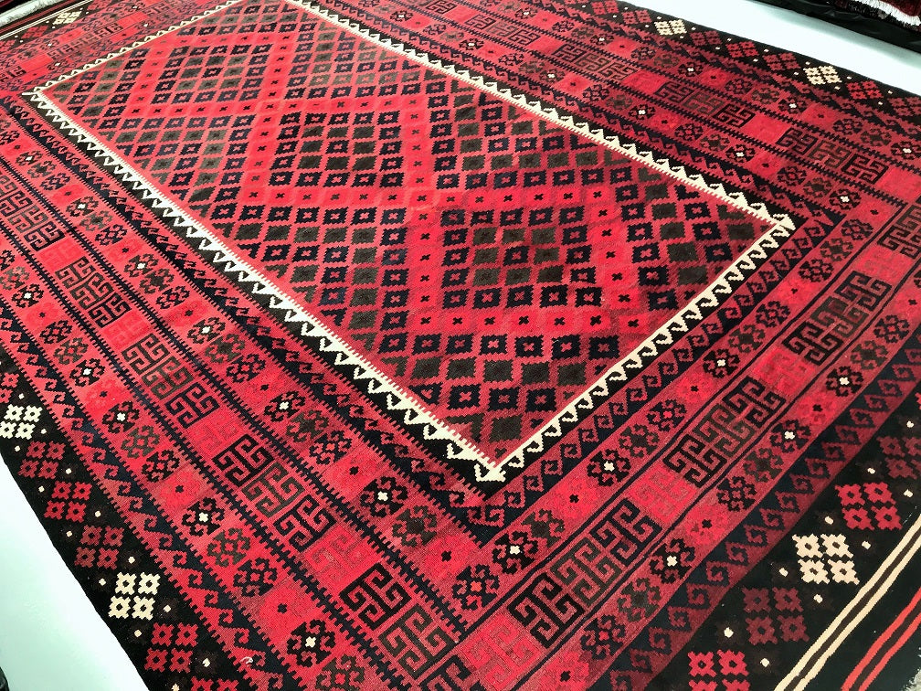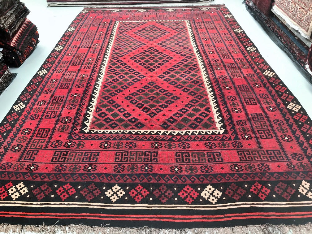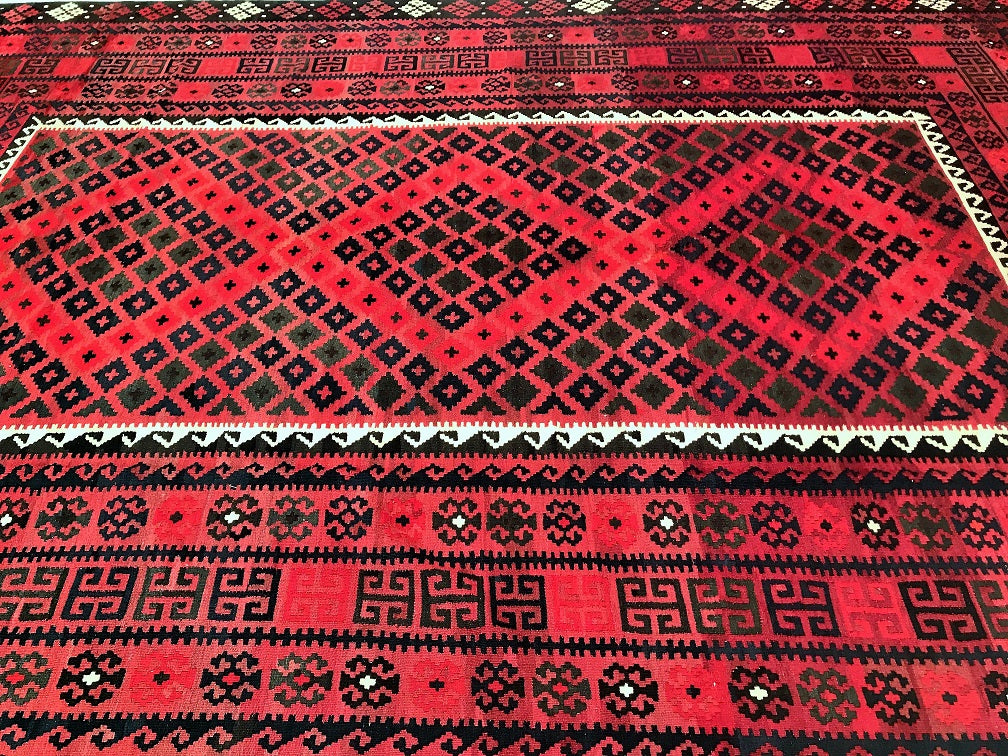 Large Room Size Vintage Hand Woven Afghan Meymaneh Kilim Rug. Ideal for Lounge or Dining Room. It Also Has A Pure Hand Spun Wool Pile On Wool Base. Oxidized Red, Black, Beige And Green Tone Dyed Using Traditional Methods.