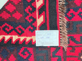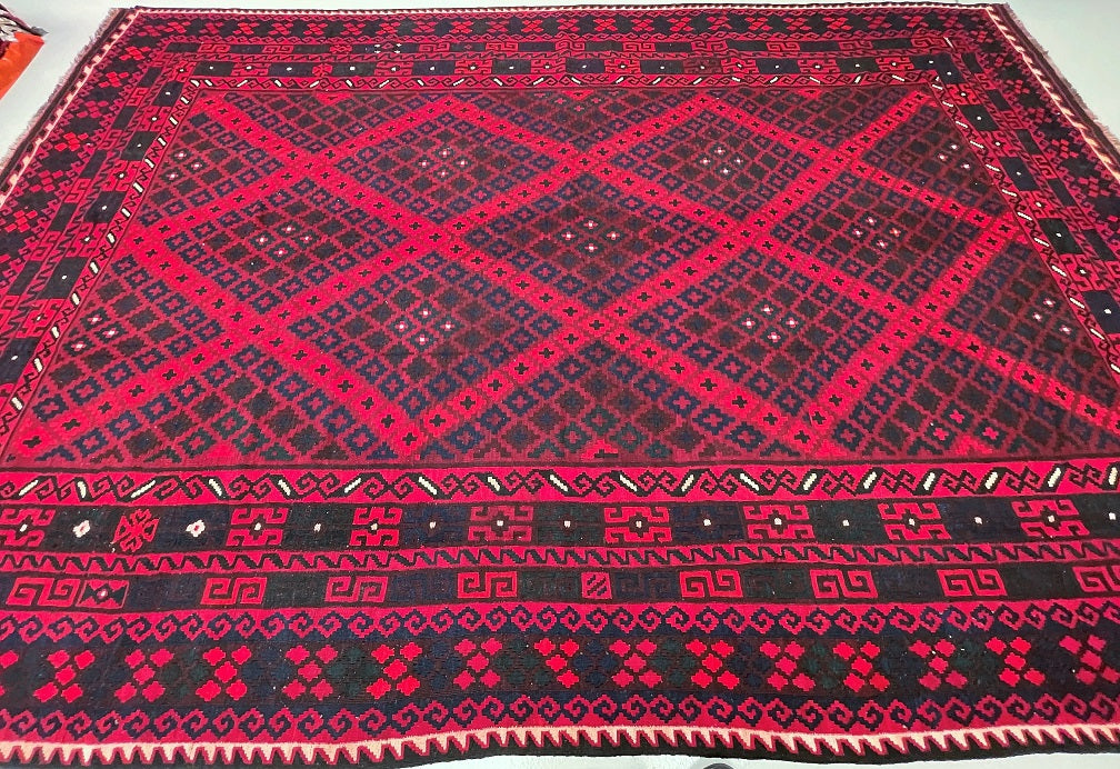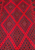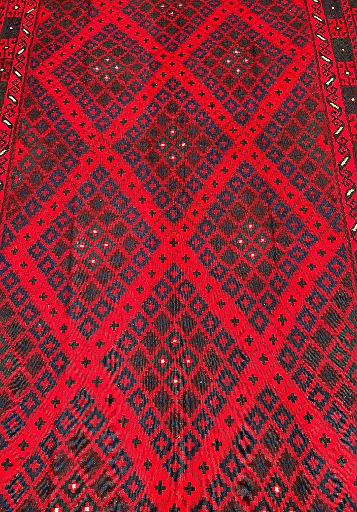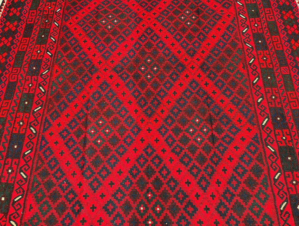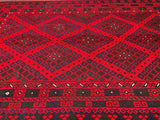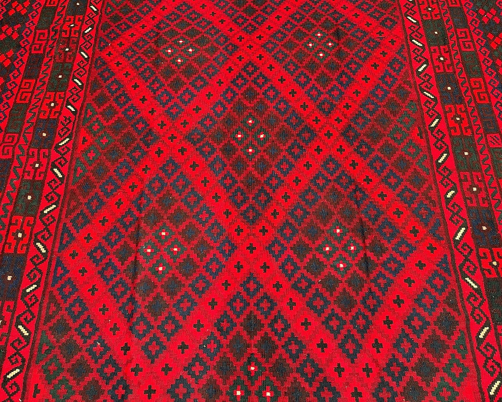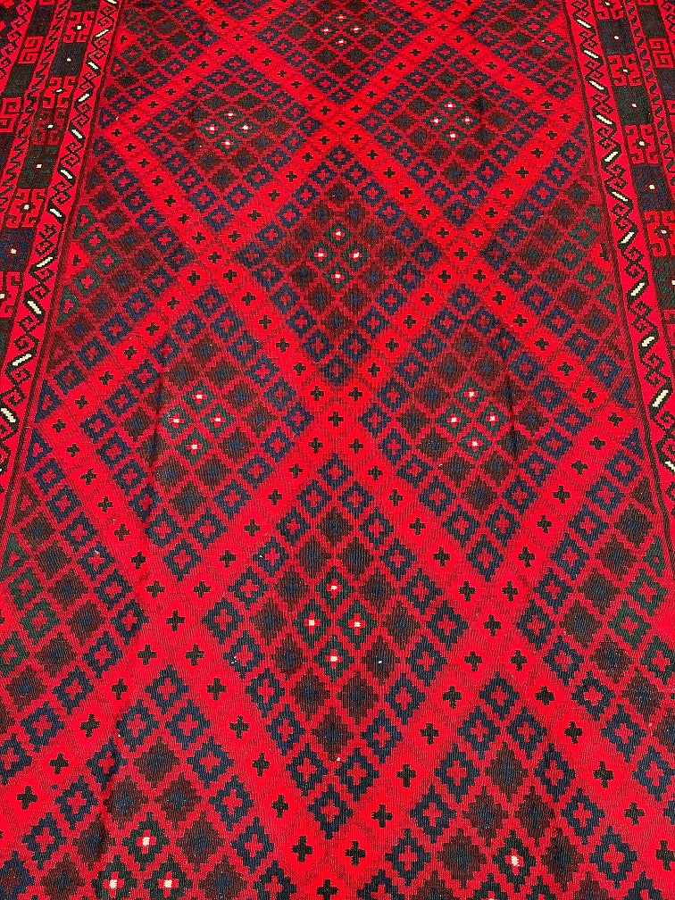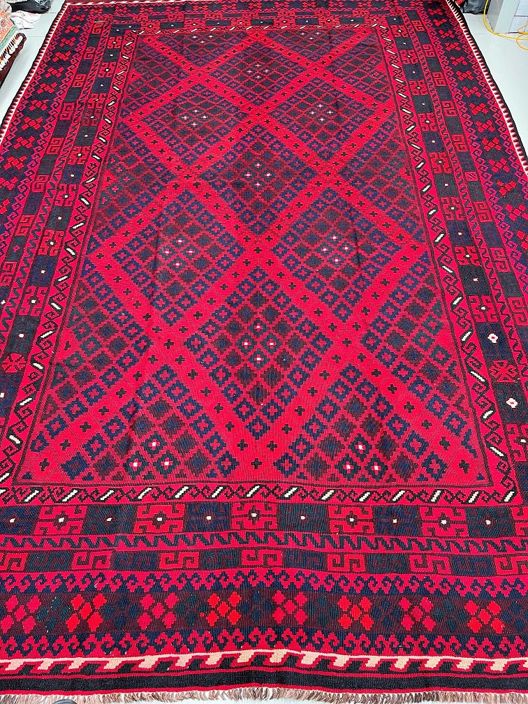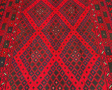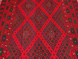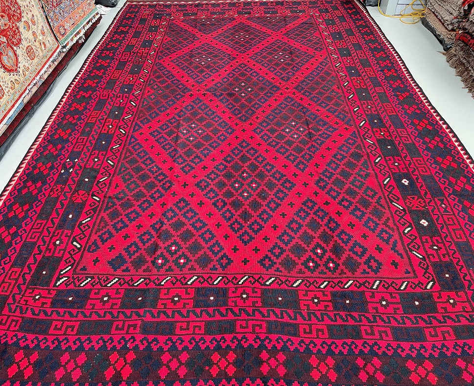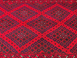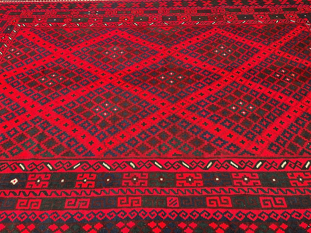 Massive Room Size Hand Woven Vintage Afghan Meymaneh Kilim Rug which is perfect for larger spaces like lounges or dining rooms. This rug is crafted with a pure hand-spun wool pile on a wool base, ensuring its durability and longevity. The color palette of this rug features rich red, black, with hints of indigo blue and green, achieved through traditional dyeing methods. This adds an authentic touch to its design.