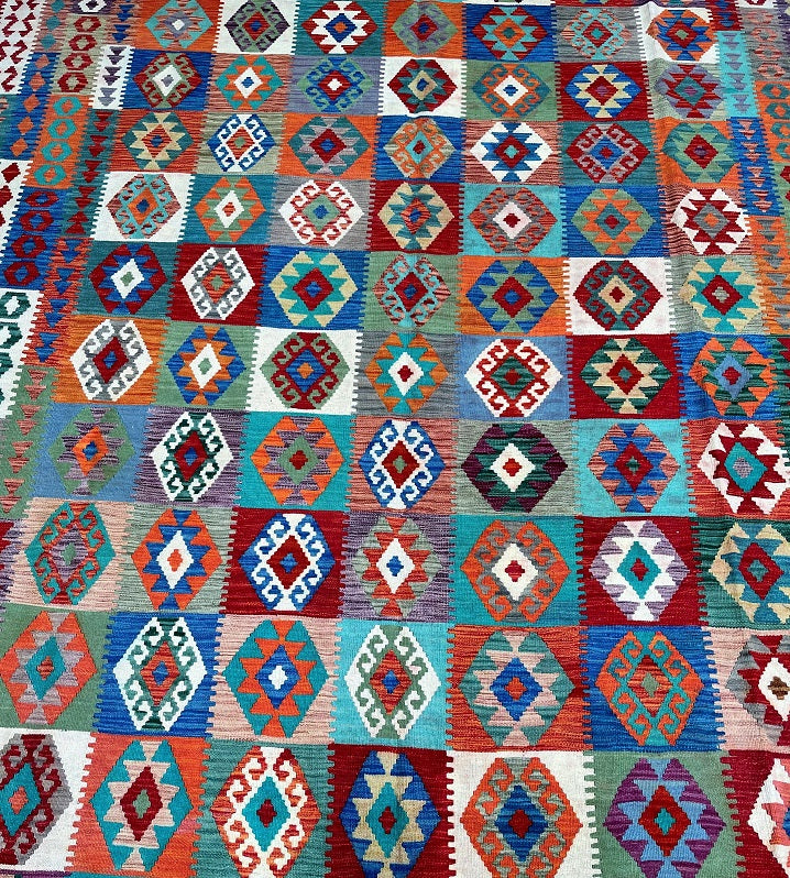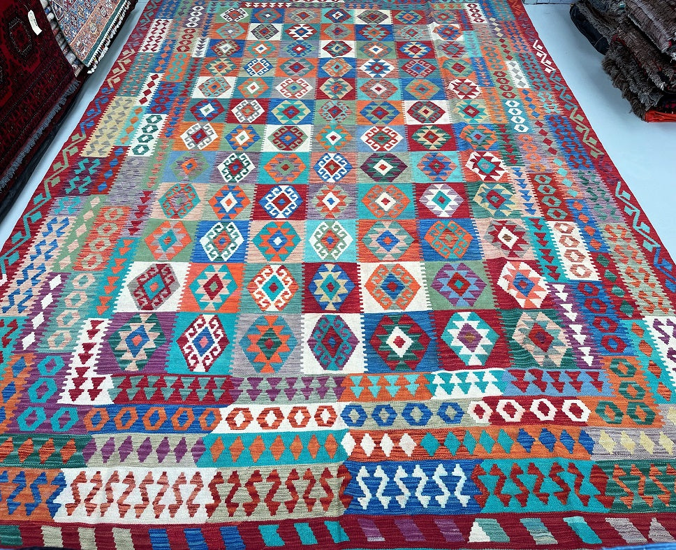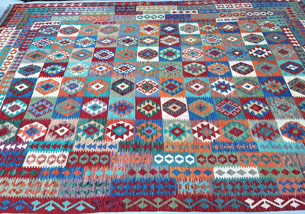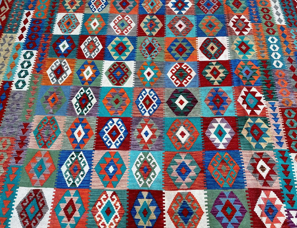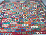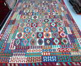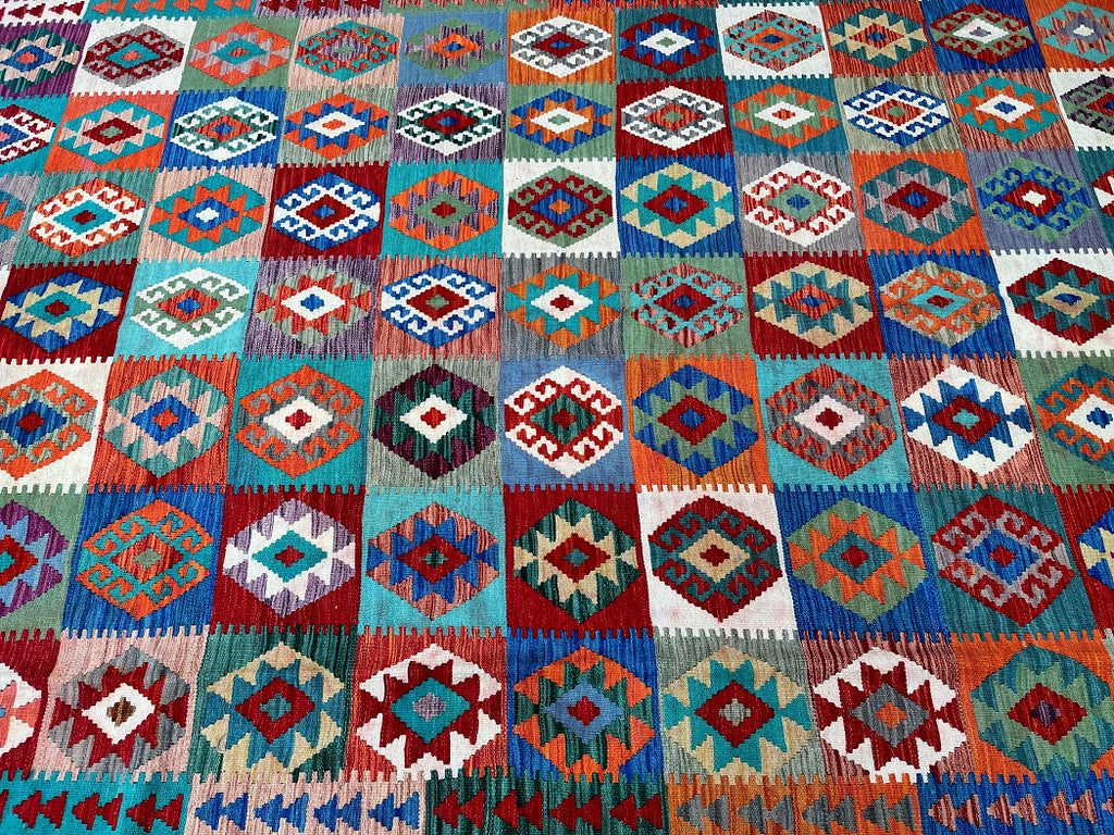 This impressive Afghan Kyber Kilim rug is a true statement piece, especially considering its massive room size. It is quite rare to come across boho kilim rugs in such large dimensions, making it a unique find. The rug features a pure hand-spun wool pile meticulously woven onto a cotton base, ensuring both comfort and durability. The vibrant multi-color tones are achieved through dyeing with vegetable roots, adding an organic touch to the rug. The design showcases a compartmental geometric tribal pattern, which is both modern and decorative, renowned as Bohemian style. The level of craftsmanship involved is remarkable, as it would have taken a skilled weaver approximately 2-3 months to complete this piece. Hand-woven in Afghanistan by a nomadic weaver, this rug measures 436 x 300 cm and holds a gallery replacement value of $4290.