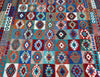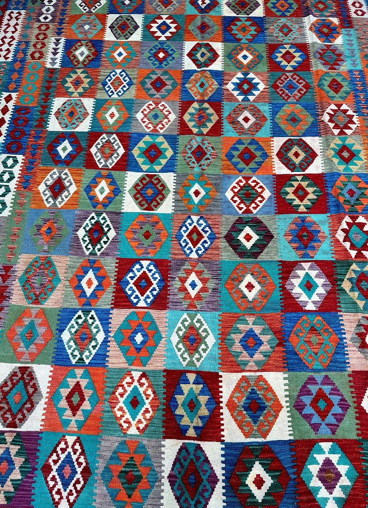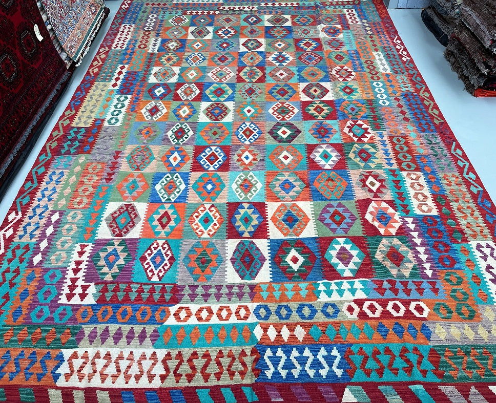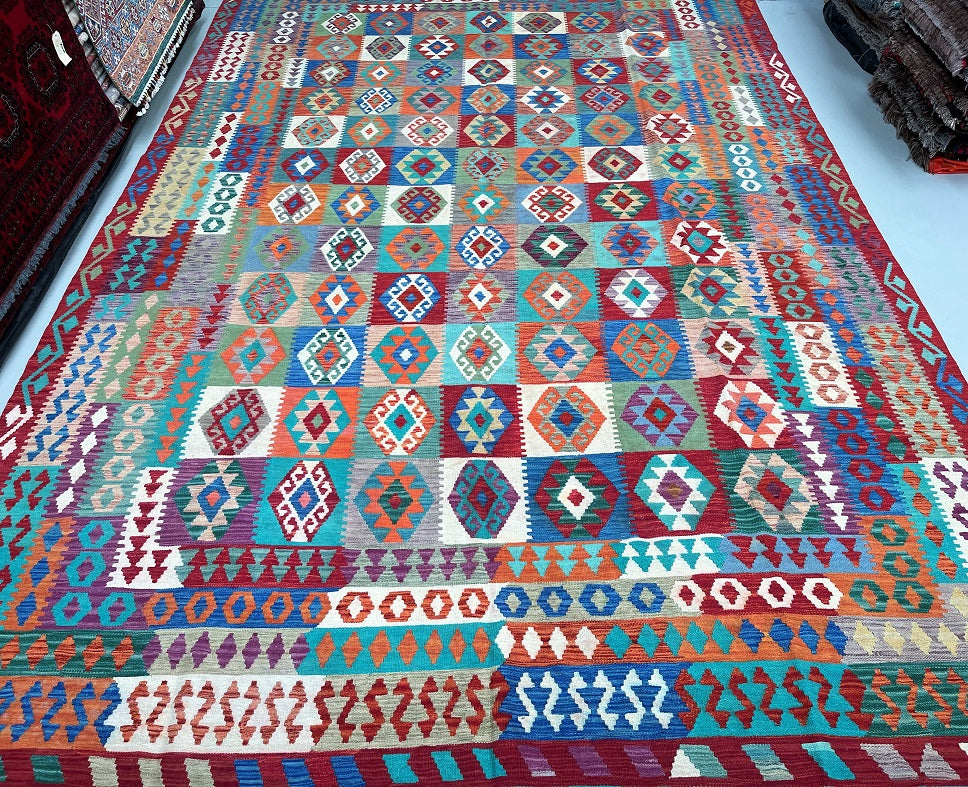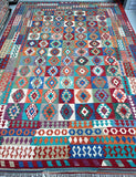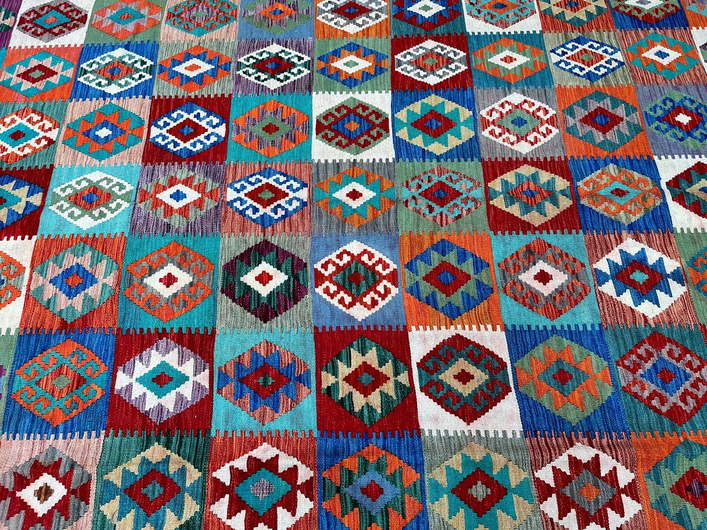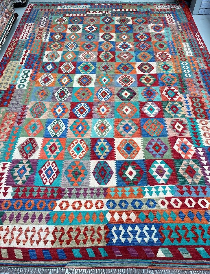 This impressive Afghan Kyber Kilim rug is a true statement piece, especially considering its massive room size. It is quite rare to come across boho kilim rugs in such large dimensions, making it a unique find. The rug features a pure hand-spun wool pile meticulously woven onto a cotton base, ensuring both comfort and durability. The vibrant multi-color tones are achieved through dyeing with vegetable roots, adding an organic touch to the rug. The design showcases a compartmental geometric tribal pattern, which is both modern and decorative, renowned as Bohemian style. The level of craftsmanship involved is remarkable, as it would have taken a skilled weaver approximately 2-3 months to complete this piece. Hand-woven in Afghanistan by a nomadic weaver, this rug measures 436 x 300 cm and holds a gallery replacement value of $4290.