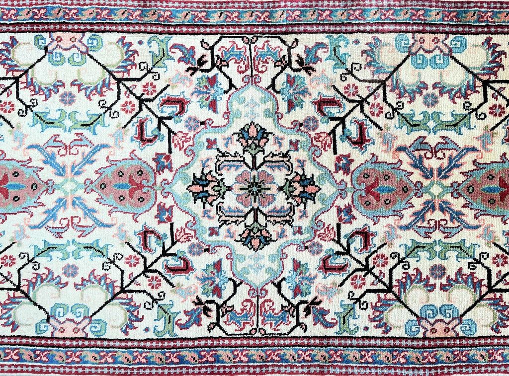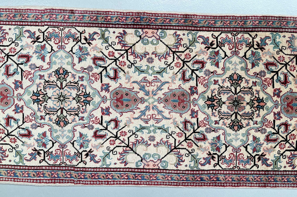 Rare Authentic Handmade Persian Heriz Hall Runner. Above Has A Pure Hand Spun Wool Pile On Cotton Base. Beige, Pink, Light Blue, Maroon Red, Green And Black Tone Dyed Using Traditional Methods.