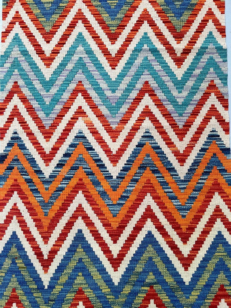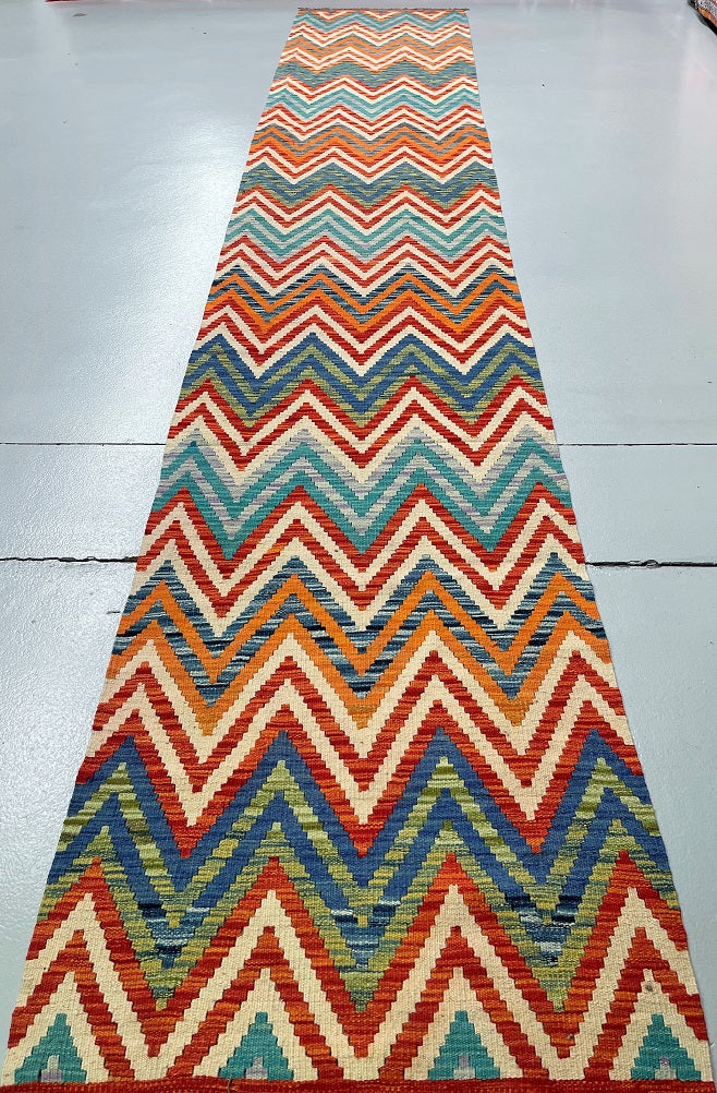 Decorative Oversize Boho Design Hand Woven Afghan Tribal Aryana Kilim Hall Runner. Above All It Has A Pure Hand Spun Wool Pile On Wool Base. Vibrant Tone Dyed Using Traditional Methods.
