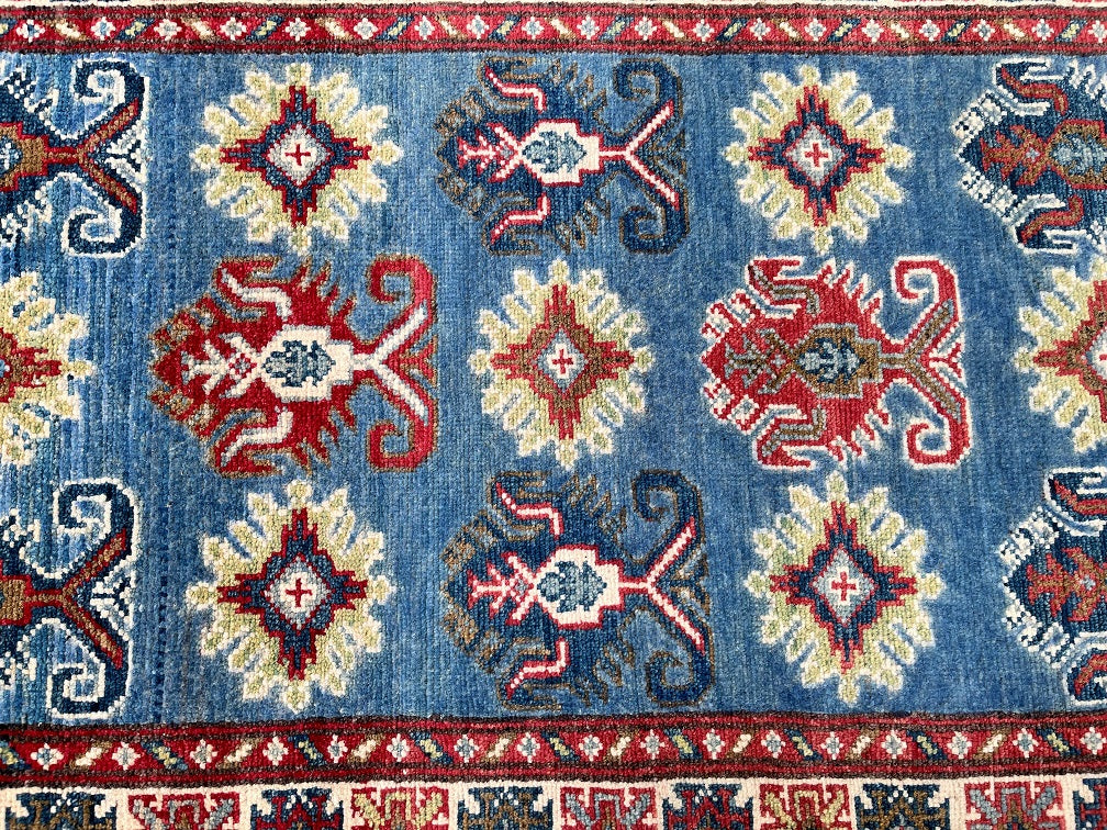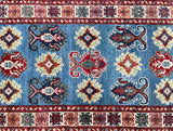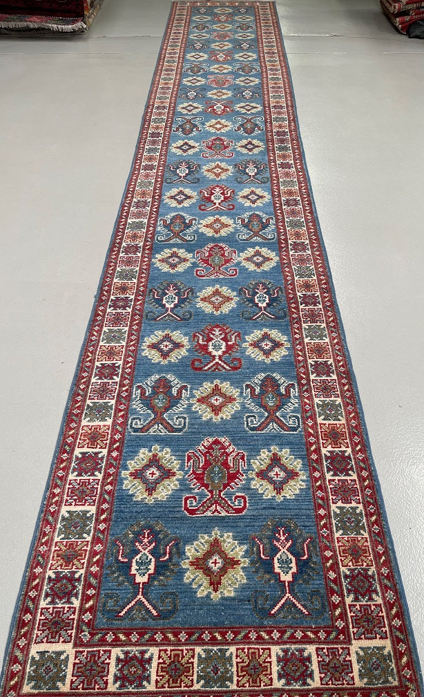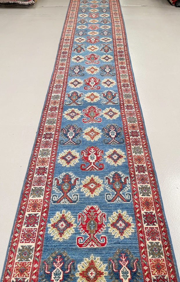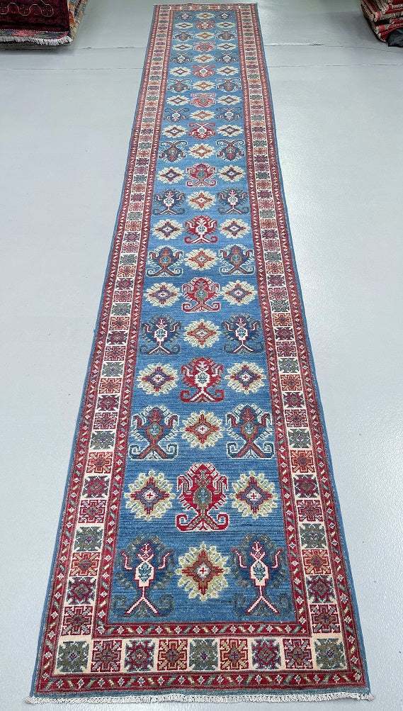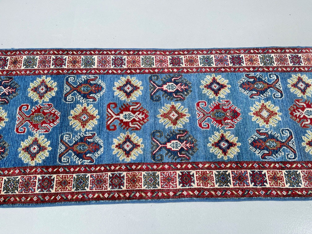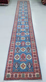 Oversize Authentic Handmade Afghan Kazak Hall Runner. Above All It Has A Pure Hand Spun Wool Pile On Cotton Base. Light Blue Tone Dyed Using Traditional Methods (Vegetable Dyes). Last of True Woven Tribal Art.