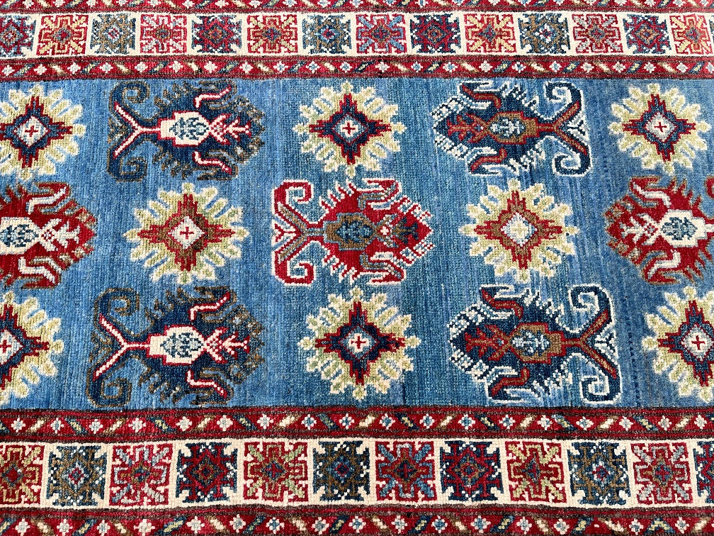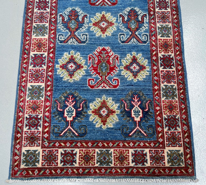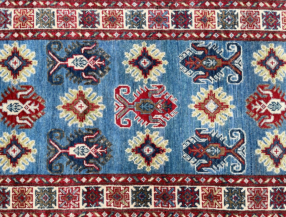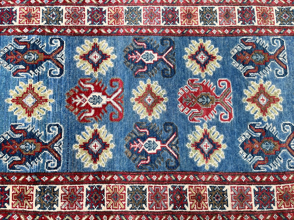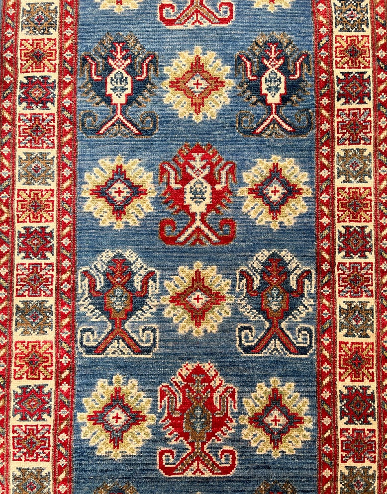 Oversize Authentic Handmade Afghan Kazak Hall Runner. Above All It Has A Pure Hand Spun Wool Pile On Cotton Base. Light Blue Tone Dyed Using Traditional Methods (Vegetable Dyes). Last of True Woven Tribal Art.