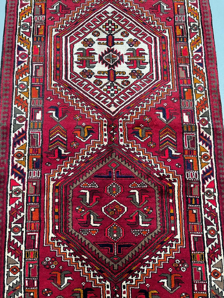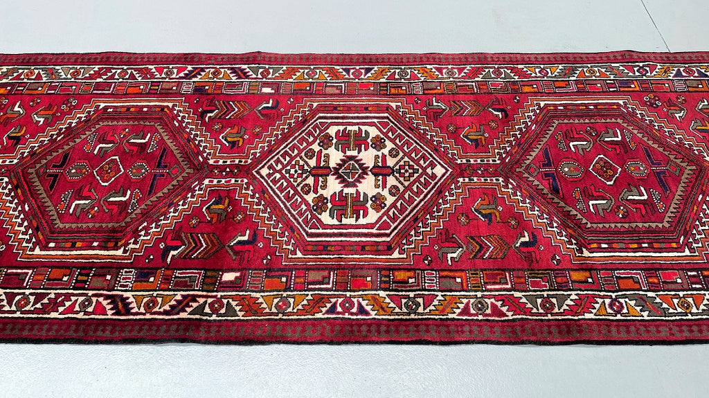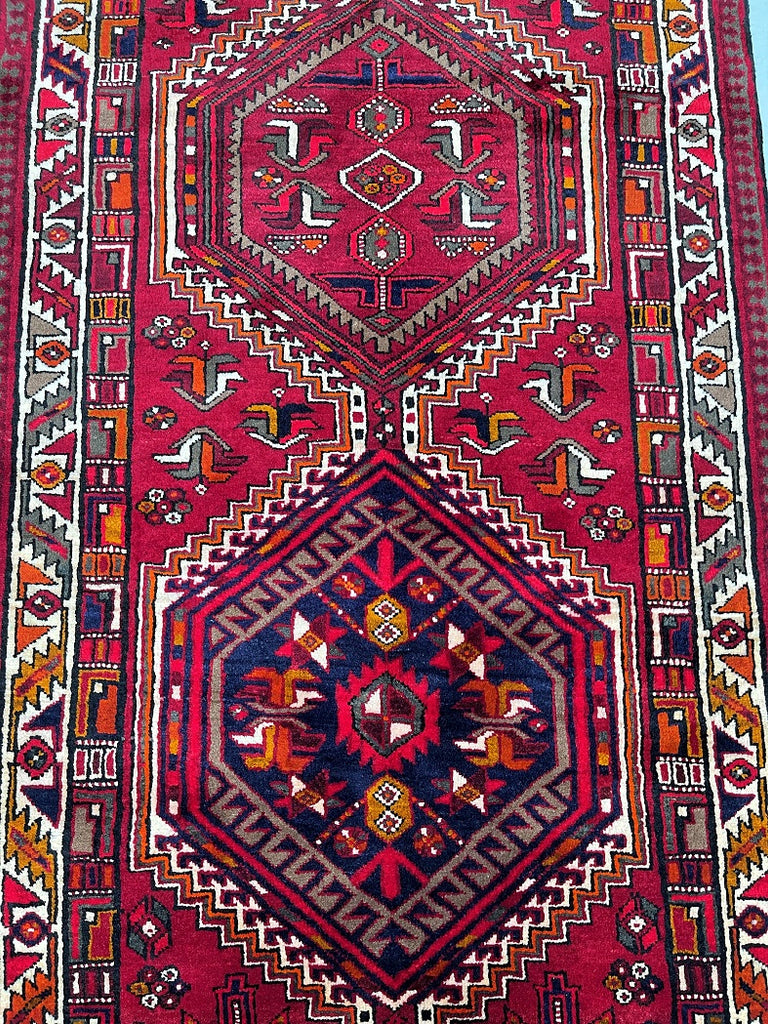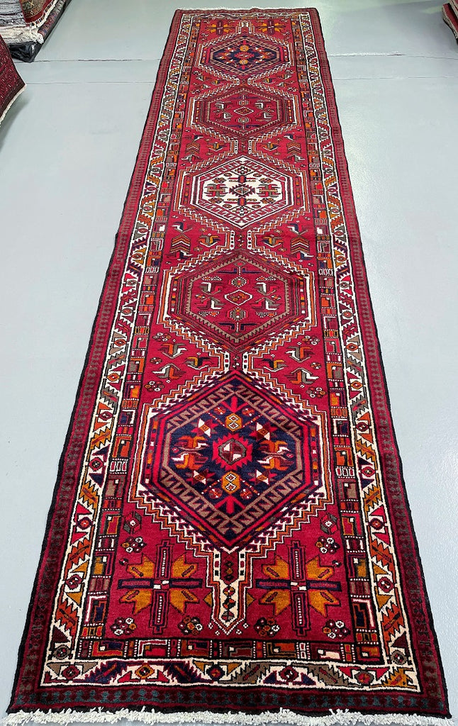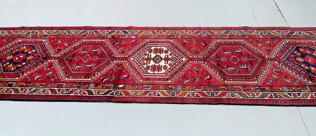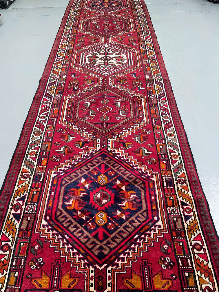 Dense Quality Authentic Handmade Persian Heriz Wide Hall Runner. Above All It Is Hard To Find Runners Over 4m Long. It Has A Pure Hand Spun Wool Pile On Cotton Base. Red, Blue, Beige, Black, Brown, Mustard, Orange, Green And Pink Tone Dyed Using Traditional Methods.