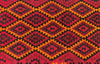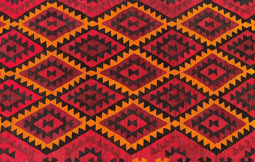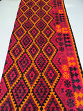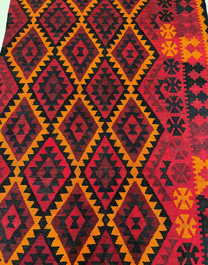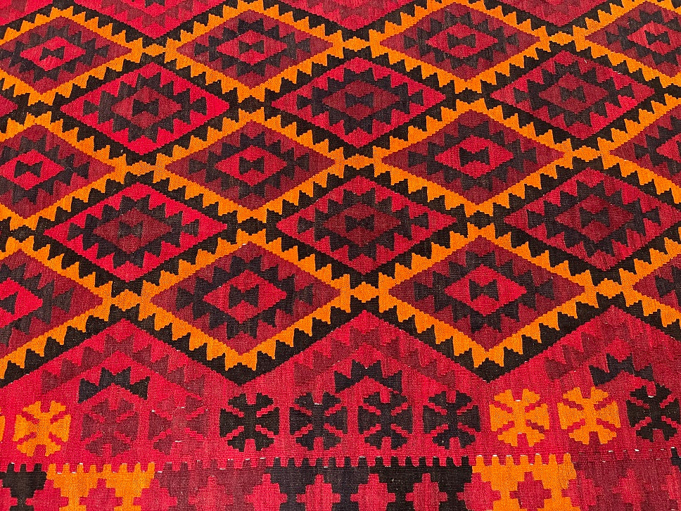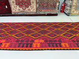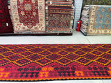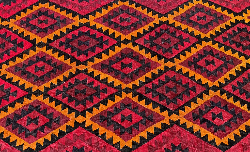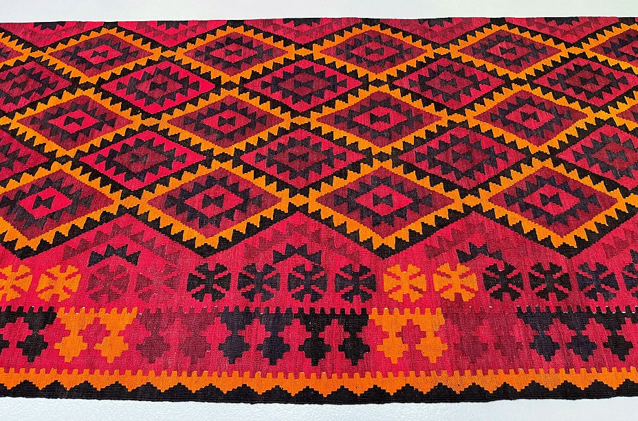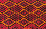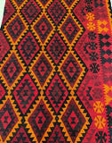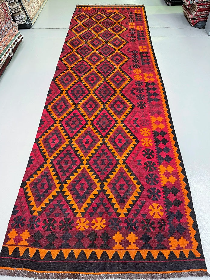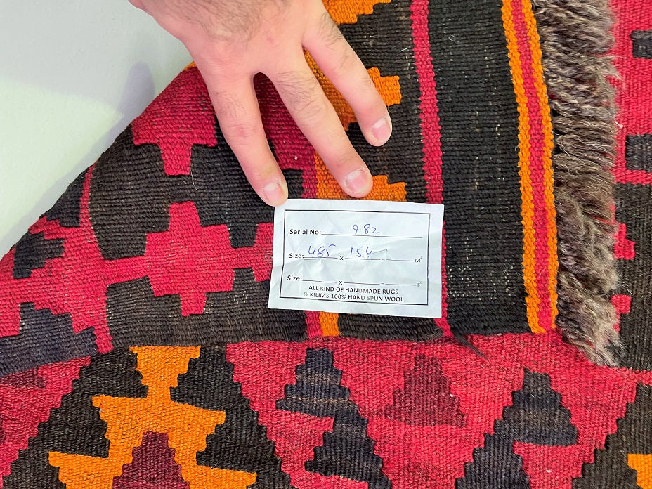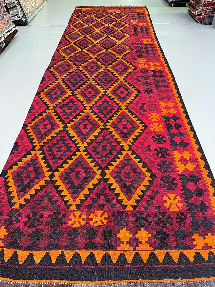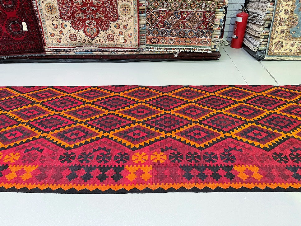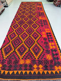 Vintage Tribal Design Hand Woven Afghan Meymaneh Kilim Hall Runner, a perfect choice for wide corridors. This exquisite rug features a pure hand-spun wool pile on a wool base, ensuring its quality and durability. The vibrant colors of red, black and orange are achieved through traditional dyeing methods. Its allover geometric tribal design adds a touch of charm to any space. It is worth noting that this piece required approximately 1 month of dedicated weaving by a skilled weaver. Hand-woven in Afghanistan by a nomadic weaver, this hall runner measures 485 x 154 cm and holds a gallery replacement value of $1990.