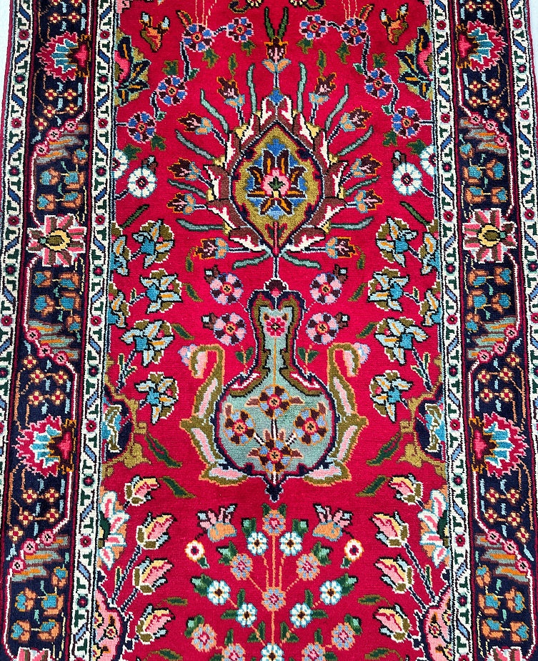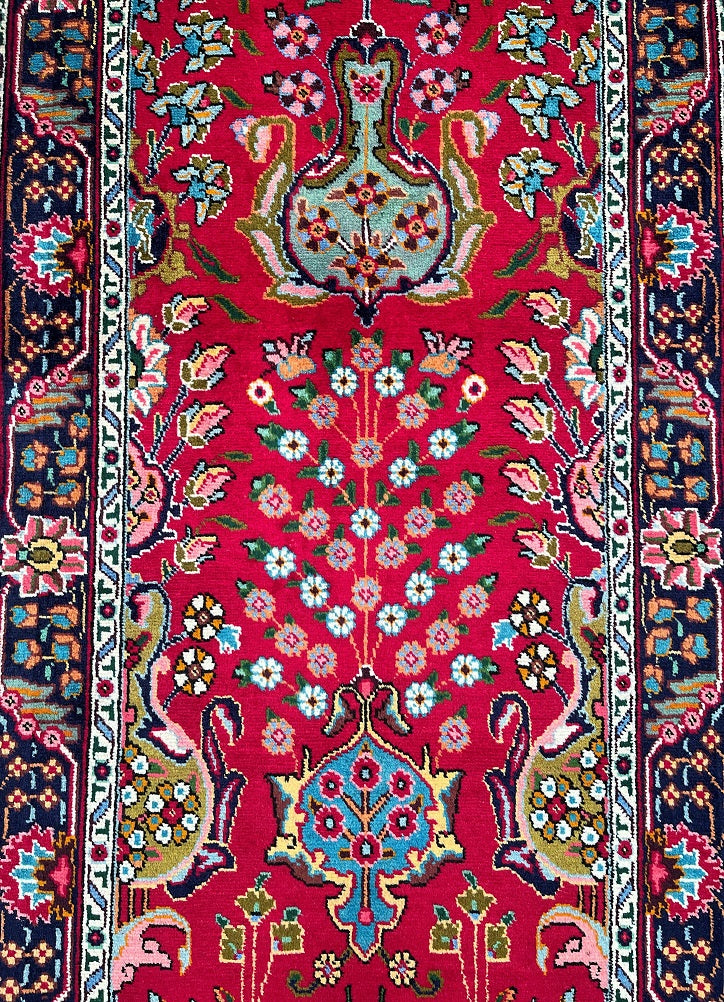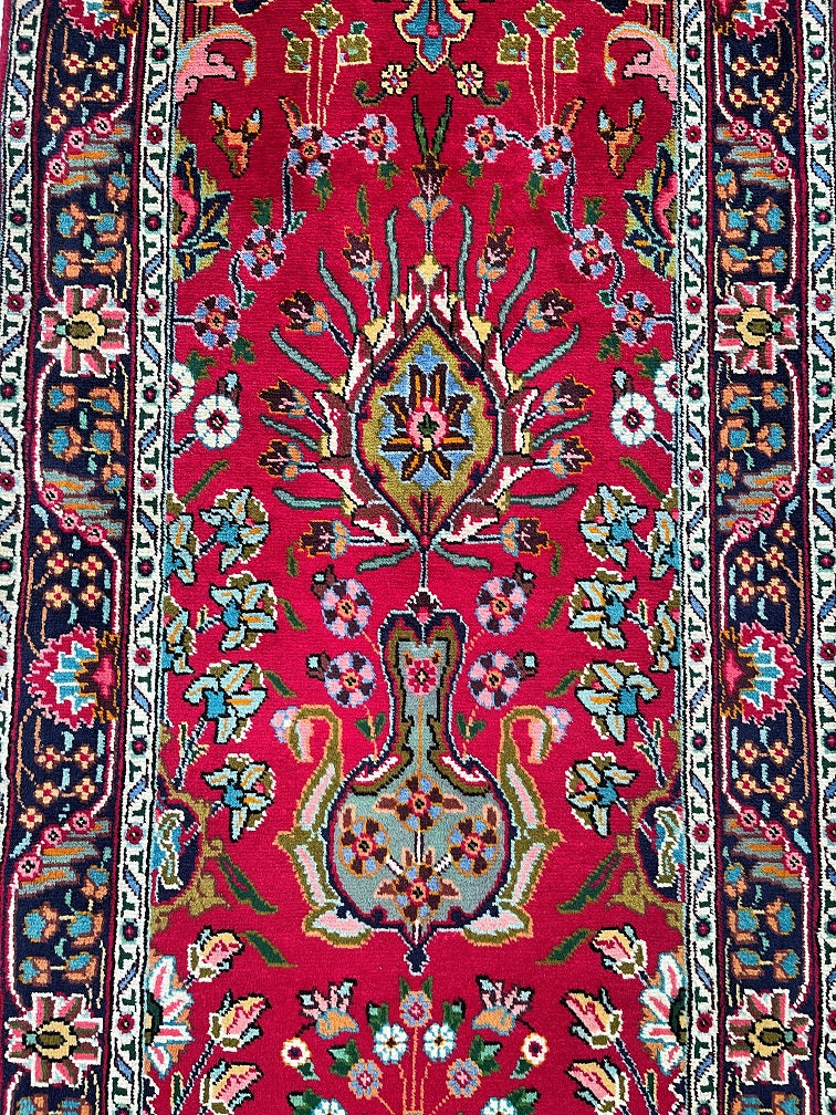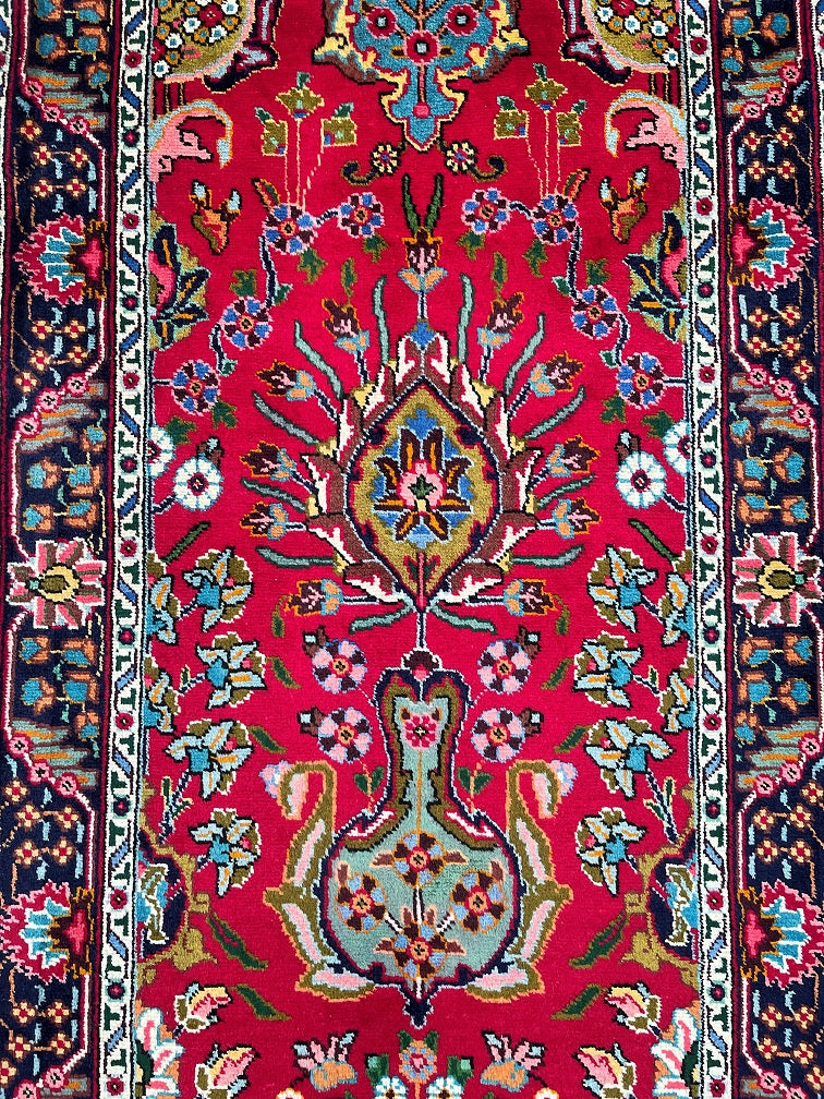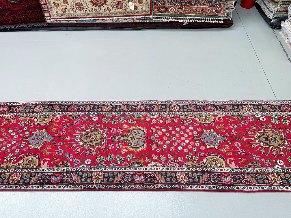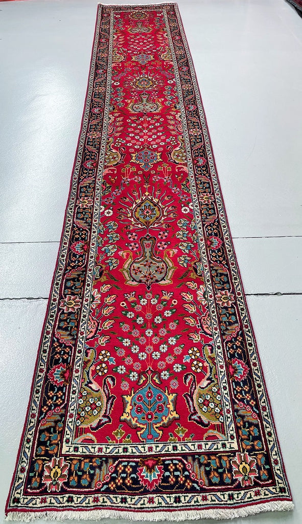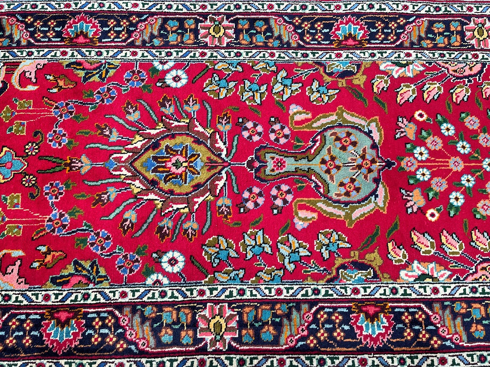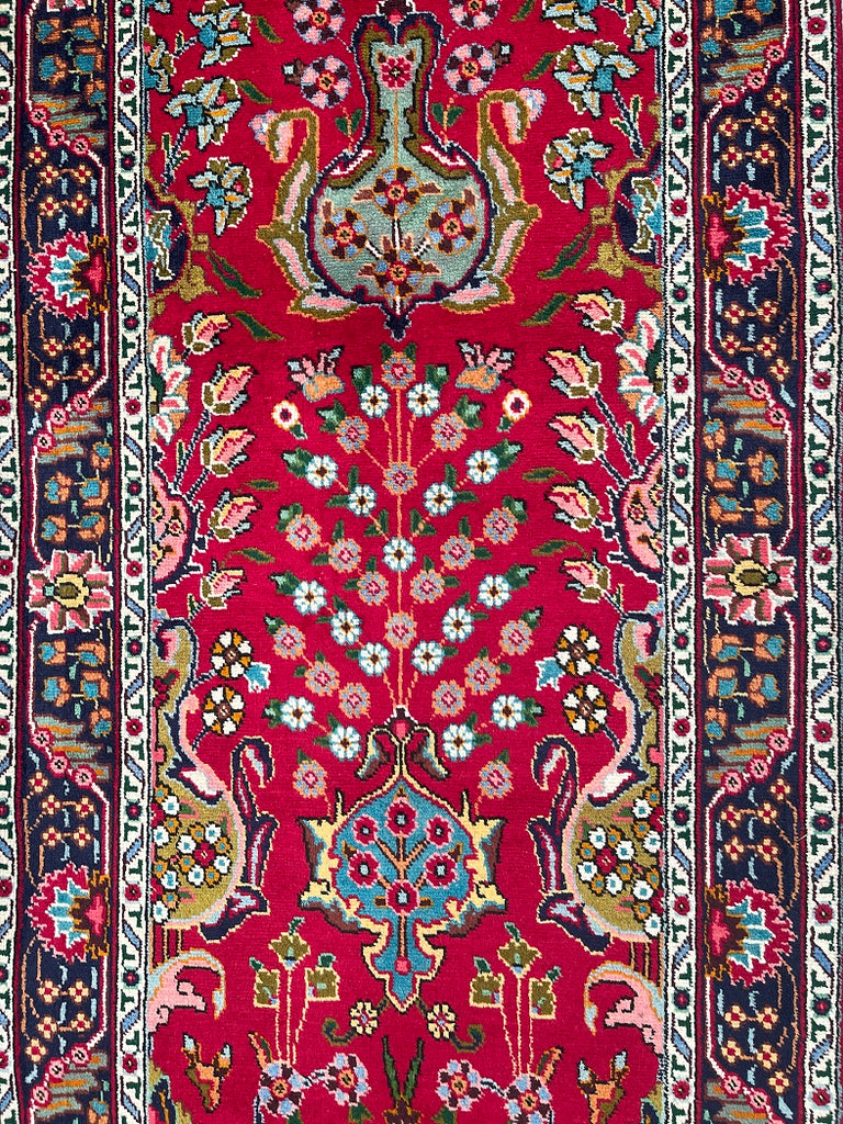Rare Authentic Handmade Vintage Persian Tabriz Hall Runner. Above All We Do Have This Runner In A Matching Pair. It Also Has A Lamb’s Wool Pile On Fine Cotton Base. Red, Indigo Blue, Beige, Green And Pink Tone Dyed Using Traditional Methods.